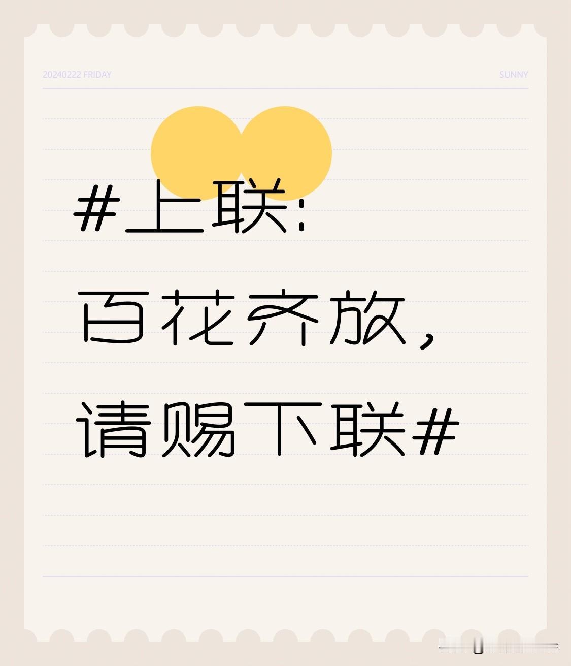 看到“百花齐放”这个上联,我一下就想到了绝配下联“万马奔腾”。“百花”是植物的繁盛之景,“万马”是动物的奔涌之态,一个春意盎然,一个气势如虹,画面感直接拉满。 从数量词看,“百”对“万”,都是虚指极多,有夸张又豪迈的节奏感。“齐放”充满生命力,“奔腾”满是力量感,一静一动相得益彰。而且“百花齐放”象征繁荣多元,“万马奔腾”寓意事业腾飞。 其他下联像“百家争鸣”偏书面,“万象更新”“千帆竞发”对仗稍弱。所以“万马奔腾”最工整有气势,当对联超合适。