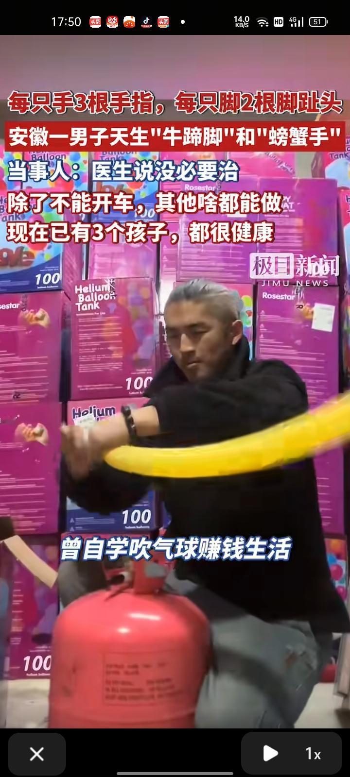 12月10日,亳州市利辛县。男子天生带“牛蹄脚”和“螃蟹手”,不影响正常生活,除了不能开汽车。 当事人李先生表示,现在娶妻生子,生了三个小孩,都很健康,医生说没必要治疗。目前在做氦气生意,蹭自学吹气球赚钱生活,可以吹几百种造型。