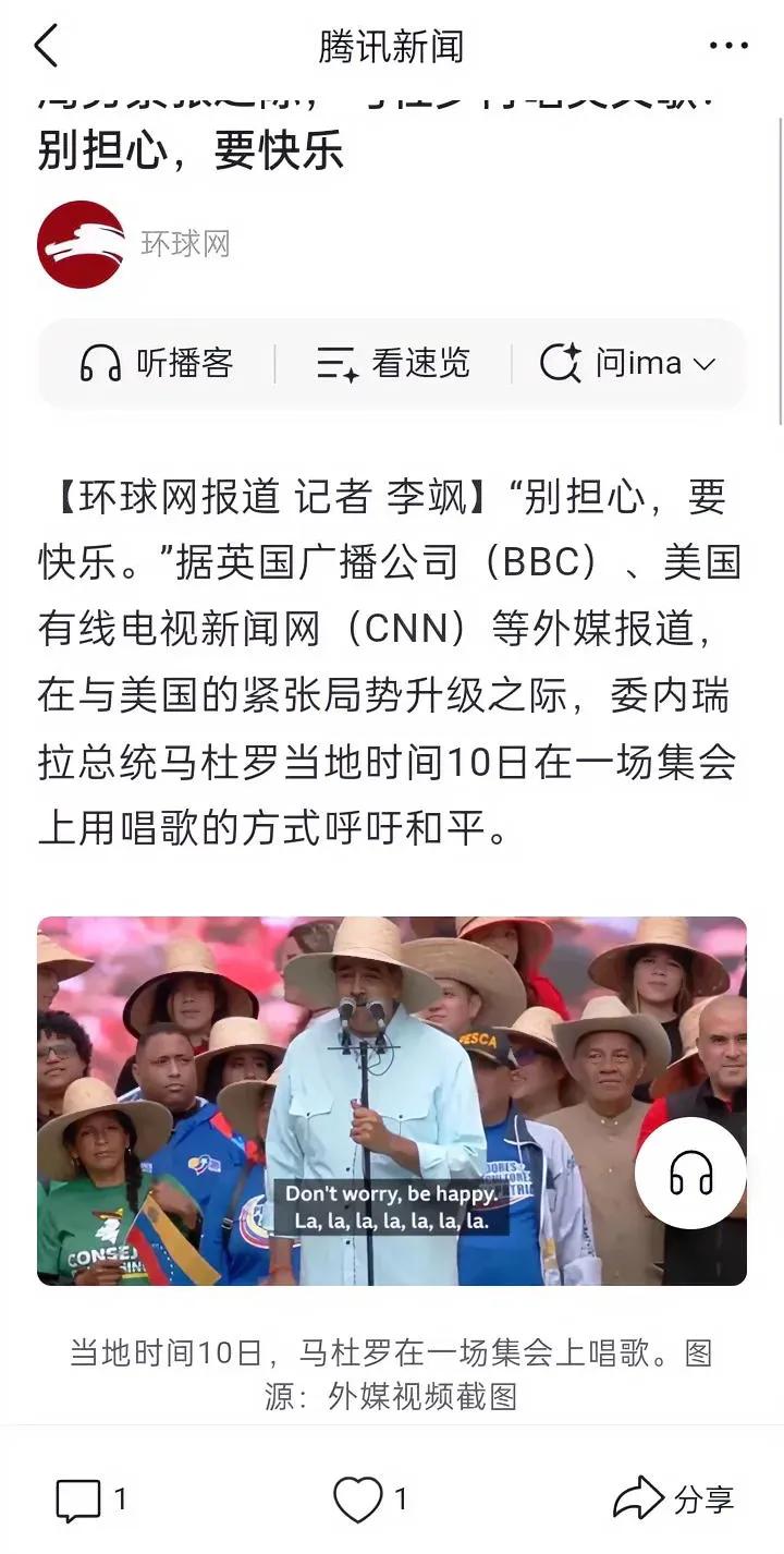 歌声怼霸权!马杜罗两唱英文经典反战,回应美国扣押油轮+80人死亡 一边是军舰围堵、油轮被抢,一边是歌声传和平!当地时间12月10日,委内瑞拉总统马杜罗在集会现场硬核回应:“对反对战争的美国公民,我用一首歌回应——别担心,要快乐”,随后用英文唱起《Don't worry,be happy》的经典旋律 。 而这已是他近期第二次用歌声呼吁和平!11月15日,马杜罗就在米兰达州集会上唱响约翰·列侬的《想象》,直斥美国在加勒比海的军事部署“不负责任”,呼吁停止干涉拉美事务 。 歌声背后,是步步紧逼的军事威胁:当天特朗普高调宣布,美军在委附近海域扣押“迄今最大油轮”,还放话“要留下船上石油”,美军武装人员甚至直升机空降登船搜查 。委外长怒斥这是“国际海盗行为”,而这只是美国施压的冰山一角——以“缉毒”为幌子,美军9月以来已击沉20多艘所谓“贩毒船”,造成80余人死亡,可美国缉毒署自己都承认,委内瑞拉根本不是美国毒品主要来源地! 更讽刺的是,美军所谓“扫毒”连自己人都质疑:航母打击群逼近、联合军演施压、扣押油轮掠夺资源,美国的真实意图早已暴露——借“缉毒”之名行政权更迭之实,推行霸权扩张 。 当马杜罗用两首英文歌曲跨越语言呼吁和平,对抗的是军舰、导弹与双重标准。霸权之下,歌声或许微弱,但那句“别担心,要快乐”,更像对强权的嘲讽:和平从不是忍出来的,而靠每一次对干涉的坚定说不!