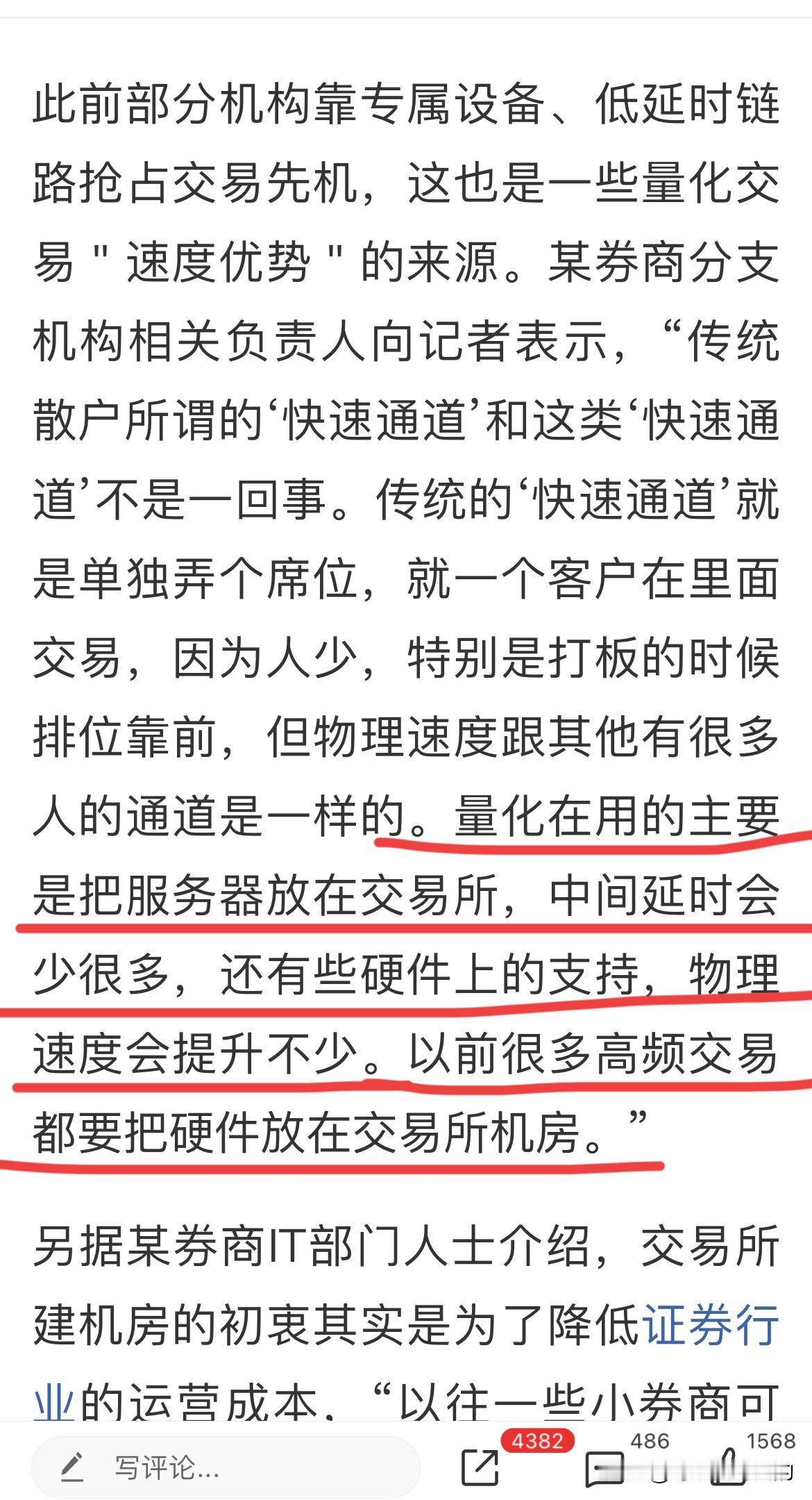量化把服务器直接放在交易所? 我的个老天爷,这还让散户怎么玩? 本来量化的速度就已经够快了,现在直接把设备放到交易所,延时缩短,快上加快! 这就好比同一个泉眼喝水,散户还在山下等着喝水呢,量化直接一根管子插进泉眼里坐在边上喝起来了! 希望这则传言是真的吧,好好管管量化!