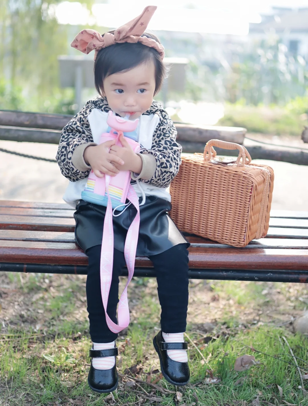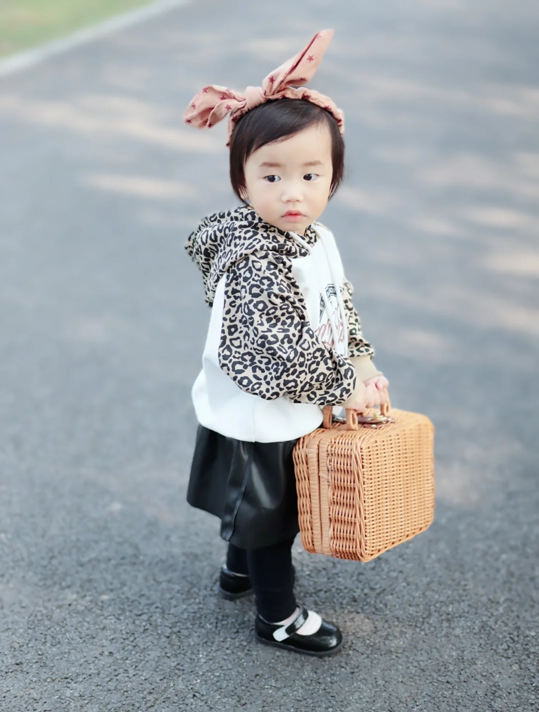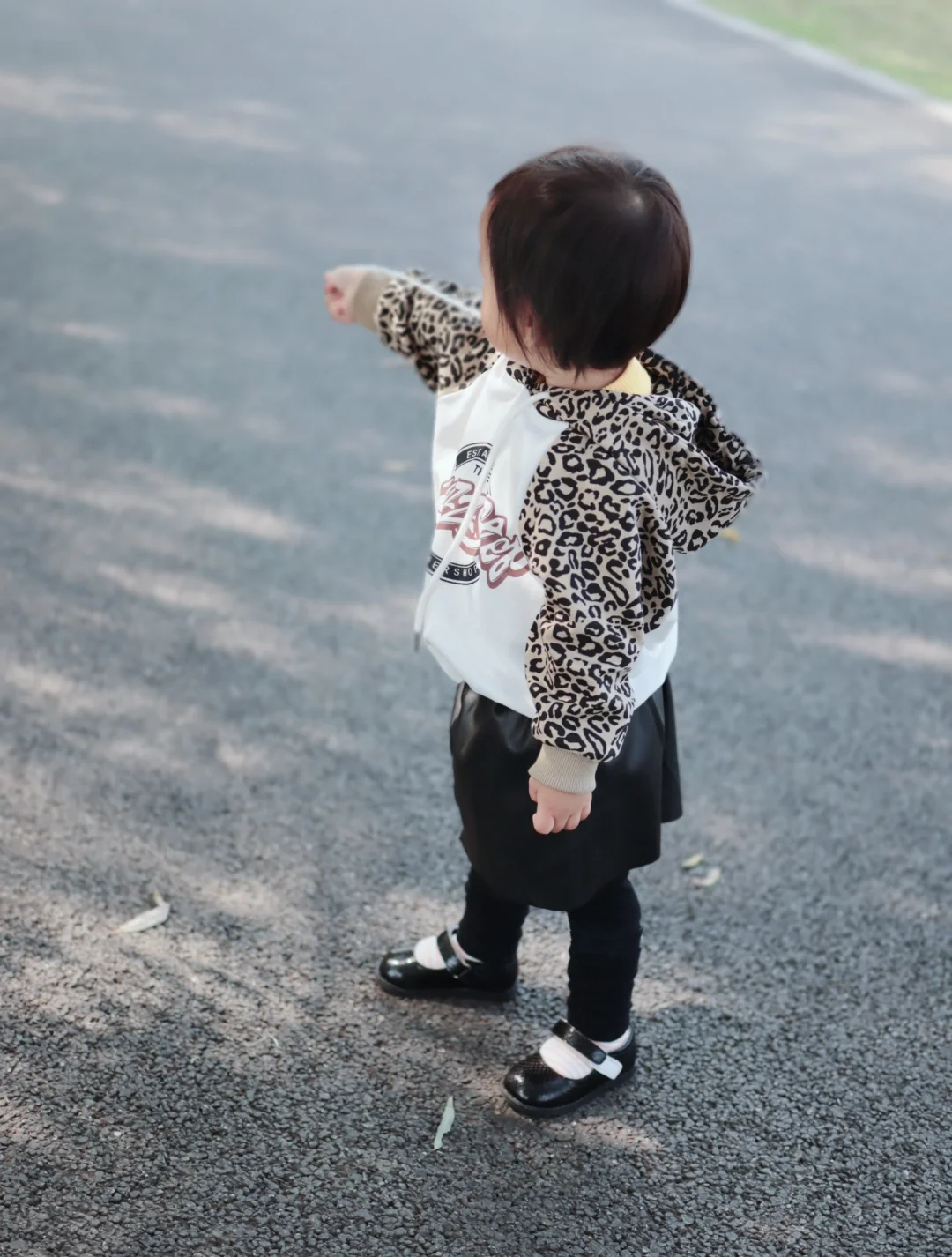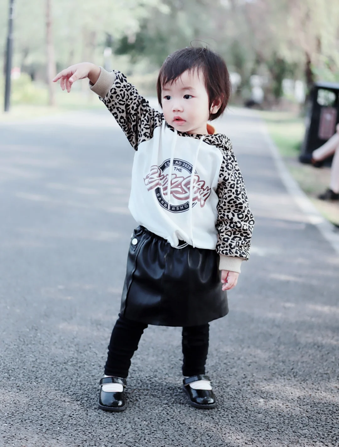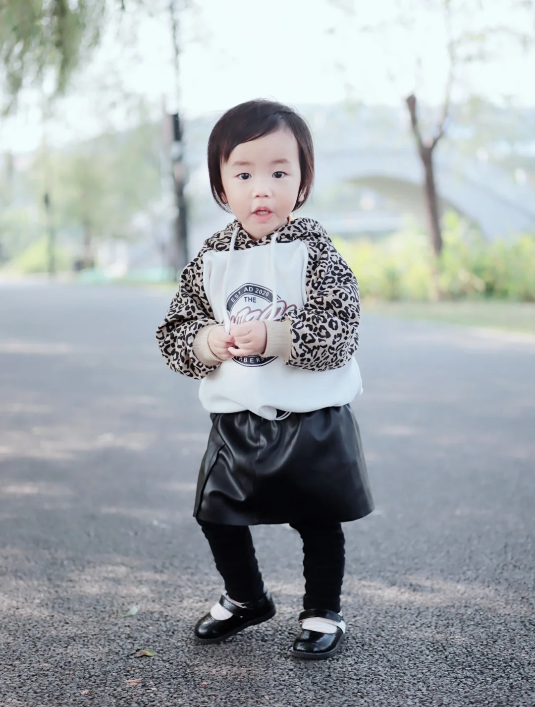 还好这两天天气又暖和了,可以秀一秀给Cyndi才入手的秋装,第①次给她尝试豹纹卫衣和小皮裙,搭个黑色小皮鞋,没想到效果还不错,哈哈😄因为天气冷了,给她穿了条打底裤,不然光着腿穿袜子也hin好看的~