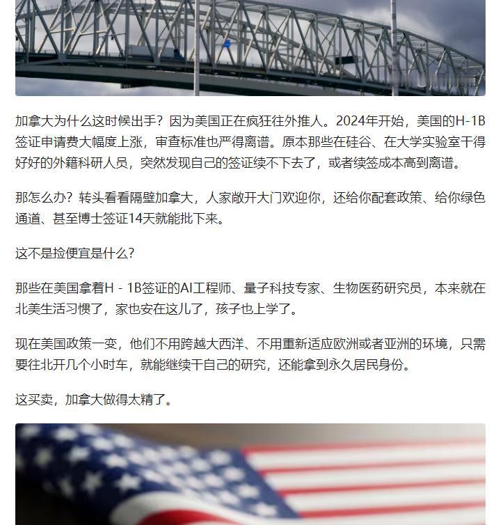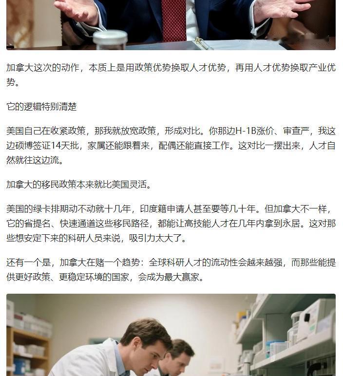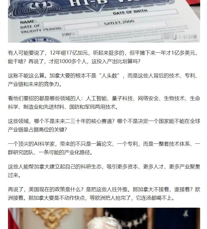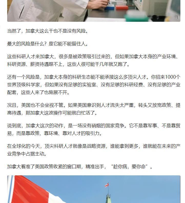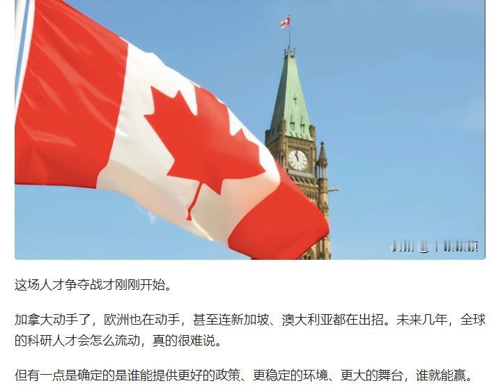 加拿大启动 12 年 17 亿加元的 “全球影响力 + 科研人才计划”,以宽松签证、快速永居等政策精准挖美国墙角,瞄准核心科研领域,意图借人才优势提升产业竞争力,同时面临留人及科研生态承接等风险。 原文来自头条创作者牛顿顿顿的文章: