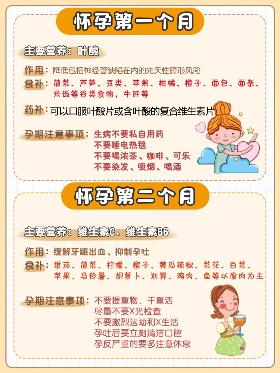 1. 叶酸可以预防胎儿神经管畸形等出生缺陷,孕前3个月就要开始补充叶酸,它需要在体内累积,可以吃绿叶蔬菜以及坚果、水果类食物等