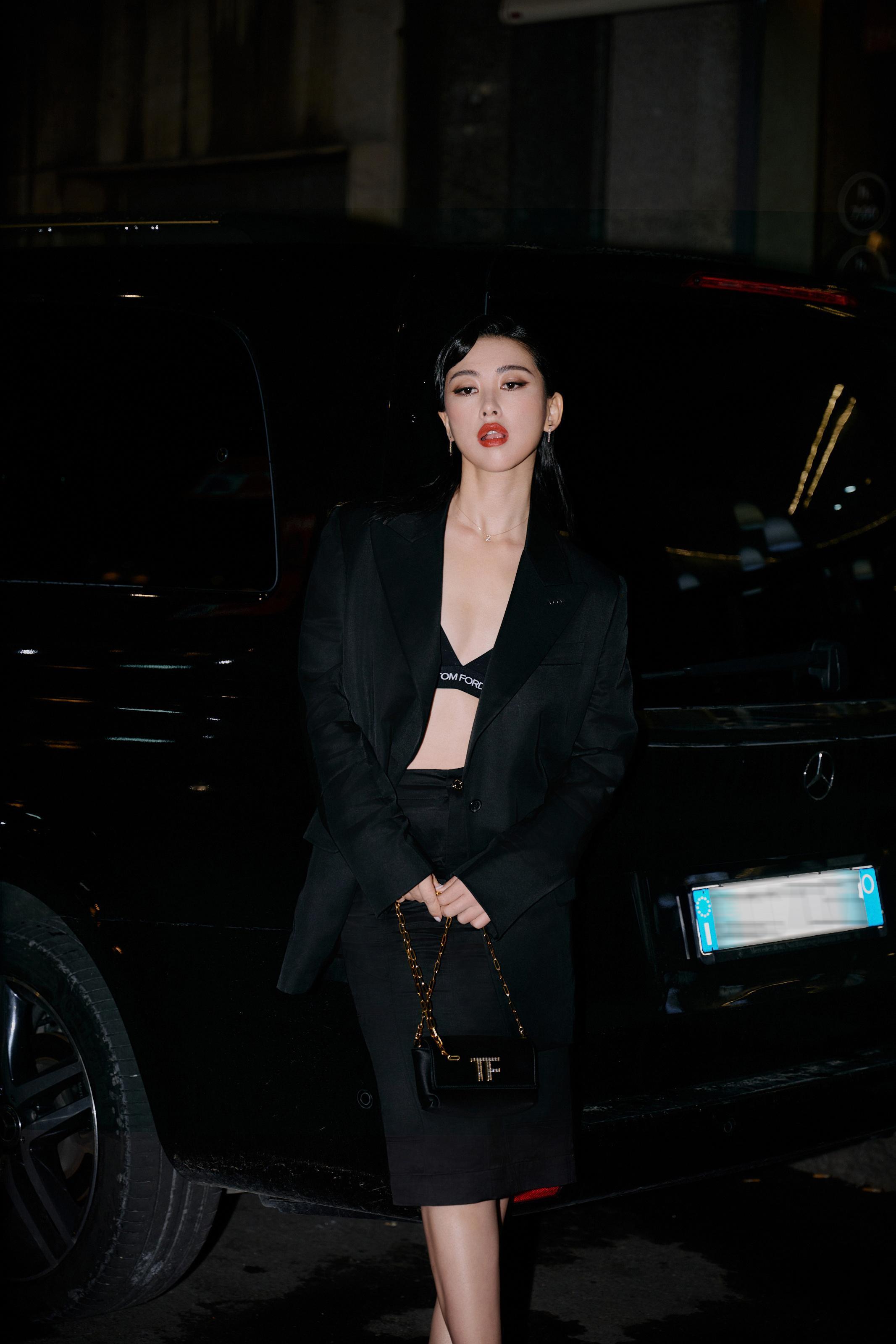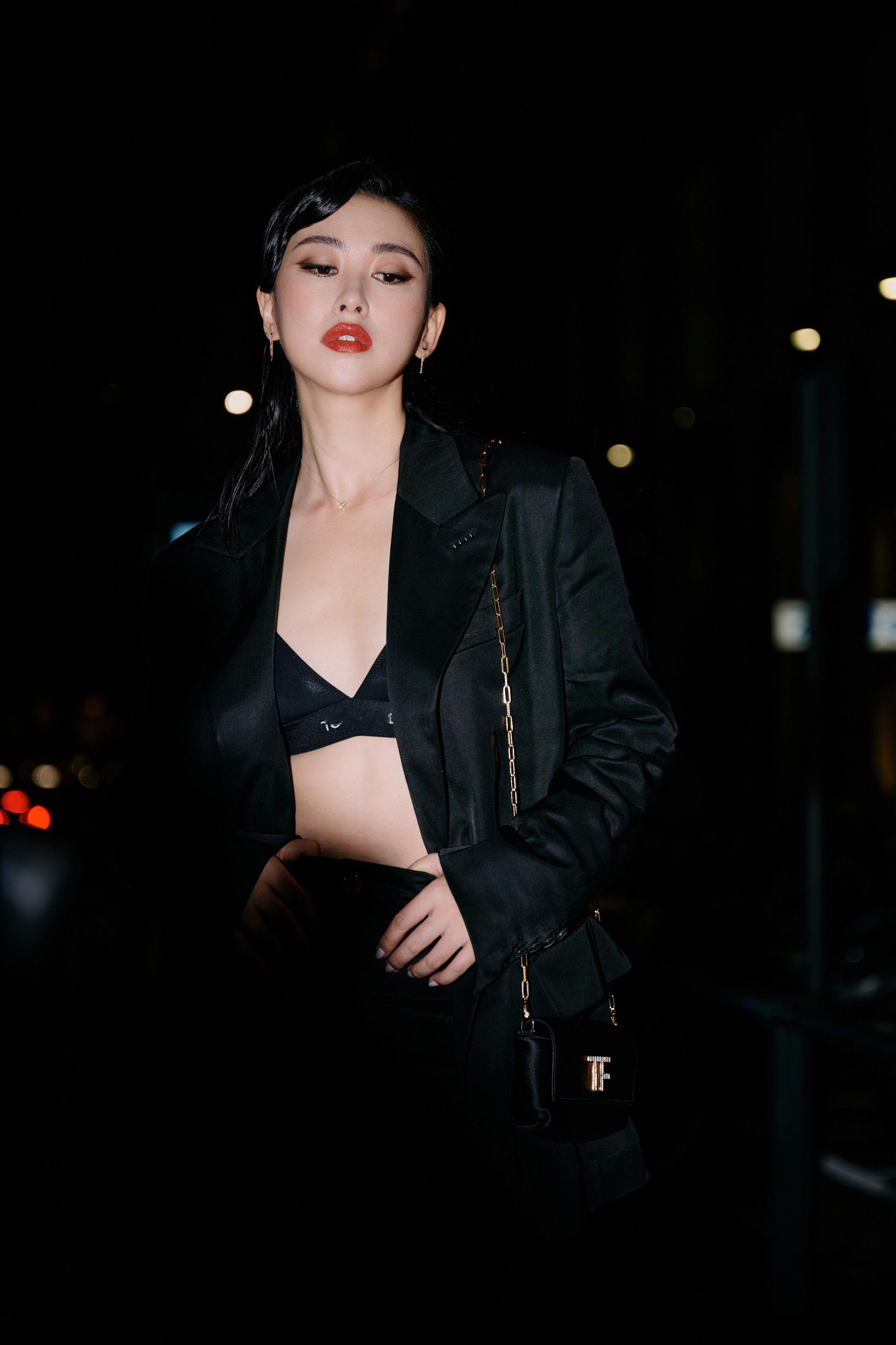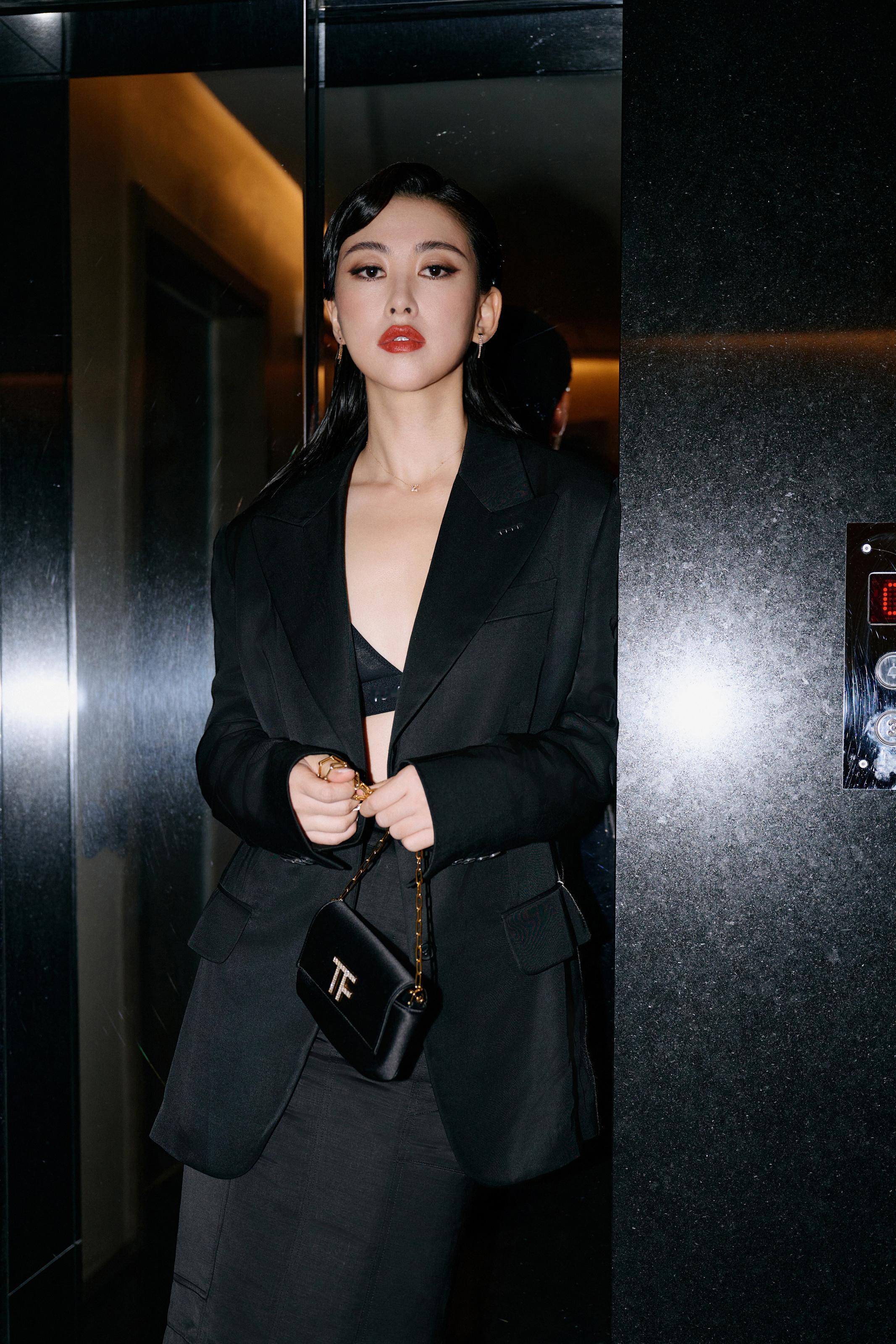 朱珠,这套红唇黑衣妆造,酷美十足。朱珠