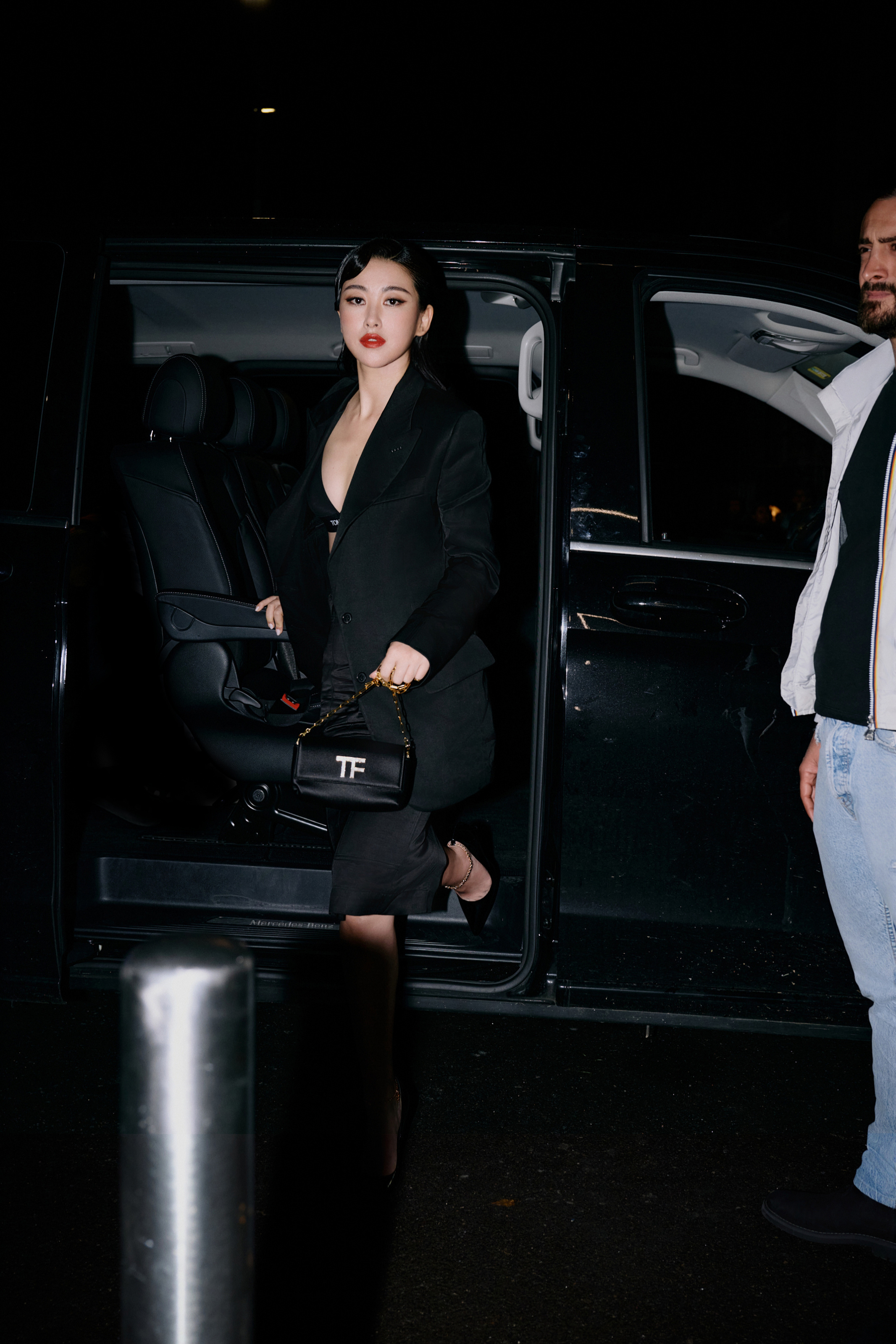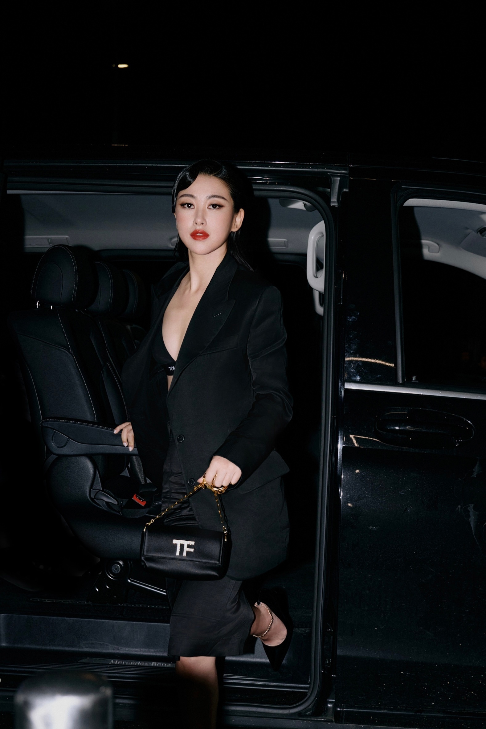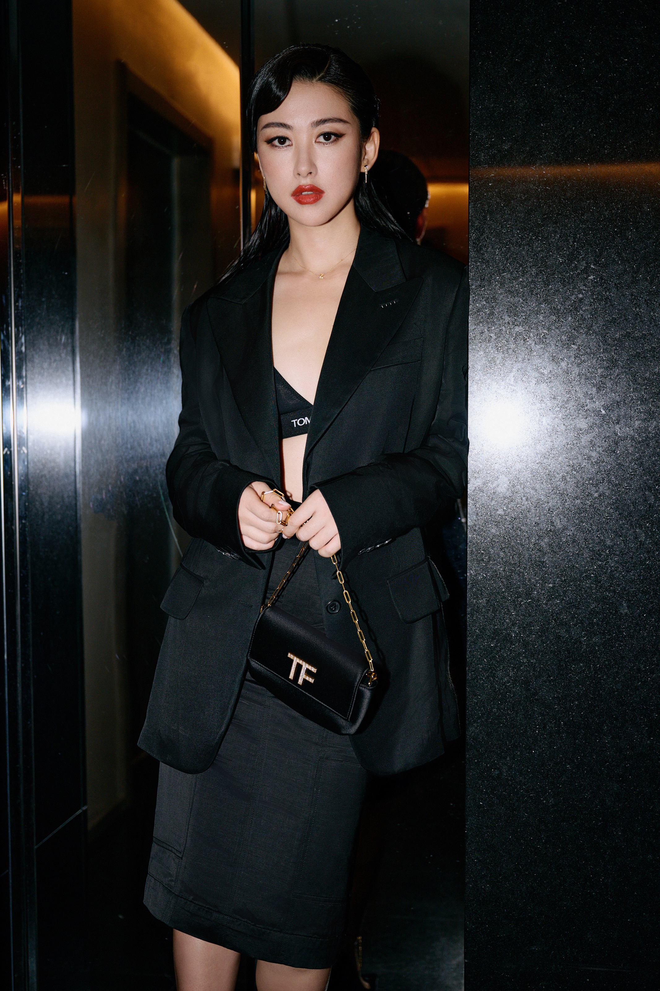 朱珠,这套红唇黑衣妆造,酷美十足。朱珠