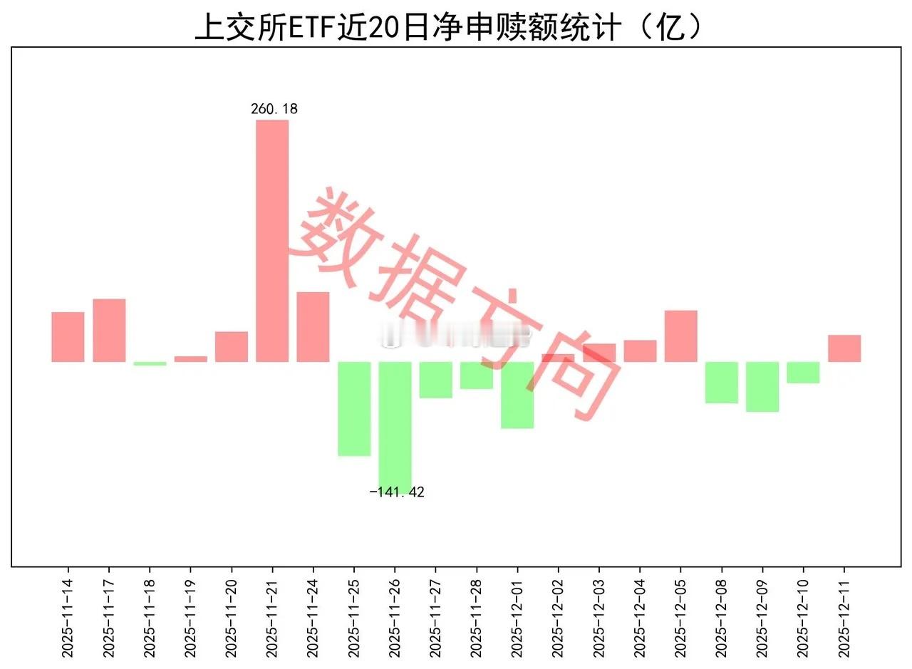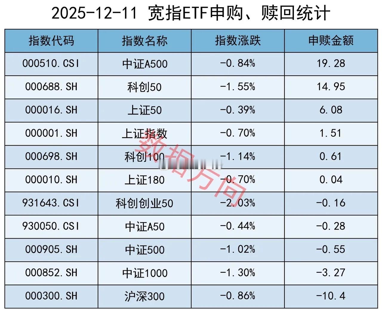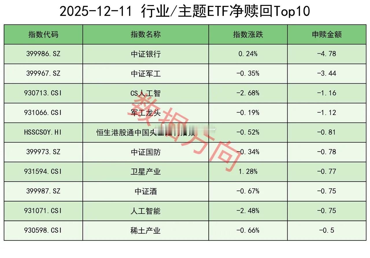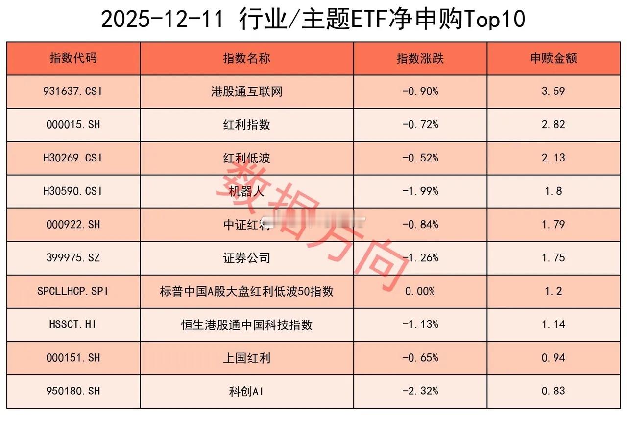 ETF结束三连赎,转为净申购12月11日星期四,大盘全天震荡下行,31个申万一级行业仅有银行逆市飘红。上证指数跌幅0.70%,上交所ETF合计净申购 29.15亿元。结束了连续三天净赎回之势。宽指中证A500指数(19.28亿)、科创50指数(14.95亿),双双净申购超过10亿。上证50指数(6.08亿),净申购超过5亿。上证指数(1.51亿)、科创100指数(0.61亿)、上证180指数(0.04亿),分别获得小幅净申购。沪深300指数(-10.4亿),净赎回超过10亿中证1000指数(-3.27亿)、中证500指数(-0.55亿)、中证A50指数(-0.28亿)、科创创业50指数(-0.16亿),分别被小幅净赎回。行业和主题 港股通互联网指数(3.59亿)、恒生港股通中国科技指数(1.14亿),一起进入申购榜。红利指数(2.82亿)、红利低波指数(2.13亿)、中证红利指数(1.79亿)、标普中国A股大盘红利低波50指数(1.2亿)、上国红利指数(0.94亿),5个红利指数一起进入申购榜,大盘下跌的时候,资金有避险需求。科创AI指数(0.83亿),进入申购榜;CS人工智指数(-1.16亿)、人工智能指数(-0.75亿),一起进入赎回榜。其他进入申购榜的还有:机器人指数(1.8亿)、证券公司指数(1.75亿)。中证银行指数(-4.78亿)逆市上涨,却净赎回最多,说明资金拉的是股票,股票比ETF值钱。中证军工指数(-3.44亿)、军工龙头指数(-1.12亿)、中证国防指数(-0.78亿)、卫星产业指数(-0.77亿),一起进入赎回榜。其他进入赎回榜的还有:恒生港股通中国央企红利指数(-0.81亿)、中证酒指数(-0.75亿)、稀土产业指数(-0.5亿)。ETF财经股票