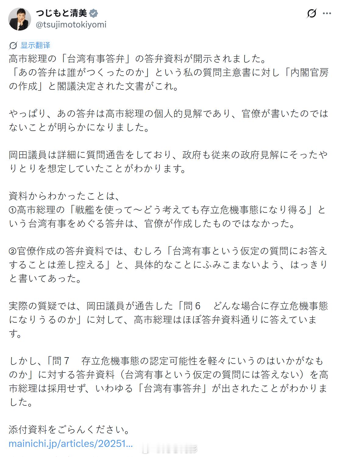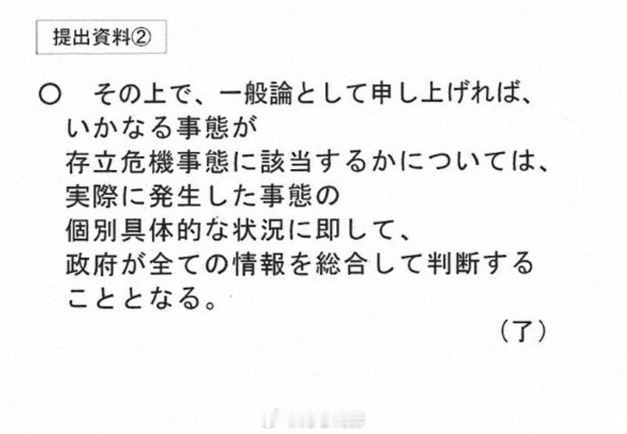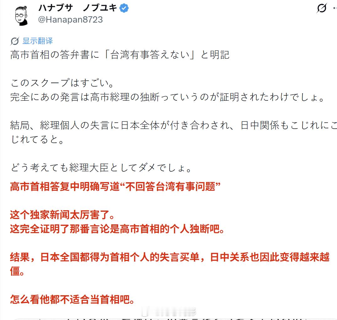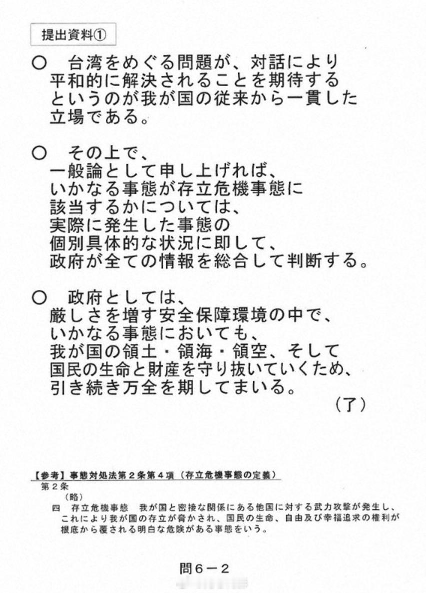 日本媒体曝光,称高市早苗闯祸的那句涉台言论,是她自己说瓢了嘴。根据日媒昨晚公布的11月7日国会答辩资料,事先给高市早苗准备好的答辩资料中,并没有高市早苗说的那句涉台言论。这些资料是在答辩之前,对方把问题交给高市早苗这边,然后高市一方准备好答辩资料,到了答辩时照着念就行了,而且相关答辩资料还明确提示了“不要回答台湾事态的问题”。该答辩资料是日本政府应立宪民主党参议员辻元清美的质询要求书,向其公开的。辻元议员在评论此事时说:“查看答辩资料后发现,日本政府一直在不超越历代首相答辩方针的范围内妥善应对。特别是关于台湾有事,尽管资料中明确写明对于假设性问题不予回答,但首相却阐述了其一贯的个人主张。果然还是应该充分基于历代政府的想法,再稍微谨慎地进行答辩才对吧。”但回答辻元的内阁官房负责人就高市早苗当时说的 “只要涉及武力行使,就可能构成存亡危机事态” 等答辩强调(狡辩)称:“首相已多次明确答辩表示‘政府会根据个别具体情况,综合所有信息做出判断’,这符合政府一贯的见解。”目前高市早苗粉丝们有点焉儿,除了责怪当时提问的冈田克也“诱导”高市说出涉台言论外,暂时还没看到像样的洗地,而网上更多的声音开始责怪高市早苗误国误民,认为她居然把自己的想法擅自在国家层面提出,让所有日本人一起受罪,因此她根本不适合当首相。海外新鲜事 中日外交局势