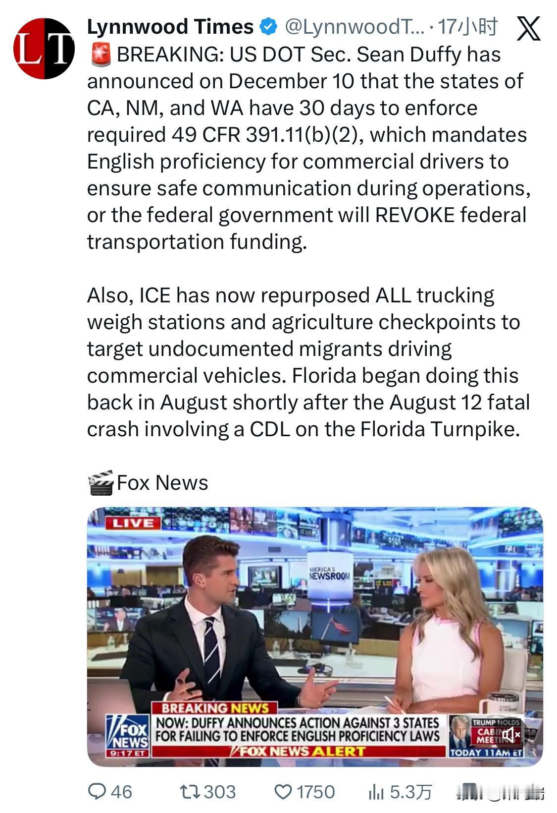 福克斯突发新闻:美国交通部长肖恩·达菲于 12 月 10 日宣布,加利福尼亚州、新墨西哥州和华盛顿州有 30 天的时间来执行 49 CFR 391.11 (b)(2) 条款,该条款要求商业驾驶员具备英语能力,以确保在运营过程中安全沟通,否则联邦政府将撤销联邦交通资金。 此外,美国移民及海关执法局(ICE)已将所有货车称重站和农业检查站重新调整用途,专门针对驾驶商用车辆的无证移民。佛罗里达州早在8月份就开始实施这项措施,此前不久,8月12日佛罗里达州收费公路上发生了一起涉及持有商用驾驶执照(CDL)的司机的致命车祸。