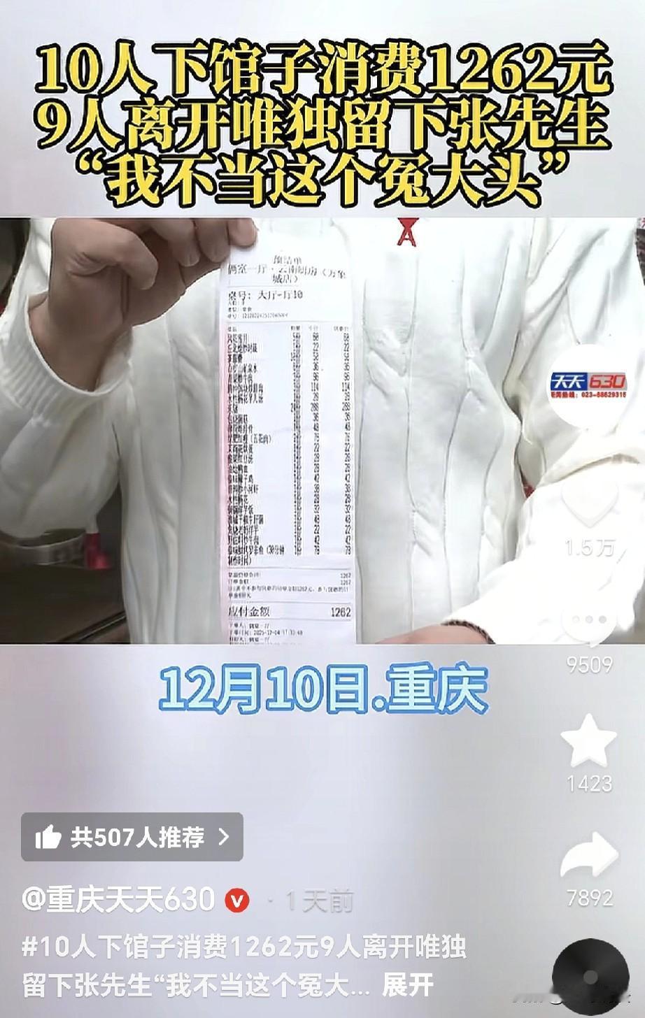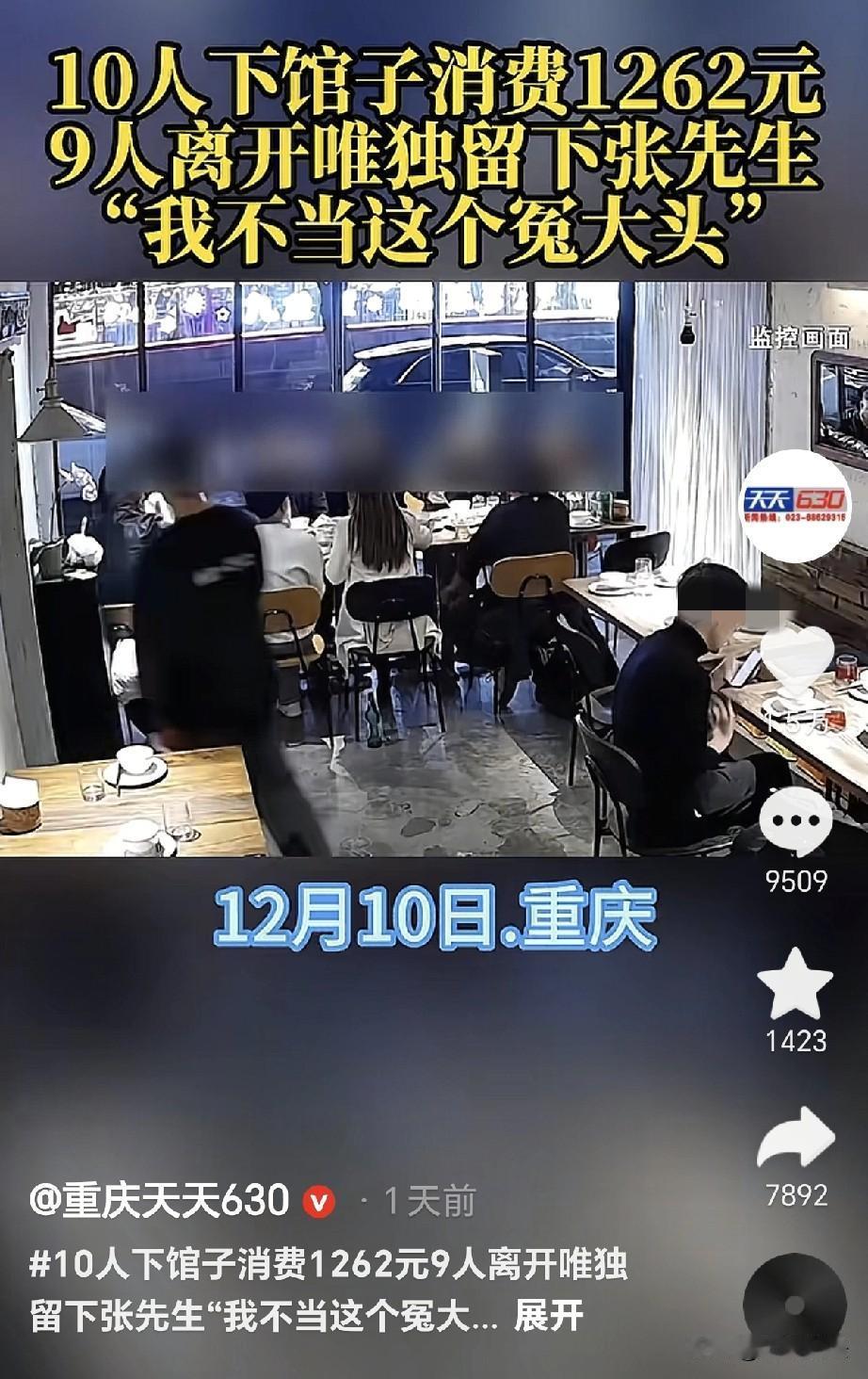 活不起了?重庆,一老板开饭店,10个人来吃饭,他们围成一桌,从傍晚吃到深夜12点,消费1262元,之后走了9人,剩下一男子买单,男子告诉老板,他现在没钱,加上联系方式,明天他再转钱,老板报警,警方调解,男子写下承诺,押下身份 证,答应第二天就来给钱,第二天还不给钱,老板联系他时,男子表示: 组局者是别人,我要把钱付了我就是冤大头!网友: 10个人凑不出1262元,哪里来的勇气去店里吃饭? 郑先生开了家餐厅,餐厅生意还算不错,可是最近几天,他十分的烦恼,他遇见了一桌奇葩的客人。 这一桌客人,共有10人,有男有女,他们一顿下来,共计消费了1262元。 可是,他们吃完之后,全部逃单,这1262元,至今没有人来给餐厅买单。 按理来说,这一千多元,对于郑先生来说,也不算是什么,如果是特殊有困难的人,他倒是宁愿去捐款。 可这件事情,想起来就窝火,10个人吃饭,难道就凑不出来这1262元? 原来,12月4日傍晚,餐厅来了10位客人,他们找到一张靠窗户的地方,把两张餐桌并在了一起。 10个人围坐在一起,他们边说边笑,各种点着各自要吃的餐饭。 不久之后,郑先生按照客人的点单,陆陆续续,把各种的美食,一一端了上来。 10个人看到美食,不由得瞪大了双眼,他们边吃边喝,聊的高兴,吃完了饭菜,不够时再要一盘。 他们欢声笑语,吃的热火朝天,聊的是海阔天空,吹的是五花八门。 10个人越聊越觉得开心,他们一直从傍晚吃到了半夜12点,郑先生累的眼皮打颤,瞌睡的眼睛都要睁不开了。 可是他做的这个行业,总不能撵客人离开,他强打着jS,陪着客人们直到散去。 谁知这一桌客人,他们吃到最后,9个人站起来只管走路,只剩下一位张先生留下买单。 谁知张先生告诉服务员说,他现在兜里没钱,能不能加上联系方式,第二天再把钱转给餐厅。 服务员不由瞪大了双眼,这种话都能说出口来?那你们刚开始为啥不说没钱,怎么要吃完之后才说没钱支付? 张先生却说,今天请客并不是他,而是他的朋友小尹,但是这朋友他现在联系不上,只有等联系上后,才能给餐厅支付饭钱。 郑先生当然不会同意,你这明摆着就是想赖饭钱,你当别人都是傻子,不给饭钱你就休想离开! 郑先生拨打了报警电话,警方赶来,对他们做了调解,并电话联系了张先生的朋友。 可这个组局的朋友,说他也没钱,他也要去筹钱,郑先生十分的无语,你没钱跑来吃什么饭? 可对方挂掉电话,之后关机,电话再也打不通了。 之后经过调解,张先生答应第二天6点前支付用餐费1262元,他压下了身份证,之后离去。 可是到了第二天时,张先生并没有来支付饭钱,郑先生联系他时,他说组局的朋友没给他转钱,他也付不了这笔饭钱。 张先生还说,他联系不上组局的朋友,这笔饭钱,本来就不应该由他来出。 郑先生十分无奈,又打电话给张先生那位组局的朋友,可是对方依旧不接。 随后记者又联系到了张先生说,问他啥时候才能给郑先生支付饭钱,可他表示,他联系不上朋友,没法支付。 他承认自己写了承诺书,但是他还是不愿意支付,他说如果自己支付了这笔钱,从某种程度来说,他就是当了个冤大头! 有人认为,遇到这事,不要他写什么承诺书,应该把事情搞大,让帽子叔叔把所有用餐人都通知到位,让他们AA,或者老板起诉所有用餐人。 也有人说,张先生应该把自己吃的那部分出了呀,126块2总得给吧?是不是这个张先生平时跑惯了,今天被朋友上了一课? 所以现在理解了有些饭店,就是必须要先扫 码付款下单,这个非常重要,没有钱就点不了餐。 10个人没一个靠谱,没有一个人肯来给餐厅付钱,吃不起别吃,不能就这样坑了老板。 老板和你们无冤无仇,老板不但贴了食材,还给你们做熟端来,陪你们一直等到半夜12点,老板不欠你们,难道合该被你们🕳️钱? 张先生自己不愿意做冤大头,郑老板就该做冤大头?真是丢 人到了全网,这下所有人都见识到了。 《民法典》第509条第一款规定: 当事人应当按照约定全面履行自己的义务。 《民法典》第579条规定: 当事人一方未支付价款、报酬、租金、利息,或者不履行其他金钱债务的,对方可以请求其支付。 10位客人到餐厅就餐,与郑先生的餐厅形成服务合同关系。 餐厅按约提供了餐饮服务,客人接受服务后即负有支付餐费的义务。 张先生作为留下签订承诺书的主体,构成债务加入,应按承诺履行付款义务。 张先生以组局者失联为由拒付,违背合同诚信原则与全面履行原则,餐厅可依法要求其支付全部餐费。 至于张先生和朋友之间是如何约定的,应该由他们之间按照当初的约定来进行分配或者追偿。 关注@王哥说法 多学法律少吃亏! 信源: 重庆天天360