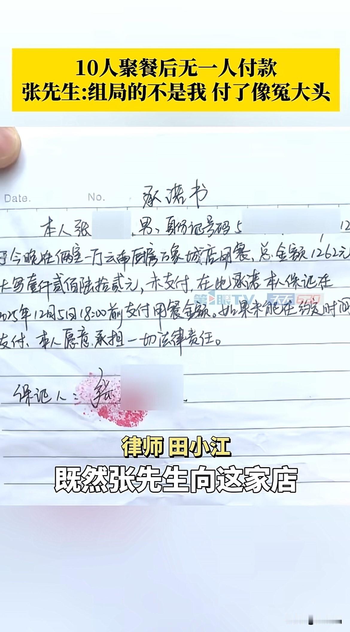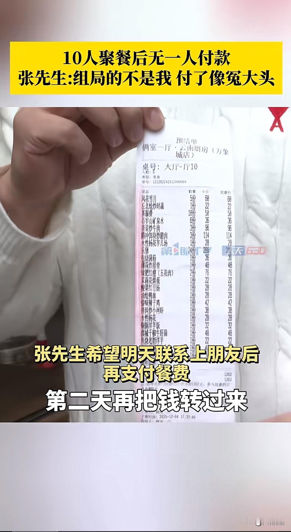 这下全国都知道重庆这10人组团吃霸王餐了!10个人组局聚餐,9人吃完默默开溜,留下张先生一人当冤大头。 服务员发现不对劲,找张先生买单,谁知张先生说:“组局不是我,我付了不就是冤大头,何况我身上没钱,能不能加个联系方式,第二天再转钱给你?” 老板一听,“哪有第二天给钱的道理,第二天找不到人,我找谁去要这1262元?”于是果断报警,民警给组局者打电话,组局者称没钱,需要筹钱,第二次拨打就关机了。没办法,最后协商张先生留下身份证,签下第二天18点付款的承诺书,可第二天张先生也没还钱,老板也联系不上人。 网友说,花1262元认清了这9个朋友,花得值! 也有人说,这10个人没一个体面人!没钱组什么局聚餐,明摆着吃霸王餐! 还有人说,我也有过这样的的经历,请朋友来吃饭,结果他带了三四个人来,大家都不认识,我再也不请他吃饭了。 这年头哪还需要身上带现金的,都是手机支付,说身上没钱就是想吃霸王餐,老板大可按身份证上地址去找人还钱,或者找民警帮忙查他上班的地址,弄得单位和老家的人都知道,就不信他不还钱。遇上这种无赖就该硬气点!
