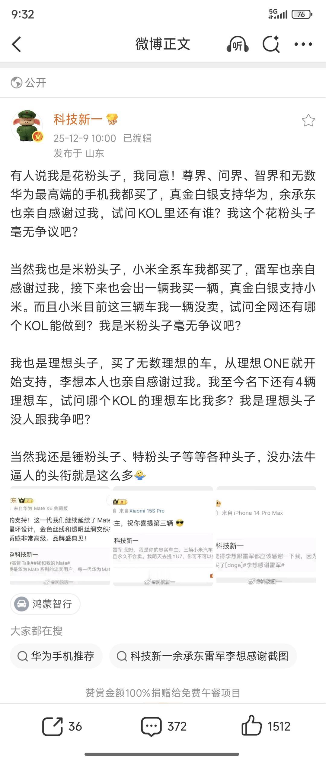 小米战略市场部副总徐洁云点赞了科技新一的一条动态,我们来看看这条动态写了什么。 新一表示,自己不仅是花粉头子,还是米粉头子,还是理想头子,还是锤粉头子,是各种头子。 这样的动态,小米副总徐洁云都能点赞,说明什么,说明小米的气场和容度是相当大的,不会直接把哪一个数码博主定性为某某头子。 所以无论是做数码类还是汽车类的各位,不需要把自己定性为某某头子,大家要做的是把好的产品推广给真实用户,帮助市场提早剔除垃圾产品,我觉得这才是博主的意义吧。