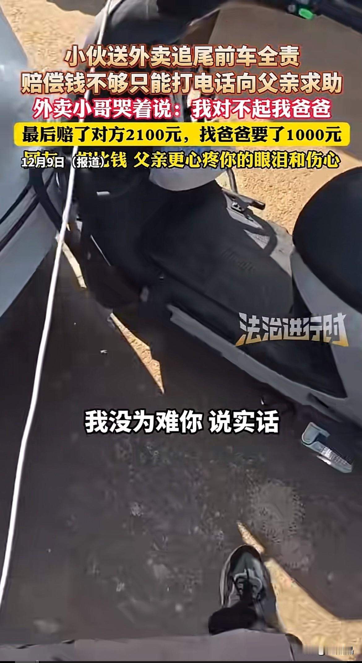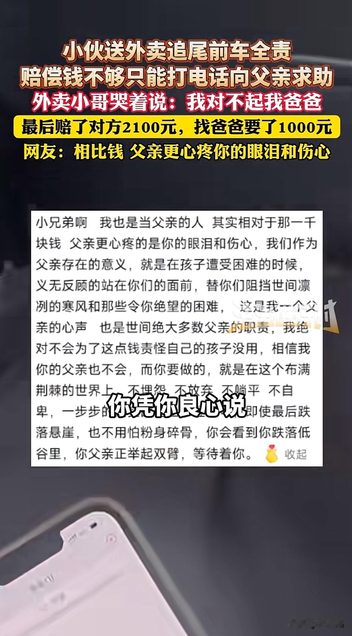 看哭了!小伙送外卖撞到前车,车主要赔偿2100元,小伙钱不够,无奈要父亲拿1000元,忍不住痛哭:“我对不起我爸爸。” 车主一看情况,还以为小伙觉得自己为难他,小伙痛哭流涕,解释道:“我知道没有为难,就是我出来工作了,还要找我爸要钱,我对不起我爸爸。” 暖心网友的安慰更是让人泪崩,他说:“小兄弟啊,我也是当父亲的人,其实相对于那一千块,父亲更心疼你的眼泪和伤心,我们作为父亲存在的意义,就是在孩子遭受困难的时候,义无反顾地站在你们面前,替你们阻挡世间凛冽的寒风和那些令你绝望的困难,这是我作为一位父亲的心声,也是绝多数父亲的职责,我绝对不会为了这点钱责怪自己孩子没有用,相信你的父亲也不会。” 是啊!父亲总是默默守护在孩子身后的,在我们有需要的时候挺身而出,他总是那样安静无言,却总是背负最大的责任,常回家看看,常陪伴父母,大概是父母最渴望的愿望。