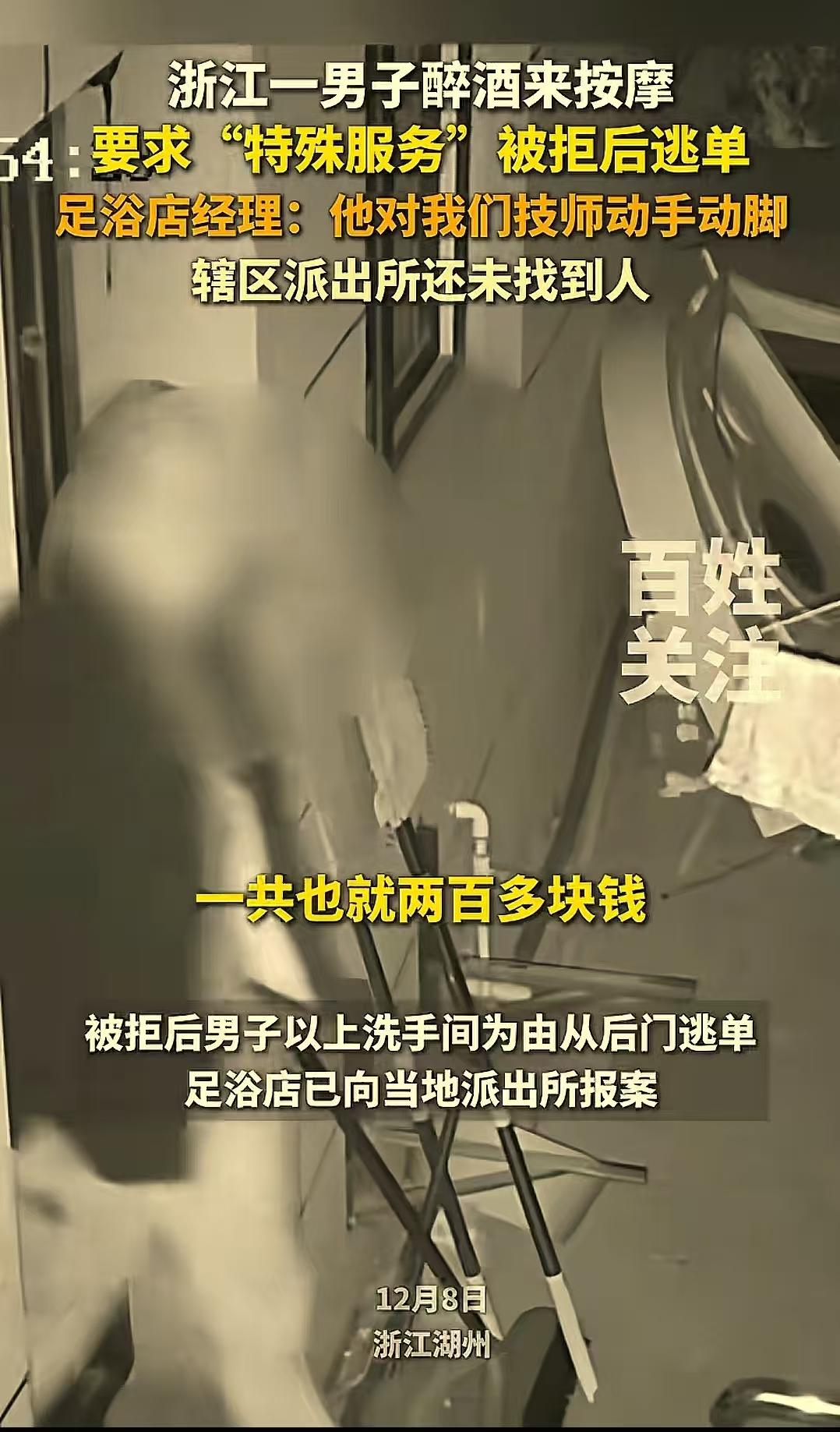 浙江湖州,男子醉酒后去按摩,对女技师动手动脚,还要求女技师提供“特殊服务”!女技师又羞又怒,说自己不是随便的女人,只做正规按摩!而男子被拒后,觉得这钱花的不值,居然选择了逃单。足浴店气愤不过,选择报案! 足浴店的经理说,当天是足浴店开业第一天,男子一身酒气的走进店里,要求经理给他安排一个漂亮的姑娘。 经理虽心里有些不悦,但本着顾客至上的原则,还是按照男子的要求,精心挑选了一位女技师为他服务。 女技师带着专业的态度和微笑,开始为男子进行按摩。 可谁能想到,按摩过程中,这男子的行为却越来越过分,对女技师动手动脚,各种揩油。 女技师又羞又恼,只能不停地闪躲,让男子停止这种不恰当的行为。 可是,男子反而变本加厉,竟然厚颜无耻地要求女技师给他提供“特殊服务”。 女技师义正言辞地拒绝道:“你走错地方了,我们店里没有那种服务!我们可是正规的足浴店,只做正规按摩!” 男听后一脸不爽,嘴里嘟囔着:“200多块钱?就这样?” 随后,男子借口要去上厕所,趁机偷偷从后门溜走了。女技师在按摩室里左等右等,始终不见男子回来,查看监控,才发现男子竟然逃单了。 女技师心里那个气啊,自己辛辛苦苦按了半天,这男子却白嫖,一分钱都不给。 无奈之下,女技师选择了报案,可截至目前,警方还没有找到这名男子。 足浴店经理也觉得这男子的行为实在是太缺德了,为了讨回公道,也为了给其他顾客提个醒,她把监控视频发到了网上,并气愤地说道:“一共才200多块钱,你好意思逃单?希望看到视频后能自觉来买单!” 那么,从法律上来说,男子逃单构成什么性质呢? 从法律的角度来看,男子的逃单行为绝不是一件小事,这已经涉嫌违法。 逃单本质上是一种侵犯他人财产权的行为,在法律上属于以非法占有为目的,通过欺骗手段使对方陷入错误认识,从而免除自己支付费用的义务,这与诈骗罪的构成要件有一定的相似性。 虽然这次涉及的金额只有200多元,尚未达到诈骗罪的立案标准,但男子的行为依然违反了《治安管理处罚法》。 根据该法规定,强拿硬要或者任意损毁、占用公私财物的,处五日以上十日以下拘留,可以并处五百元以下罚款;情节较重的,处十日以上十五日以下拘留。 这名男子醉酒后不仅对女技师进行性骚扰,还妄图获取非法服务,最后更是为了区区200多元钱选择逃单,这种行为实在是令人不齿。 我们生活在一个法治社会,任何违法行为都逃不过法律的制裁。不要以为逃单是小事一桩,就可以肆意妄为。 法律的尊严不容侵犯,一旦触碰法律的红线,必将付出沉重的代价。希望这名男子能早日认识到自己的错误,主动投案自首,接受法律的惩处, 同时也希望这样的事件能给其他人敲响警钟,做一个遵纪守法、道德高尚的好公民。
