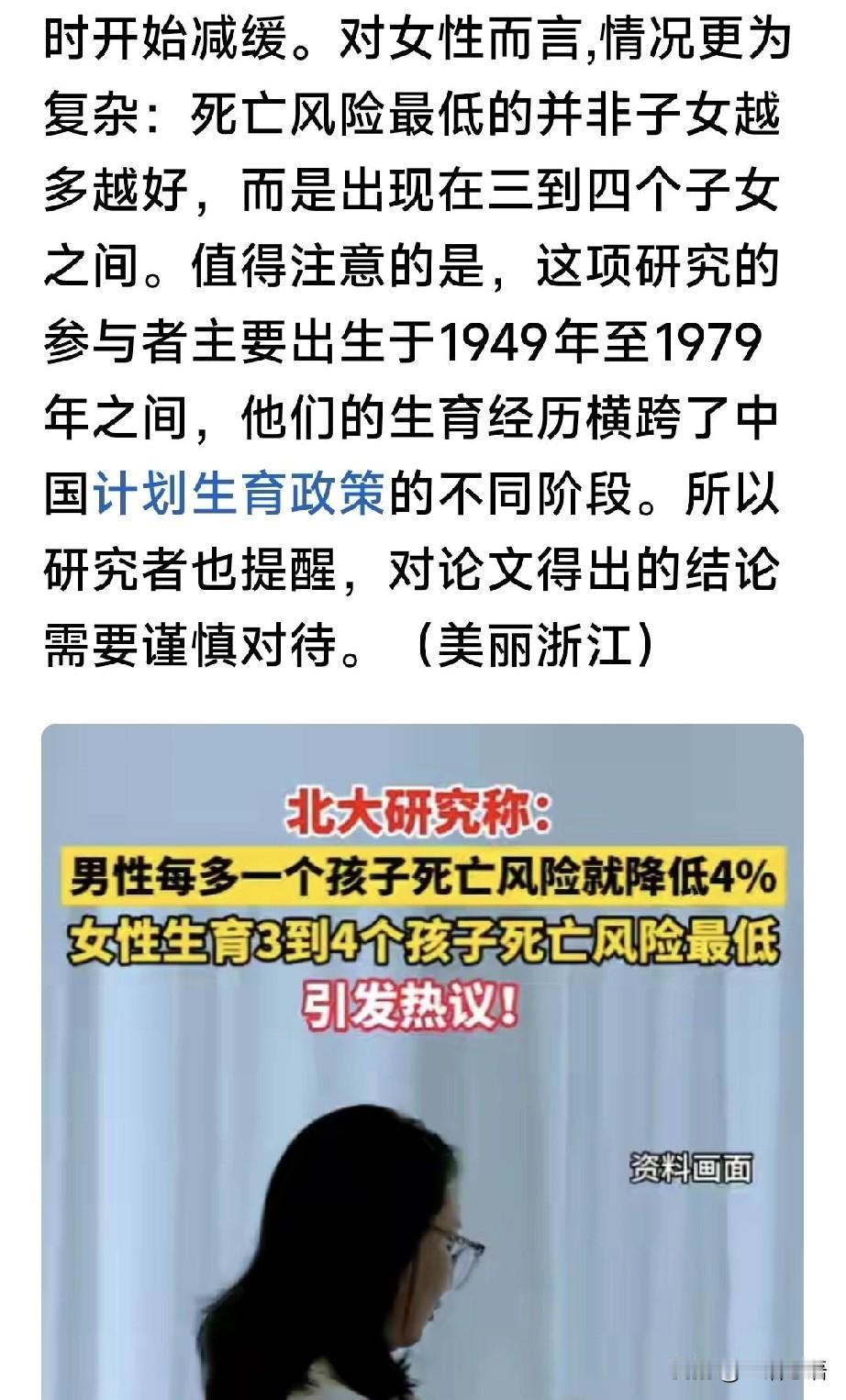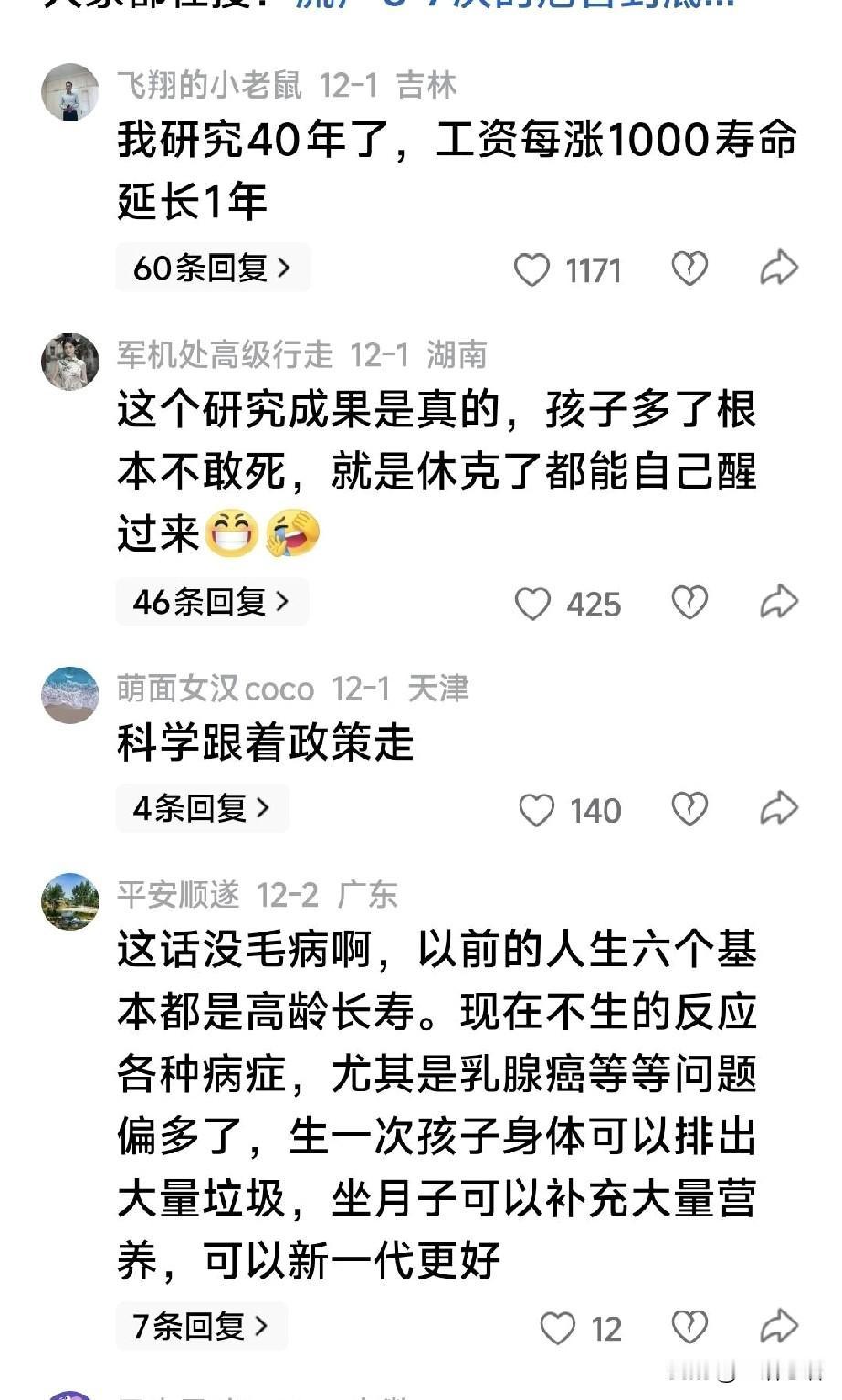 这课题新颖,如果坐实,可以申请诺贝尔奖! 有一个叫孙点剑的副研究员,对51万人,长达12年深入研究发现,多生孩子有可能有助于长寿。 此言一出,四座皆惊,众人称,如果结果真如其所言,还到处找啥长生不老的秘诀啊?生孩子就完了! 可,可,可,那些天生不能生育的咋办呐? 哦!仔细阅读才弄明白,人家只说,生3到4个孩子的父母,死亡率最低! 要我说,生三四个孩子的父母,不是死亡率低,是不敢死,不能死,必须得活着,不活着这些孩子咋整? 是求生欲强,造成他们可能长寿。 跟帖的网友七嘴八舌,有人称:经过他长达四十年的深入研究,退休金每增长1000元,可延长寿命5年,也有人称:没有孩子拖累活的更久,也有人说,一生不结婚不生娃只谈恋爱的男性女性活的更久…… 真是长寿秘诀各有说法,您觉得到底谁儿说的更对呢?