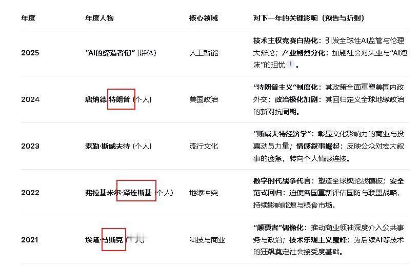 2025年《时代》周刊把的“年度人物”颁给了“人工智能缔造者”。 首先,你必须承认,AI确实已经无声无息地成了我们生活的一部分,比如原本我们要导航,需要打开手机,打开定位,打开导航软件,输入目的地进行导航。而现在,你只需要和自己的手机智能体对话即可完成这一系列的操作。 再比如以前什么都问百度,结果搜出一堆广告和无效信息,它赚了流量,我们浪费了时间。现在有了豆包这样的AI,问什么答什么,还能拍照提问,干净利落,效率高太多了。 到了2026年,两场“竞赛”会越来越激烈:一是国家之间抢技术、抢芯片、定规则,AI已经成了大国之间最重要的筹码之一;二是科技公司越做越大、越赚越多,另一边是普通人越来越担心工作被取代、隐私泄露。 回头看前几年的《时代》年度人物,其实每个人都在为下一年的故事“预热”: 2024年给了特朗普,说他即便带着刑事定罪也能赢大选,定义了一个“特朗普时代”。 2025年初,马斯克等AI大佬就出现在他的就职典礼上——这显然不是巧合,预示了科技巨头和政治力量即将更紧密地合作或博弈。 2023年是泰勒·斯威夫特,她证明了一个巨星在社交媒体时代能带动多么巨大的经济和文化影响力。 2022年是泽连斯基,他那件军绿色T恤和全球视频演讲的形象,说明今天的战争不仅是打战场,更是打故事、争人心。 2021年是马斯克,那时候他代表的是那种“技术能改变一切”的乐观野心。 把这五年连起来看,趋势就很明显了:从“改变新闻头条的个人”,转向“塑造这个时代的一整套系统力量”。 2025年选“AI缔造者”这个群体,其实就是在说:真正驱动世界的,不再只是某个总统、明星或企业家,而是一张由技术、资本、算法和顶尖工程师共同织成的网。 2026,我们即将进入的是一个“人机共生”的纪元。