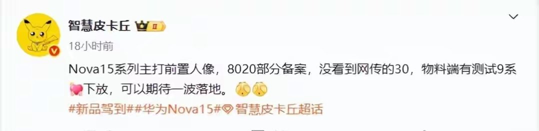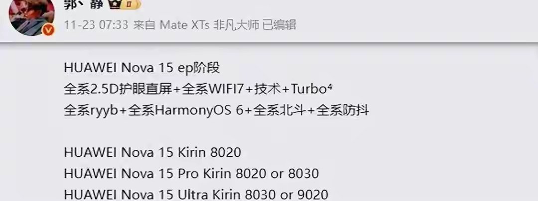 听说在21号出,华为nova15系列了,据悉,华为Nova15 系列主打前置人像方案,而在芯片选择方面,据悉麒麟 8020 方案已经开始备案,暂无此前网传的麒麟 8030 芯片的相关信息,除此之外预计也将有麒麟 9000系列芯片的型号可供选择。参考以往爆料,华为Nova 15 系列将会搭载两块尺寸分别为 6.7/6.84 英寸的 1.5K 分辨率 LTPO 屏幕,标准版与 Pro 版预计为麒麟 8000 系列处理器(8020),Ultra 版本为麒麟 9000 系列芯片,影像方面,Pro 版本系列为前置双摄 + 后置 5000 万像素三摄方案,包括一枚潜望式长焦镜头以及多光谱镜头。超大杯增在测试一枚 1/1.3"±超大底主摄,不排除超大杯机型延后发布的可能性。