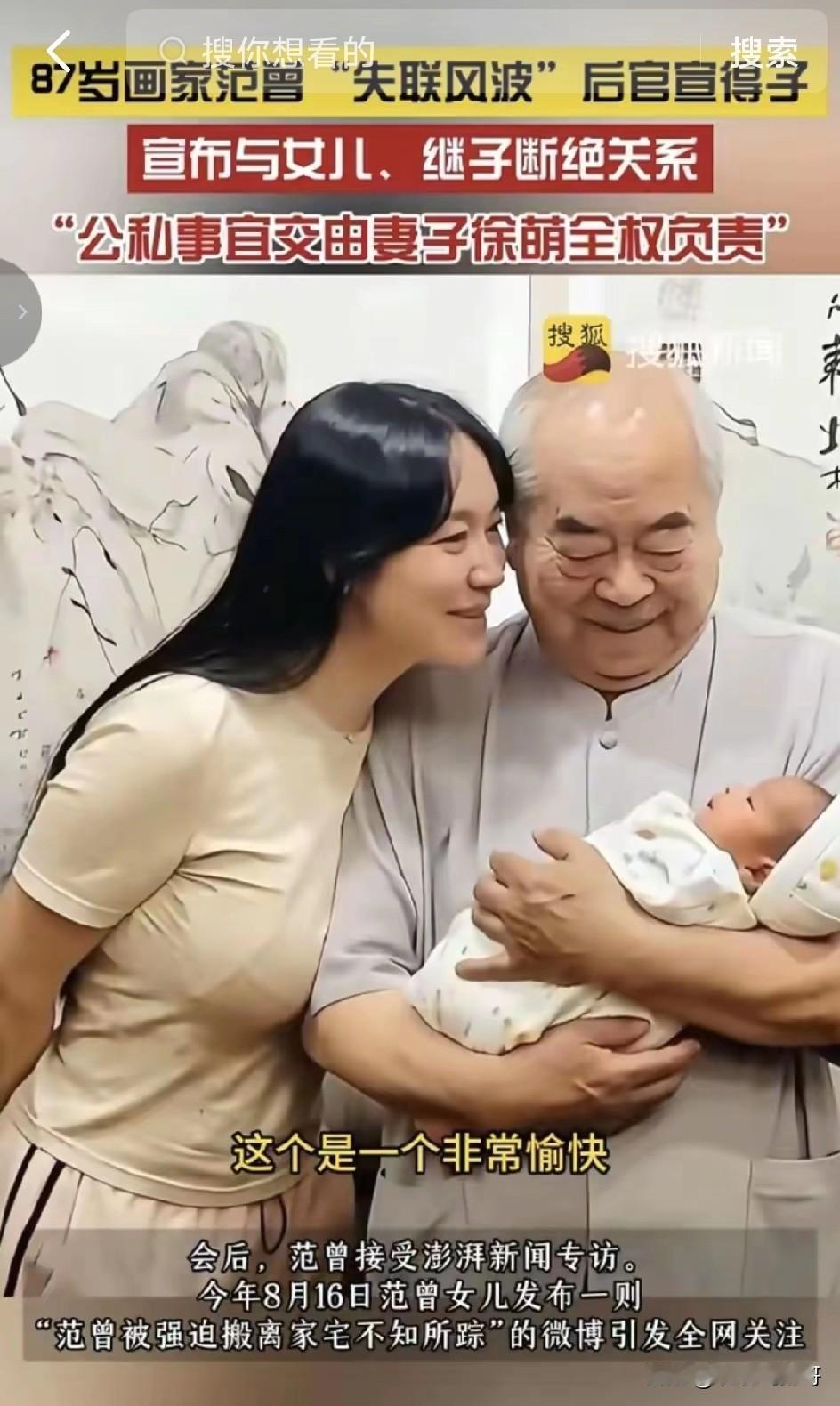 电视剧都不敢这么演 ! 画家范曾87岁喜得贵子, 别说中国,放眼全世界也没有几个87岁还能生儿子的老人 ! 范晓慧是范曾第二任老婆的亲生女儿 。 范一夫是第三任老婆带来的,也就是说这个范一夫跟范曾其实没有血缘关系,是第三任老婆跟前任所生, 第三任老婆把这个儿子带来以后,范曾就给他改了名,取名叫范一夫, 这个继子很喜欢这个名字 。 范曾现任妻子徐萌是范一夫介绍的, 他把徐萌介绍给范曾并不是给他做老婆,而是做范曾的助理, 结果徐萌成了范曾的妻子 。 这个徐萌是受过高等教育的一个高级知识分子,还是一个主持人 ,可能是这方面的优秀,让范曾动了心。 范晓慧不喜欢老爸还找老婆,但是她管不了。 在范晓慧这里,老爸找的不是后妈,而是来跟她分财产的人, 所以范晓慧跟徐萌以及范一夫的关系都不好。 几个月前,范晓慧全网找爸,说老爸范曾被人带走了,家里值钱的字画古玩也被全部搬空 , 结果范曾在国外跟徐萌和继子一起看画展。 现在徐萌母凭子贵,范曾宣布家里所有一切交由妻子徐萌打理 , 同时宣布跟女儿范晓慧以及继子范一夫断绝关系 。 范一夫跟范曾关系也搞崩,这个就不明白原因了。 说来范一夫这应该是徐萌的恩人,不是他的从中牵线,徐萌怎么怎么能攀上范曾这个大富翁? 有法律人士指出法律断不了血缘,也就是说范晓慧仍然享有范曾财产的继承权以及对他的赡养义务, 而继子范一夫可能还真继承不了范曾的财产, 因为他跟范曾没有血缘关系,这个姓算是白改了!