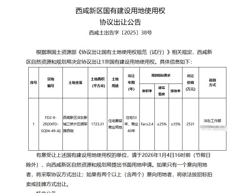 快讯!日前,西咸新区沣东新城推出1宗小面积商住用地,为协议出让;近邻地铁口和大型商业.... 宗地地籍编号:FD2-9-29[XXFD-SQ04-49-A],位于西安西咸新区沣东新城三桥片区拥军路西侧,净用地面积1723.31平方米(折合2.581亩),土地用途为住宅兼容商业用地,容积率Far≤2.4,建筑密度≤25%,绿地率≥35%。 宗地为协议出让,出让价格为2531万元。 有意受让上述国有建设用地使用权的单位,请于2026年1月4日16时前(节假日除外),向西咸新区自然资源和规划局提出书面用地申请。 如果只有一个意向用地者,将采取协议方式出让;如果有两个以上(含两个)意向用地者,将依法按招标拍卖或挂牌方式出让。 从区位上看,宗地位于中建开元城小区附近,近邻西安地铁1号线三桥站,南侧一路之隔是西咸万象城,西侧不远是大明宫建材家居三桥店;周围还有沣东新城街小学、沣东第四小学等教育资源,以及财富大厦、天玺国际、天玺龙景、枫桥名邸等写字楼和成熟住宅小区。 值得注意的是,宗地位置优越,配套成熟,交通便利,但是体量太小;宗地的后续情况我们持续关注!