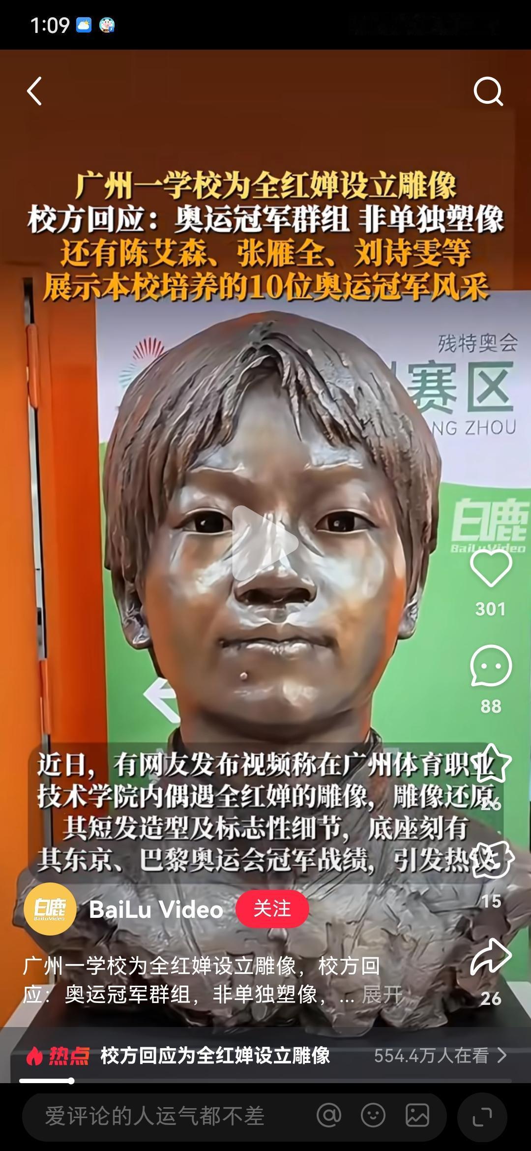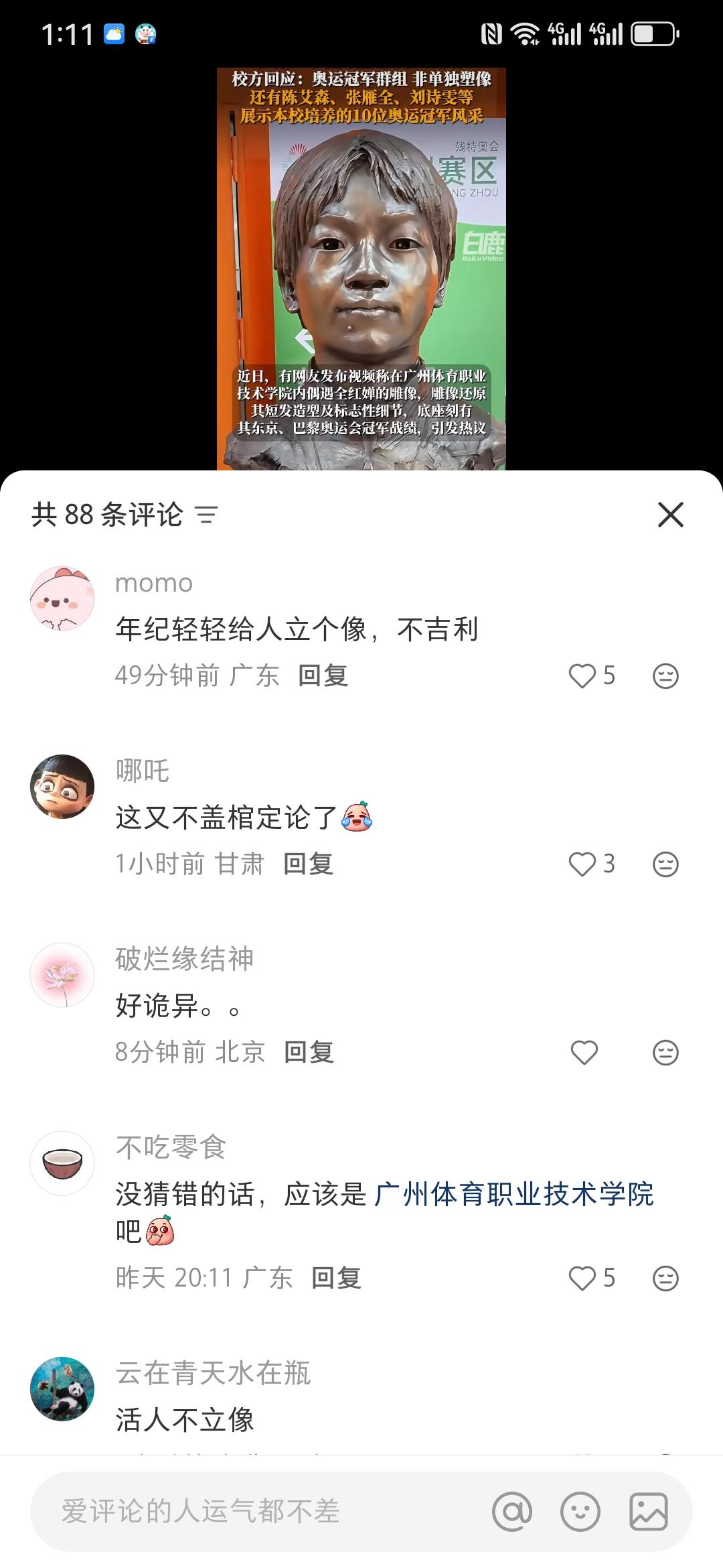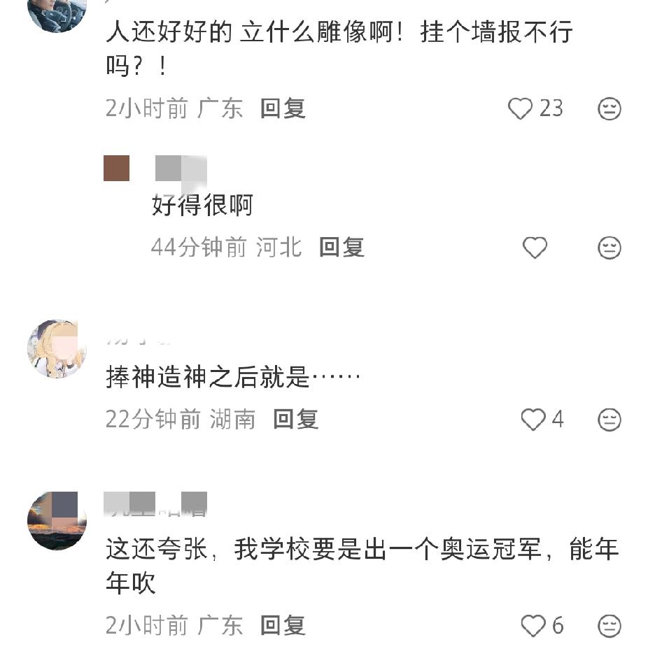 广州一学校为全红婵设立雕像,引起网友热议。 反对者认为:年纪轻轻给人立雕像,不吉利,挂个墙板不行吗?甚至有网友认为这是在造神。 不过更多网友认为,全红婵值得这份荣誉,甚至待遇还不够高。运动员雕像也很正常,比如C罗、穆里尼奥等还没退役也都有雕像了。
