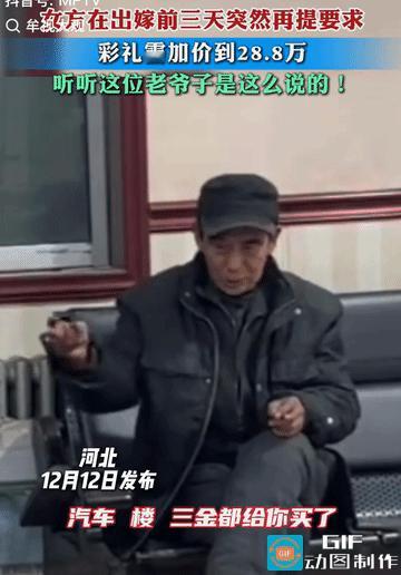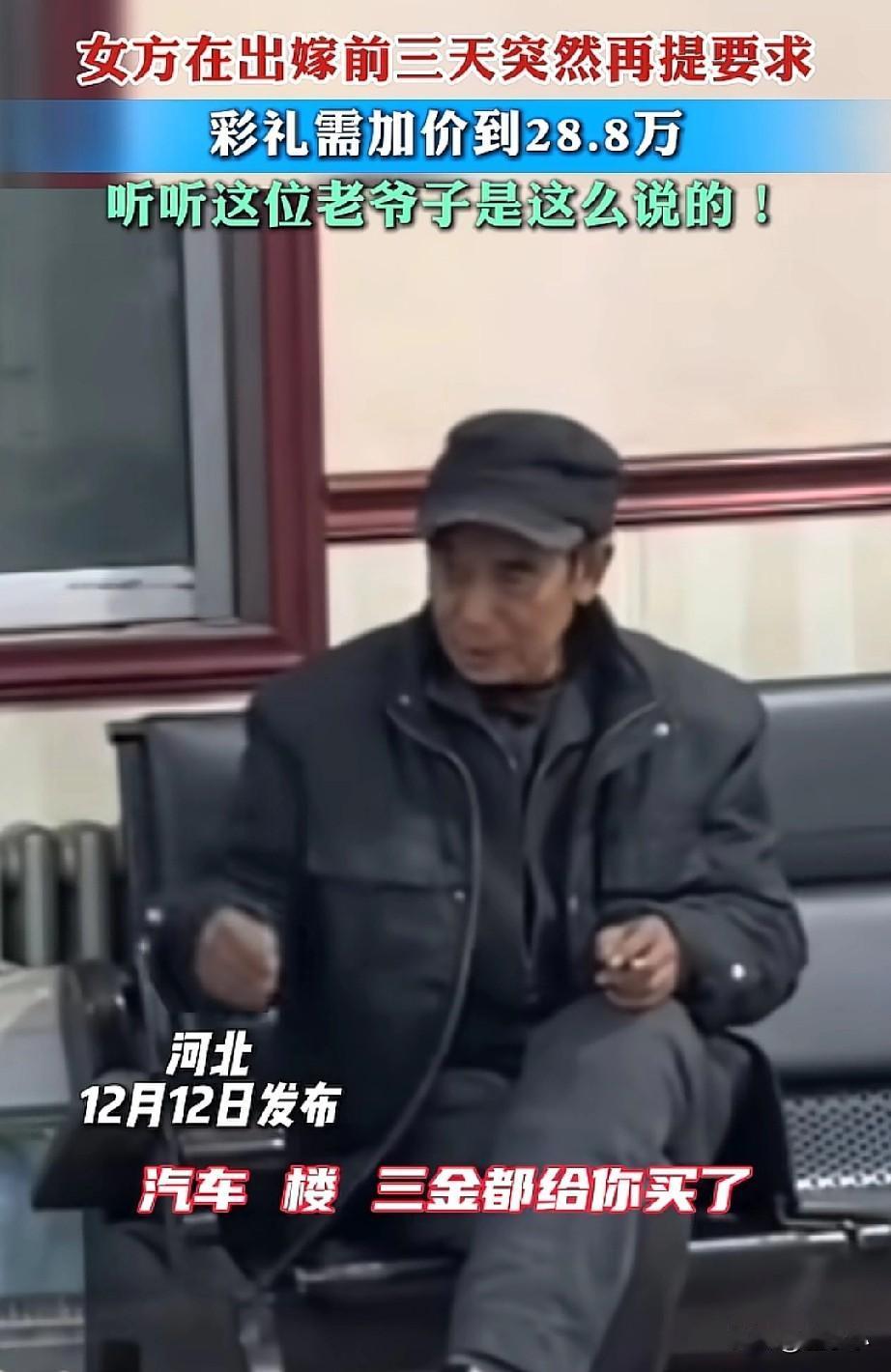 这是嫁女儿,不是卖女儿!河北,女方在出嫁前三天突然就提出要求,彩礼必须加到28.8万,来听听男方老爷子是怎么说的。 原来,两个人到了谈婚论嫁的时候了,女方那边要求必须有,车,有楼,三金,彩礼12.8万,男方也按照女方的要求一一都满足了。 奈何就在两个人订下结婚日子的前三天,女方又再次提出要求,彩礼涨到28.8万,不行的话,婚就不要结了。 男孩就把这个事情告诉了父母,对于,女方的要求,一位老爷子直接对着男孩说出了一段话。 从老爷的口中,他应该是男孩的爷爷,因为他自己也说了,如果是钱的事情,他可以和他爸爸东拼西凑的。 这种情况不简单是钱的事情,是对方的人品问题,三观不正,物质性太强了,光想捞一把,这是过日子的吗? 这老爷子说话说到点子上,关键要看人品,能坐地起价,这一家子是啥人,一目了然了。 如果最开始要的多,可能是街坊邻居攀比心作祟,也可能是不了解男方家庭经济情况!但是最后坐地起价这种就是人品问题了,根本不是过日子的人。