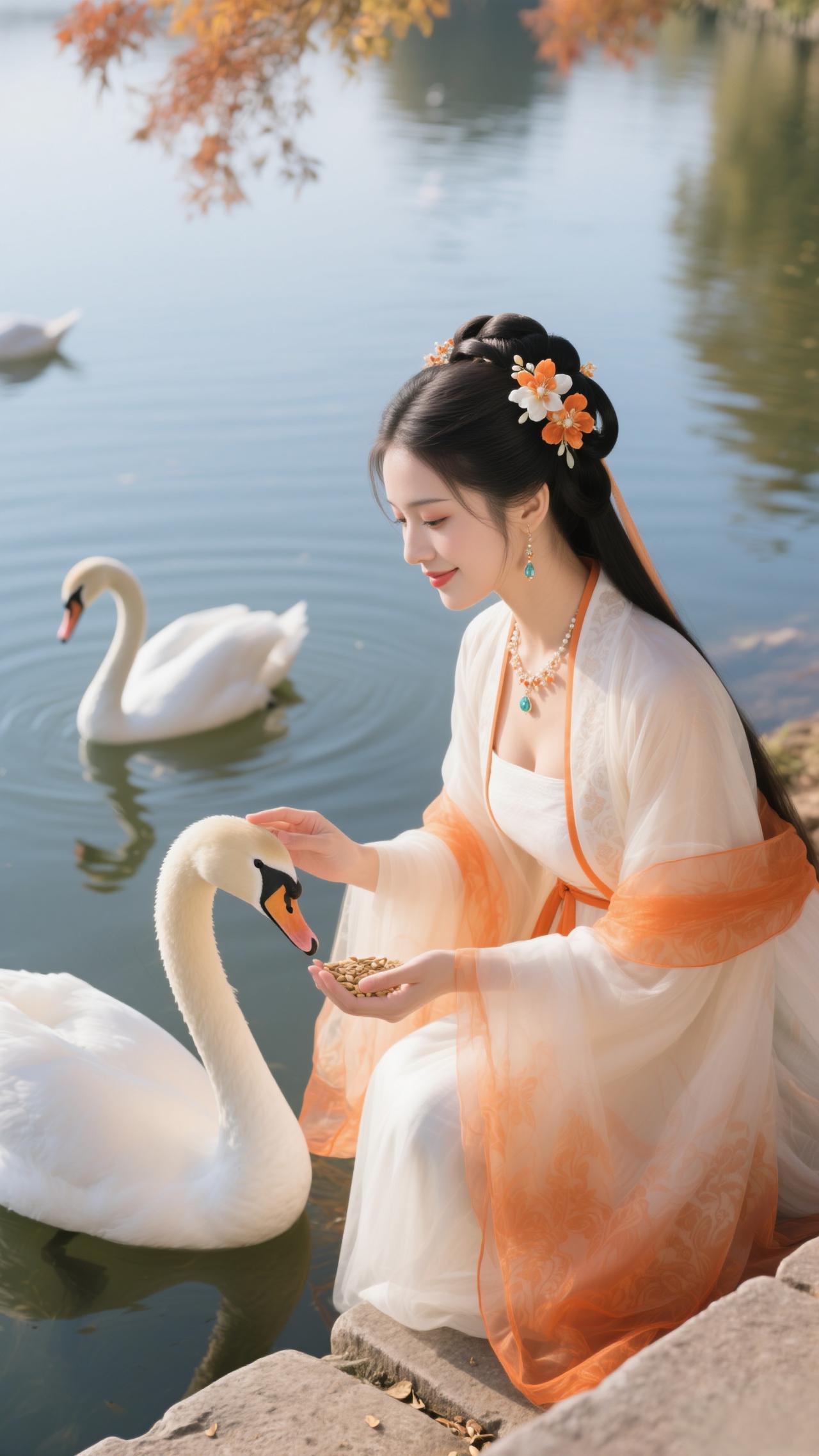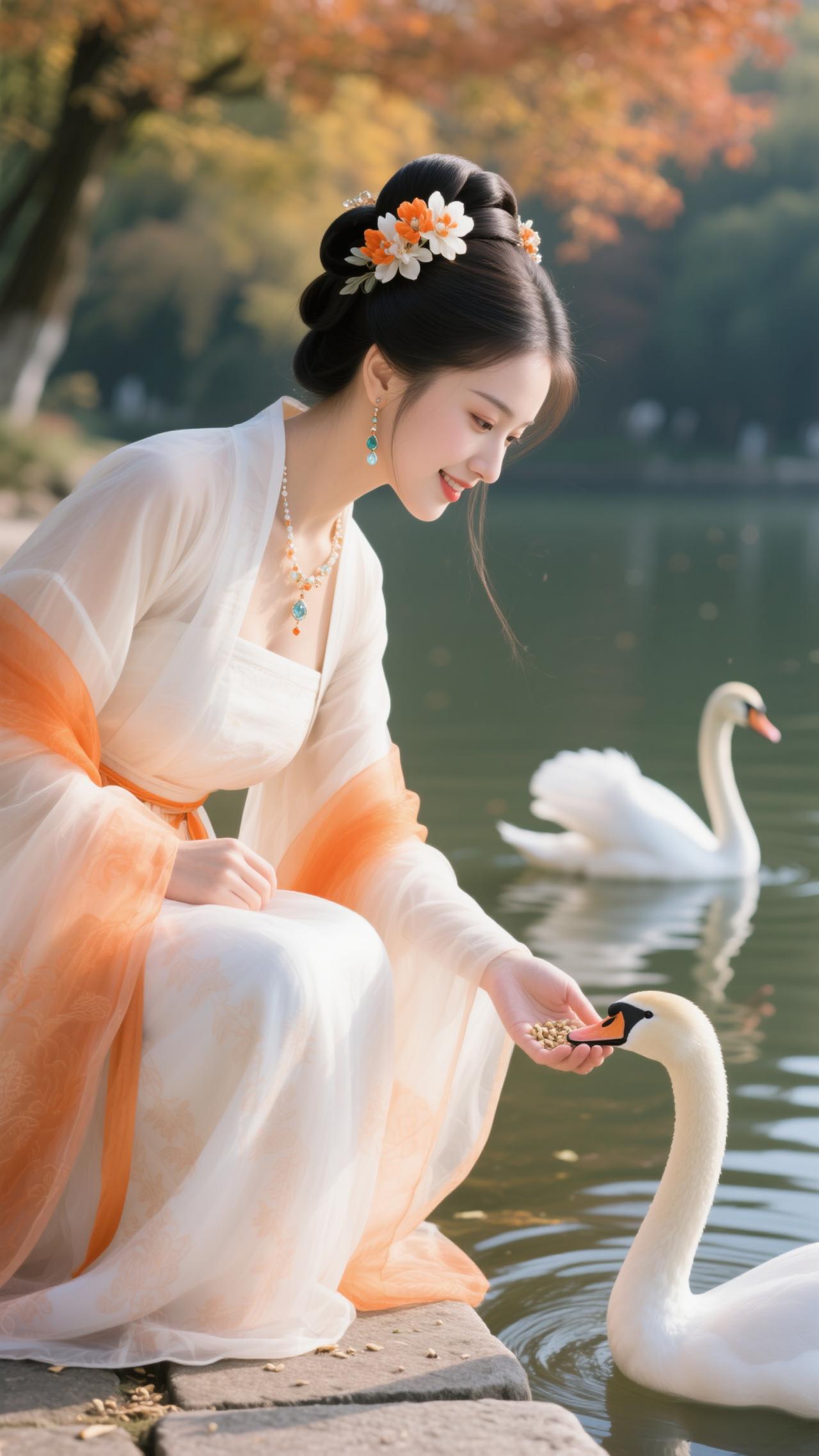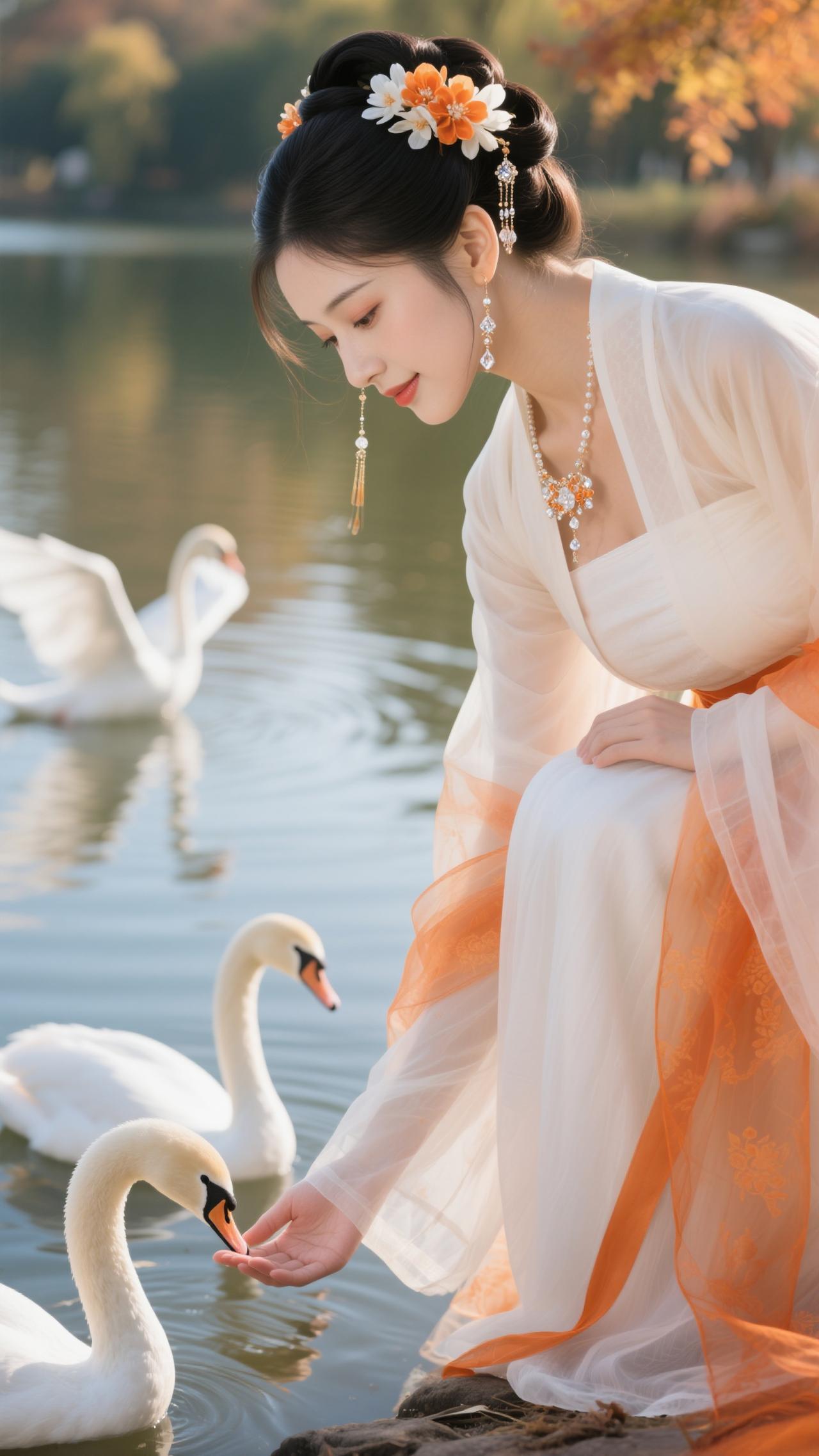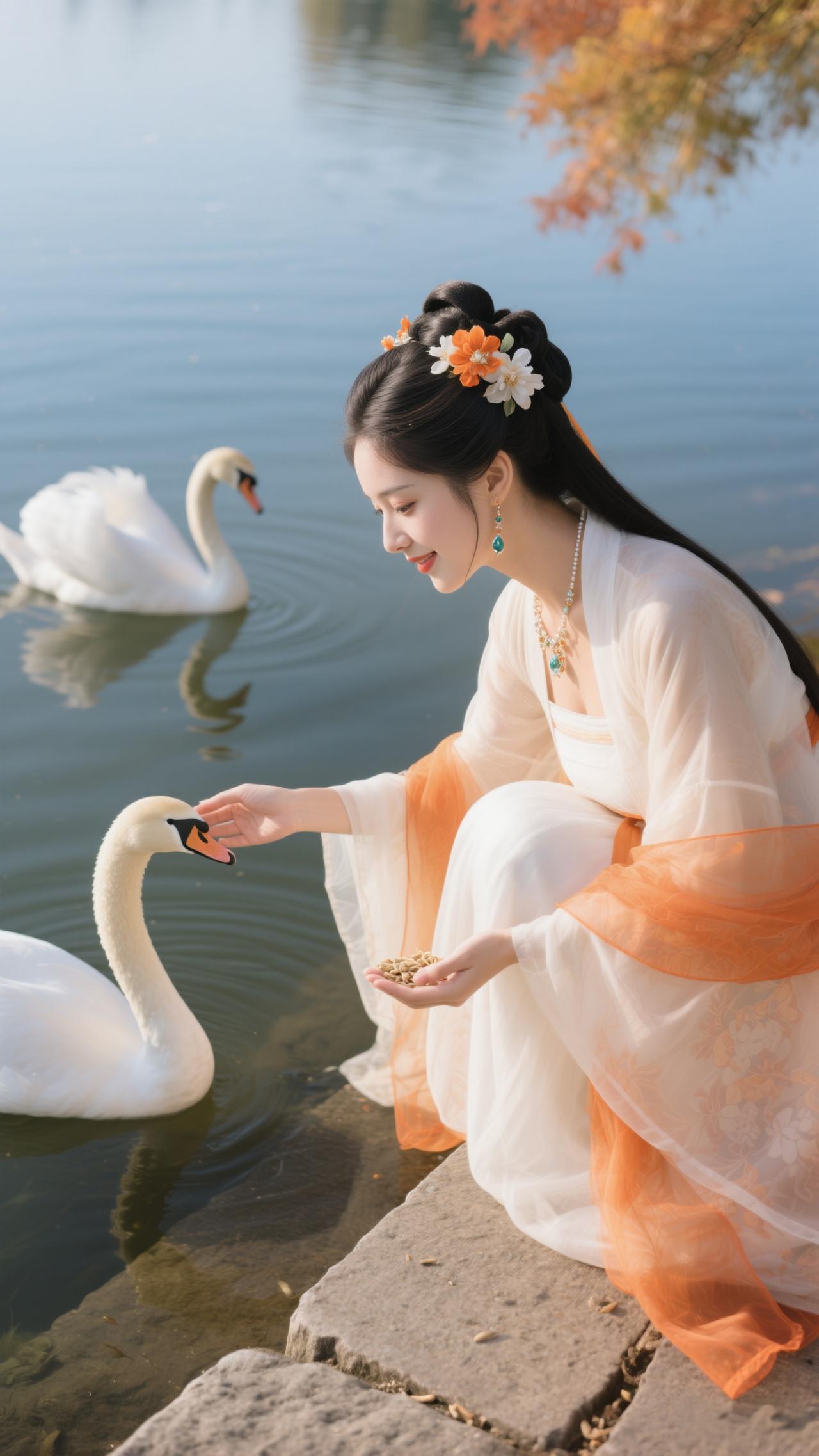 《点绛唇·秋湖饲鹅》 橙缕萦纱,白衫轻惹枫边露。 兰香盈袖,鹅颈偎纤手。 波