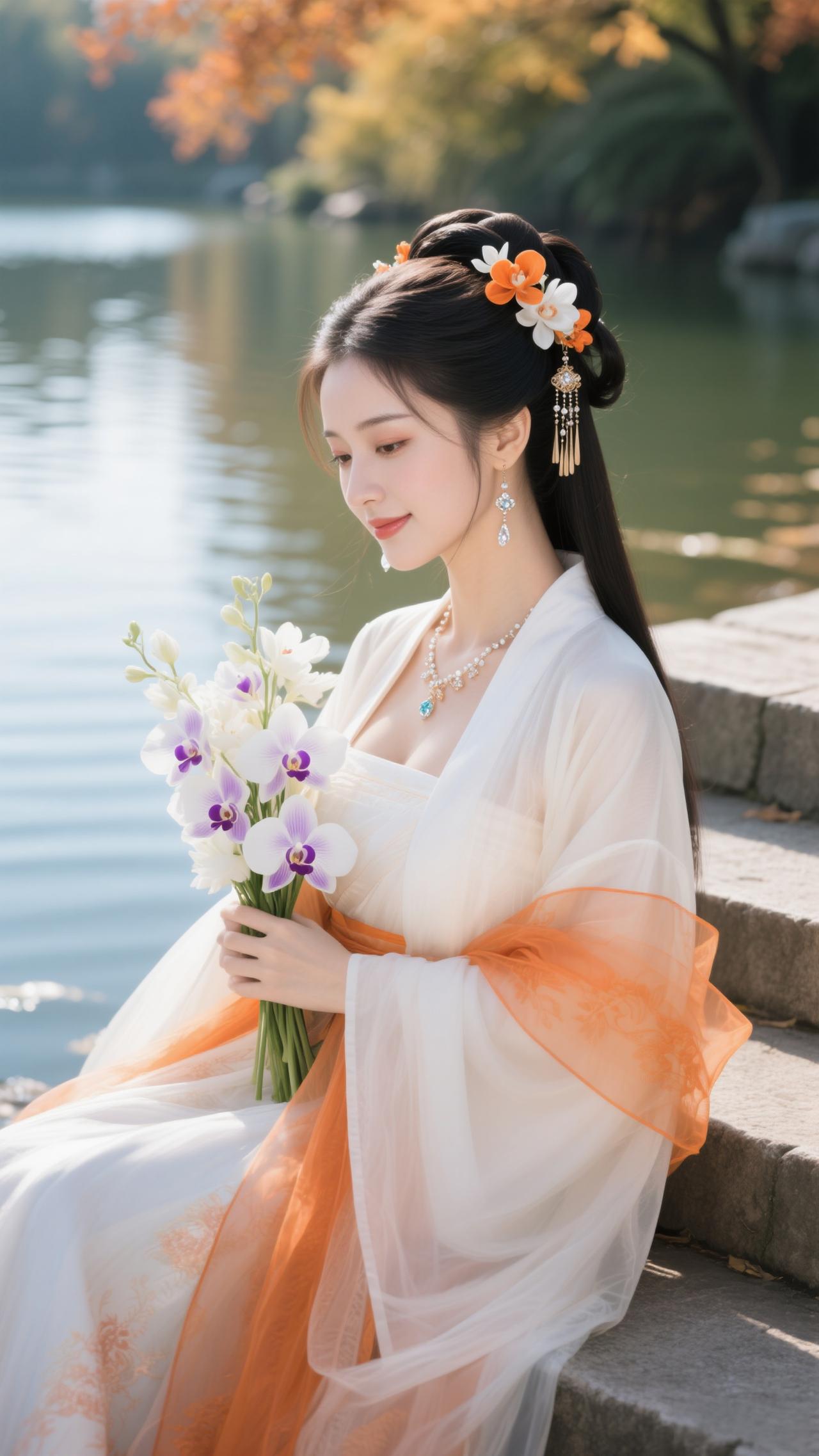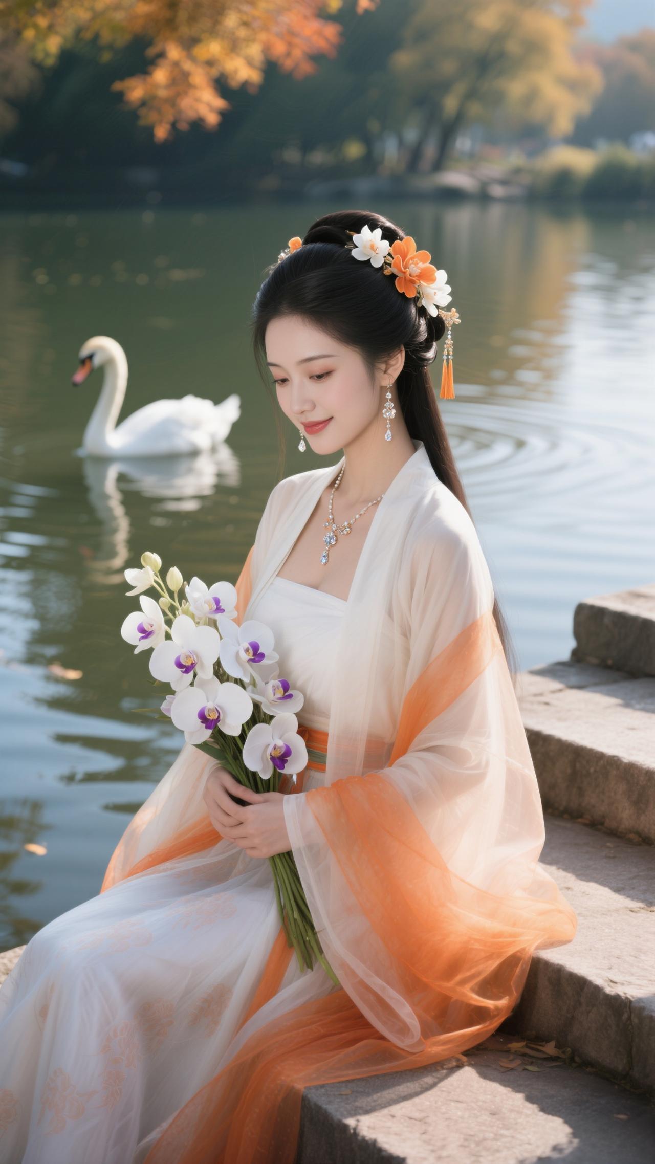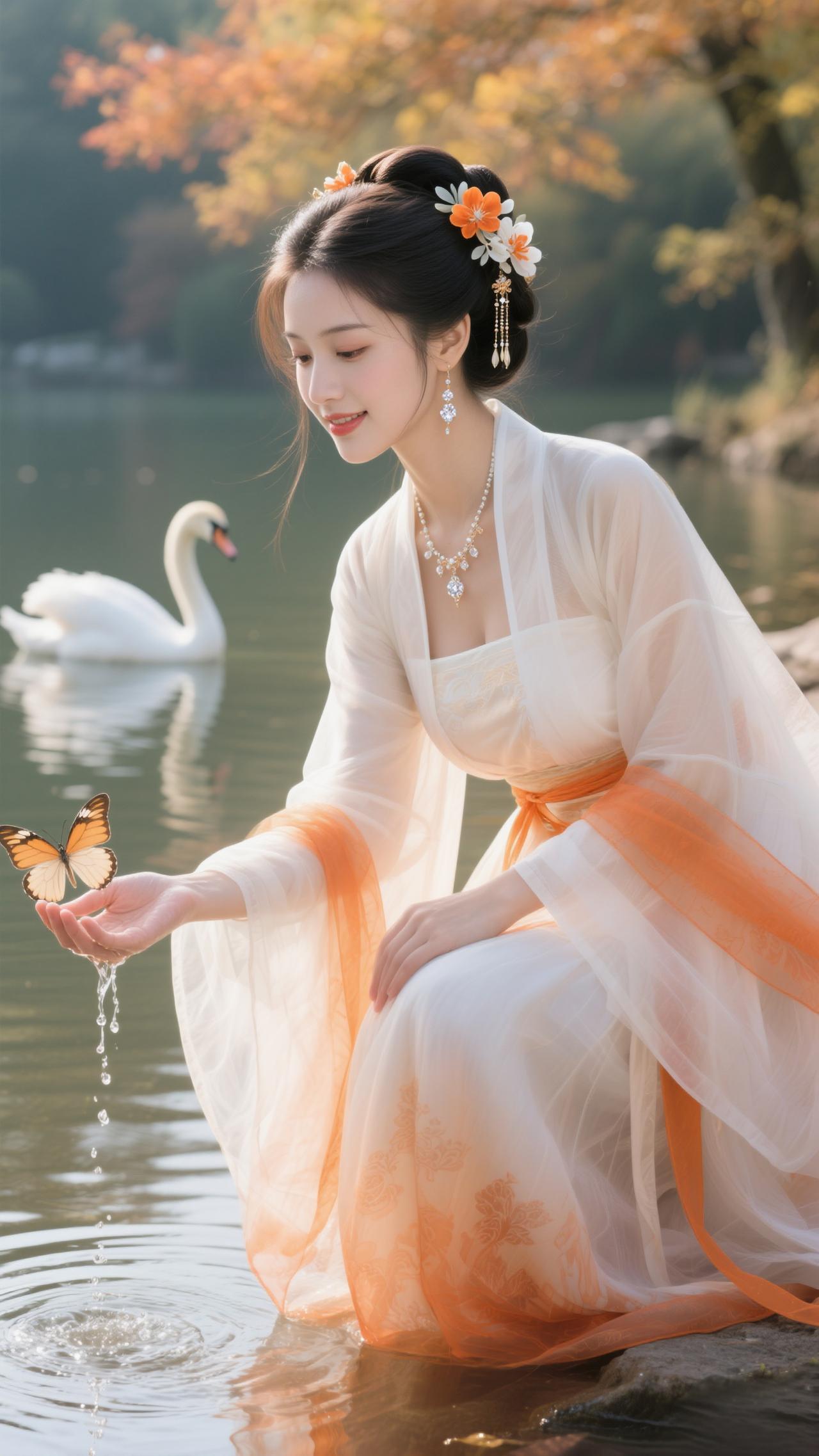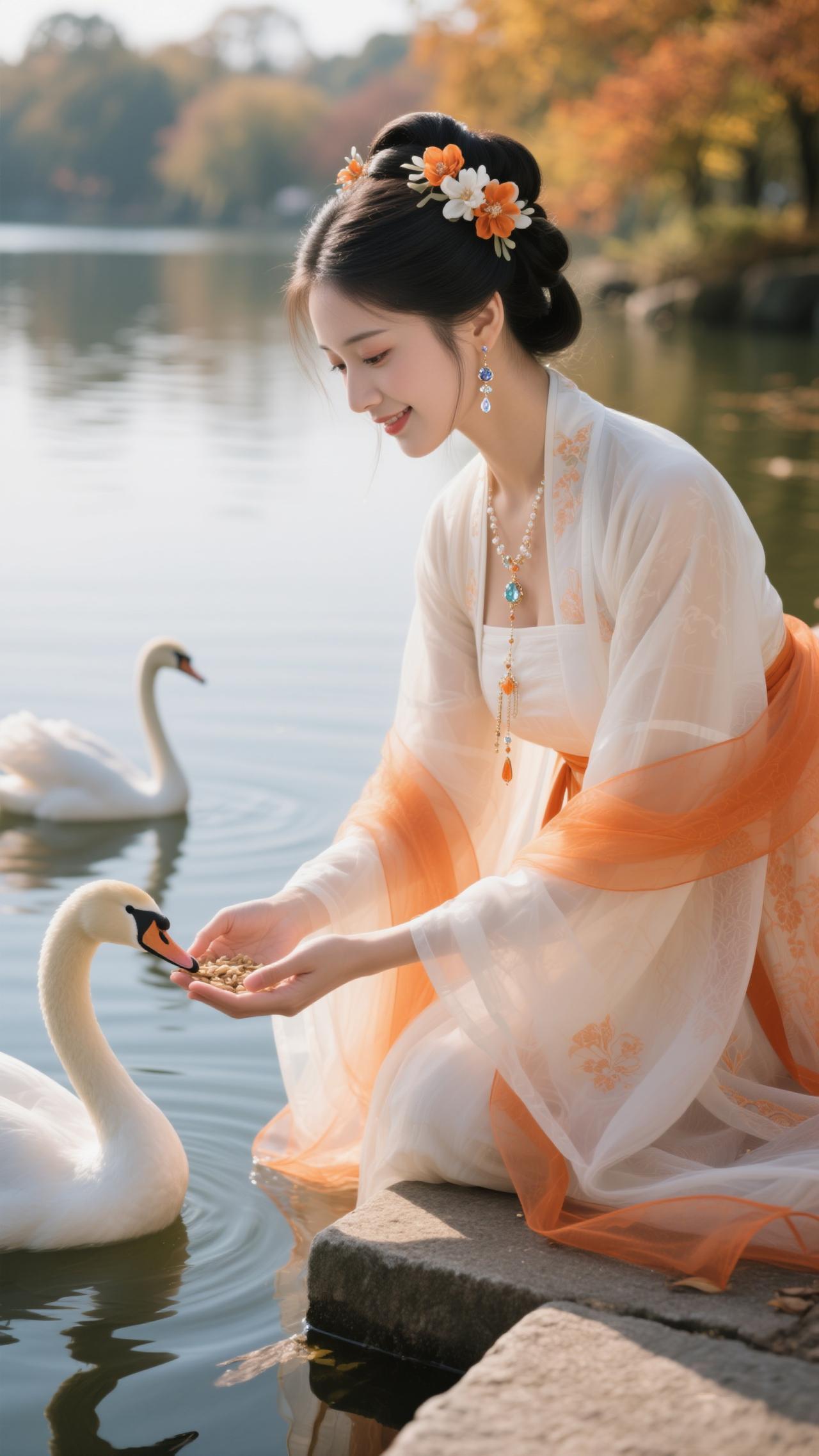 《点绛唇·秋湖饲鹅》 橙缕萦纱,白衫轻惹枫边露。 兰香盈袖,鹅颈偎纤手。 波
