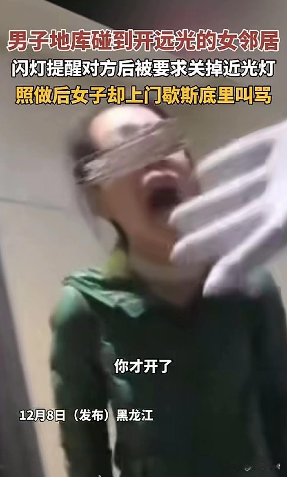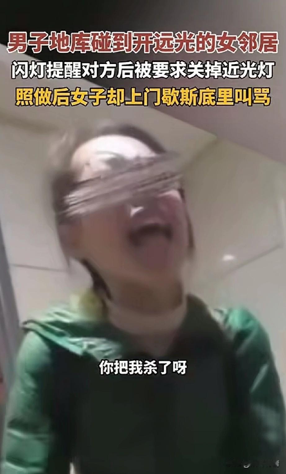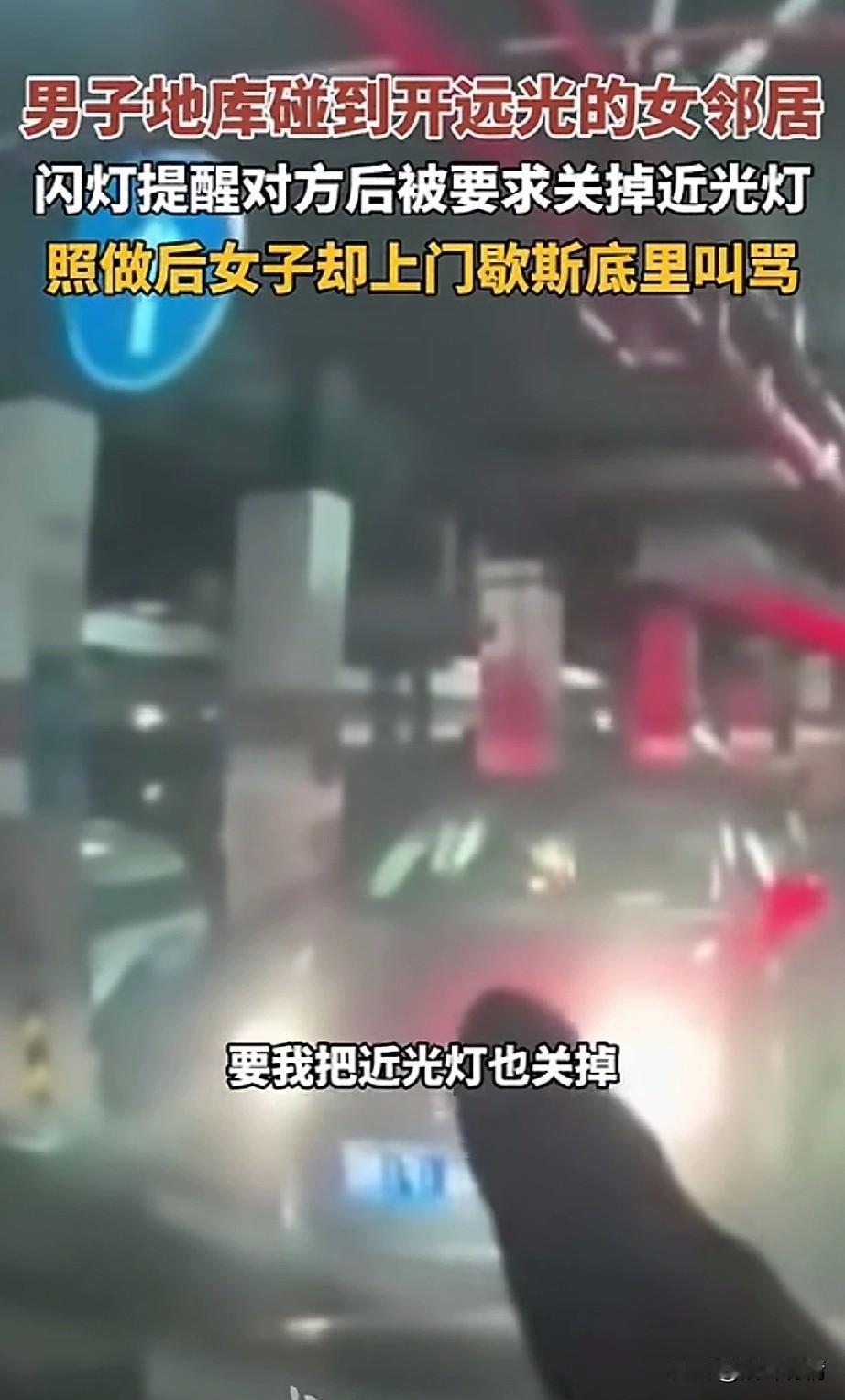 男子地库开车碰到女司机, 用闪光灯提醒对方, 因为对方一直开的远光, 没想到自己善意的举动, 竟然被女司机叫骂, 还让他关掉近光灯, 男子以为忍气吞声就完了, 没想到女邻居居然找上了门, 开门就对自己疯狂输出, 说她被闪到眼睛, 眼睛很不舒服, 男子表示你一直开远光灯, 让对象来车看不清, 女司机听后大吼大叫, 表示自己根本没有看远光灯, 男子很无奈, 只能请物业调出了监控, 面对铁一般的事实, 女邻居不但不认错, 态度更加凶恶起来, 女邻居赌你不敢打女人, 于是就蛮不讲理, 这要是在国外, 估计秒变贤妻良母, 不听话是真的要被打, 大家对于这样的女邻居怎么看? 女司机 后车远光 逆行打人女司机 地库车灯
