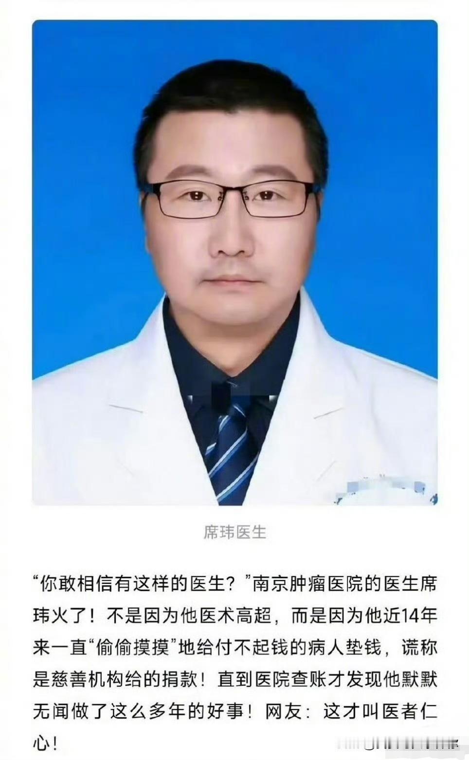 这年头医院查账,通常想的都是账目要清晰规范。可南京肿瘤医院在一次普通对账时,却意外发现了一笔持续了十四年的隐形支出。这些钱悄无声息地进入贫困患者的账户,记录上写着慈善捐款,来源却都是同一个名字,肿瘤科的席玮医生。 他从2005年起就开始这么做,碰上因为经济困难打算放弃治疗的病人,他就默默转过去一笔钱,然后告诉对方,这是慈善项目的拨款。他怕直接给钱会让人难为情,早年他试过,结果病人知道后反而羞愧地凑钱还他。后来他就一直用这个借口,让接受帮助的人心里能好过一点。 十几年下来,他帮了超过两百个病人,垫进去的钱超过了五十万,而这几乎是他收入的一半。他自己家里并不阔绰,有房贷要还,孩子用旧书包,妻子的睡衣甚至带着补丁。那些原本能给家人添件新衣或安排一次旅行的钱,就这样一次次被他换成了病人的缴费单。 这件事让我觉得,一个人能持久地做一件事,不在于喊得多响亮,而在于心里是否真的装下了别人。席医生没有宣扬过什么,他只是看不得病人因为钱而失去机会。这种沉默的善意,比任何高调的宣传都更有分量。它不像一阵热闹的风刮过就散,而是像墙角一块不起眼的砖,默默支撑着那些即将倾覆的生活。 现在很多帮助都讲究公开透明,好像不做个仪式就不算行善。但席玮这种方式,反而保留了一种难得的温度。他让受助者不必背负人情债,让帮助成为一件更纯粹的事。这或许才是善良原本该有的样子,不惊动任何人,只是静静地,就把该做的事做了。 医院的账目最终查清了一个秘密,也让一种最朴素的价值观浮出水面:济世救人,有时不在远方,就在每一次不动声色的搀扶里。