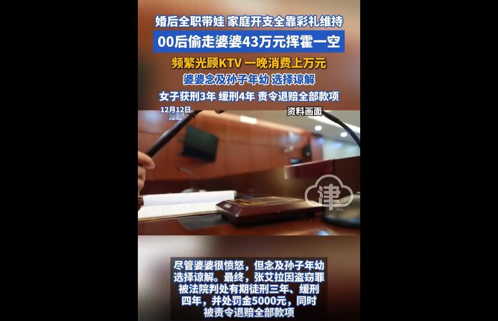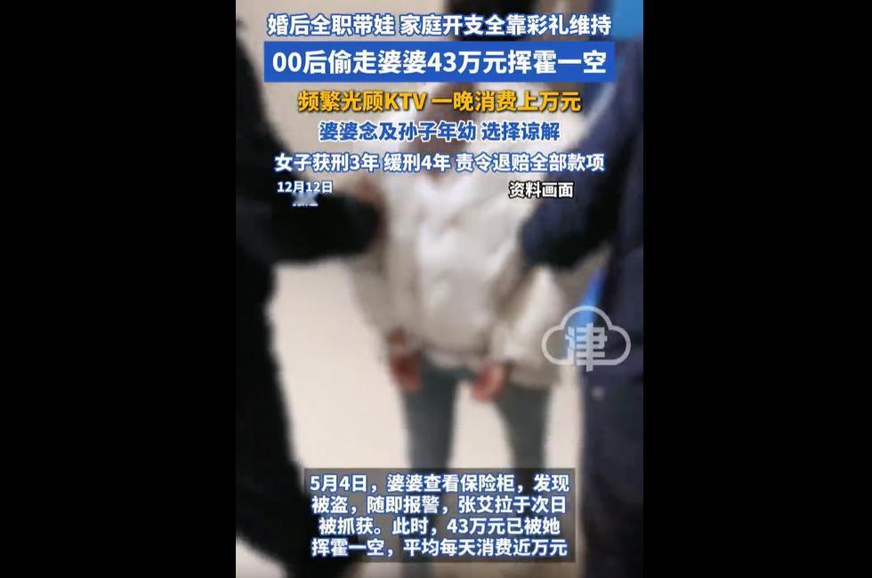 湖北宜昌有个 00 后媳妇张艾拉,2022 年结婚生娃后就全职在家带孩子。 她老公没正经工作,一家子全靠当初的彩礼过活,婆婆每个月就给她 3000 块生活费。 她求老公出去找活干,求婆婆周末帮着带带娃,结果俩人事儿都不干。 2025 年 3 月起,她就雇人开婆婆的保险柜,前后偷了 43 万现金和金首饰,40 来天就花光了,平均一天快花一万。 后来婆婆报警,但看在小孙子的面子上写了谅解书,法院最后判她三年有期徒刑,缓期四年执行,还得把钱赔回去。 这事情干得真是不漂亮! 先骂她那窝囊老公:老婆一天 24 小时围着孩子转,累得快散架了,他倒好,天天在家躺平啃老,连让他出去找个工作都得老婆求着! 这哪是结婚?分明是找了个免费的保姆加生孩子的工具! 现在老婆判刑要出去打工赔 43 万,带娃的担子甩到他身上,他连换尿布都未必会,孩子之前习惯的妈妈陪玩、规律作息全乱了,缺了安全感只会更粘人,他倒好,说不定还会嫌孩子 “拖累”,把气撒在娃身上! 再怼那小气又冷血的婆婆:儿媳帮你家带孙子,一个月就给 3000 块,周末让搭把手都不肯,把保险柜看得比儿媳的命还重! 现在倒好,钱没了,儿媳判刑了,她也得搭手带娃,可她之前连基本照料都不上心,孩子吃没吃饱、哭了为啥都搞不清,长期下来娃能有好状态? 更别说家里氛围紧张,她天天唉声叹气,娃虽小也能感觉到,只会变得胆小怕事! 最后说这媳妇:偷钱犯法肯定没跑,该罚!但她那 40 天狂花 43 万,哪是享受? 明明是被这家人逼到绝路的发泄! 可她这一犯错,孩子不仅没了妈妈贴身照顾,未来考公参军政审还可能受影响,要是长大知道妈妈的事,自卑、怀疑家庭都是大概率的事。 说到底,这家人没一个靠谱的! 老公不扛事、婆婆不心疼,最后遭殃的还是无辜的孩子。 法院判缓刑是讲人情,但要是这俩大人还不醒悟,孩子这辈子都得背着这个家的烂摊子!