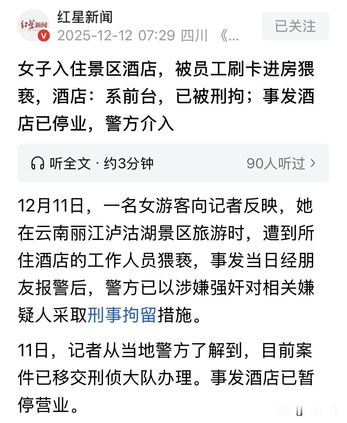 胆大包天!云南丽江,女子独自入住景区一酒店,前台男子看她独身一人,又长得漂亮,就起了色心,竟在半夜持万能总卡刷进女子房间,对睡梦中的女子进行猥亵,女子惊醒后拼命反抗并报警,警方以男子涉嫌强奸进行刑事拘留,事后,酒店的处理方式让女子大跌眼镜。 12月3号,小雨(化名)独身一人来到泸沽湖景区旅游,并入住了当地一家度假酒店。 连续2晚住下来,都相安无事,这也让她彻底放松了警惕。 直到5号凌晨,酒店前台王某(化名)手持万能总卡,像打开自家房门般刷开了她的客房。 黑暗中,小雨从睡梦中惊醒,发现有人正对自己实施猥亵,她在床上拼命反抗。 事发后,小雨向朋友紧急求助,并报了警,当天上午,派出所民警带走了王某,并出具了"涉嫌强奸案"的立案告知书。 出了这档子事,酒店作为管理方自然难逃责任,然而,酒店的态度却是出乎意料的冷漠。 从12月5号到11号,小雨只收到过一条来自酒店轻飘飘的道歉。 在此期间,酒店照常营业,直到12月11号记者介入采访当天,各大预定平台才显示该酒店"暂无房型"。 管理者回应,说王某是酒店前台,每个员工都配有总卡,这是行业惯例。我们承认在管理上存在漏洞,但我们明确规定过,未经允许不得进客房。 言下之意听着就像是:我们规定了,但员工自己不遵守,所以这是员工个人行为。 酒店方还表示,床单和监控都交给警方了。已暂停营业配合调查,但对小雨提出的公开道歉始终未有动作。 泸沽湖管理局工作人员称,已责令酒店整改员工职业操守。而景区方表示,这是刑事案件,以公安结论为准。 这些回应在小雨听来,都像打在棉花上的拳头。 酒店说总卡是“方便服务”,可再方便也不能不经过客人同意就往房间里闯啊!这想想都吓人。 事后酒店的态度也属实让人寒心,就发条微信道歉,继续开门做生意,要不是媒体曝光根本不当回事。 这种做派,既没把客人安全当回事,也没担起该负的责任。 警方处理倒是迅速,立案、刑拘、移交刑侦,该走的程序一步没落,但酒店管理漏洞不补上,类似的事儿说不定还会发生。 另外也要提醒大家,女孩单独住酒店,房门保险插销一定要锁牢! 那么,从法律角度,怎么看待小雨的遭遇? 《民法典》第1198条规定:宾馆、商场、银行、车站、机场、体育场馆、娱乐场所等经营场所、公共场所的经营者、管理者或者群众性活动的组织者,未尽到安全保障义务,造成他人损害的,应当承担侵权责任。 酒店作为经营场所管理者,需对入住客人的人身安全履行合理注意义务。 酒店向员工发放可刷开所有客房的“万能总卡”,却没有建立严格的总卡使用登记、审批及监控机制,比如没有要求双人操作、未留存刷卡记录等…… 这就导致前台人员可随意进入客人房间,已构成对安全保障义务的明显疏漏。 这种管理漏洞直接为嫌疑人实施侵害行为提供了条件,符合“未尽到安全保障义务”的法定情形。 酒店肯定要对客人因管理过失遭受的损害承担赔偿责任。 女游客的损害后果,身体侵害、精神创伤与酒店未妥善管理总卡的行为存在直接因果关系。 即使犯罪行为由员工个人实施,酒店作为用人单位,因未履行必要的安全管理义务,仍需承担补充赔偿责任。 另外,嫌疑人的行为已触犯《刑法》第237条强制猥亵罪,或者第236条强奸罪,需根据证据最终认定。 前台个人需承担刑事责任,而酒店则基于安全保障义务的违反承担民事责任。 这个案子也对旅游行业敲响警钟。酒店“总卡便利”不能成为安全漏洞的借口。 经营者需要重新建立制度规范,比如总卡使用双人签认、员工培训,如禁止擅自进入客房的刚性约束等措施,切实履行安全保障义务。 对于这件事,你怎么看? 欢迎关注@一案一论