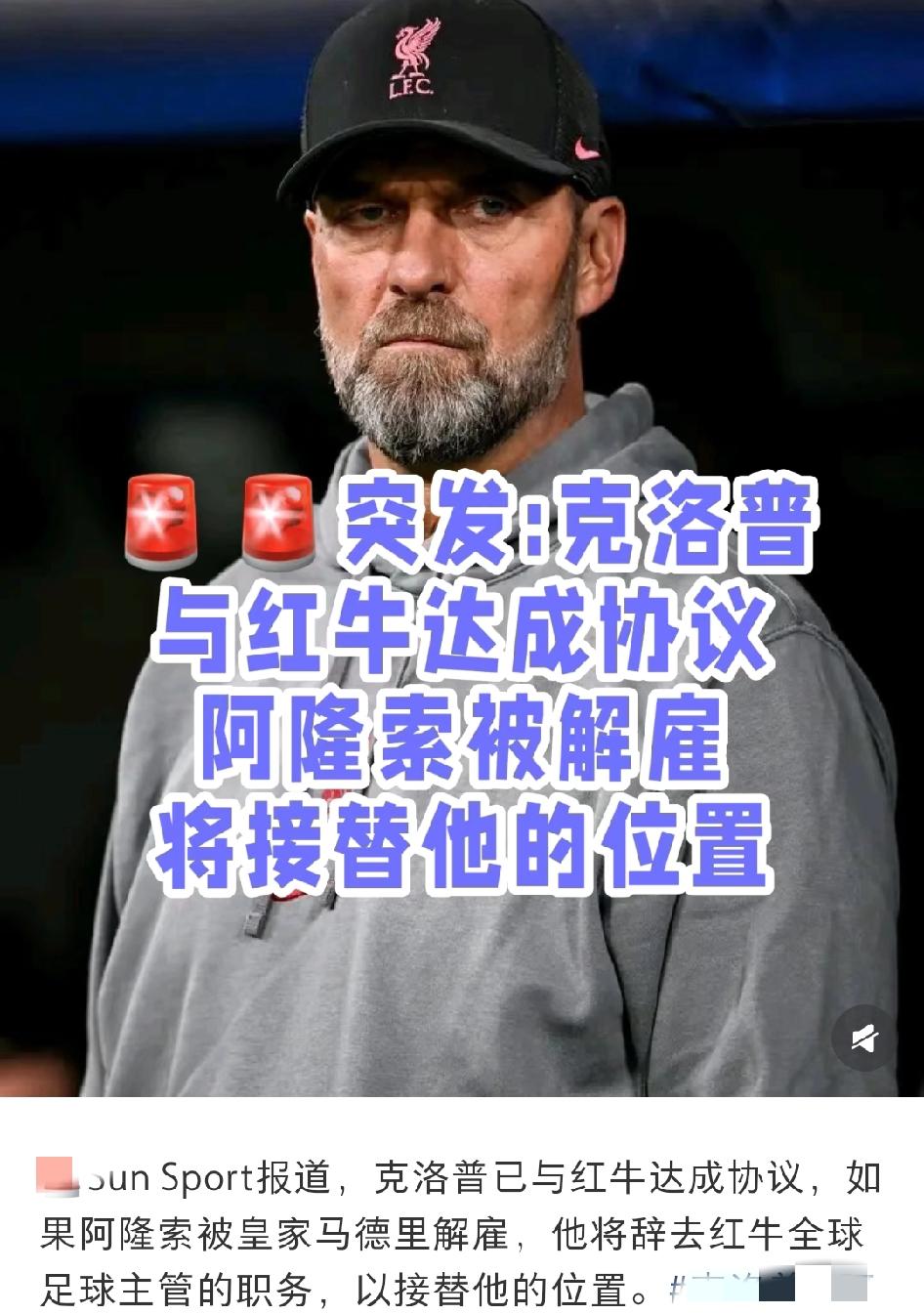 英国知名媒体《太阳报》报道:如果阿隆索遭解雇,克洛普将执教皇马。 按太阳报的说法,克洛普已经和现在的东家达成了协议。这么看来,只要老佛爷一声令下,皇马球迷将迎来心仪已久的主教练。 当然,太阳报没有天空体育这么权威,不过无风不起浪,太阳报在捕风捉影这方面还是很有特色的。