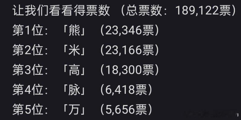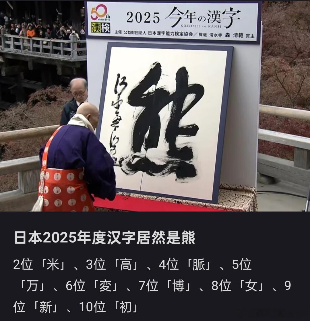 🔻日本正式揭晓,日本2025年度汉字是「熊」🔻第1位: 「熊」 (23,346票) 🔻第2位: 「米」 (23,166票) 🔻第3位: 「高」 (18,300票) 🔻第4位: 「脉」 (6,418票) 🔻第5位: 「万」 (5,656票) 🔻「米」和「熊」仅相差160票。 日本年度汉字为熊 海外新鲜事