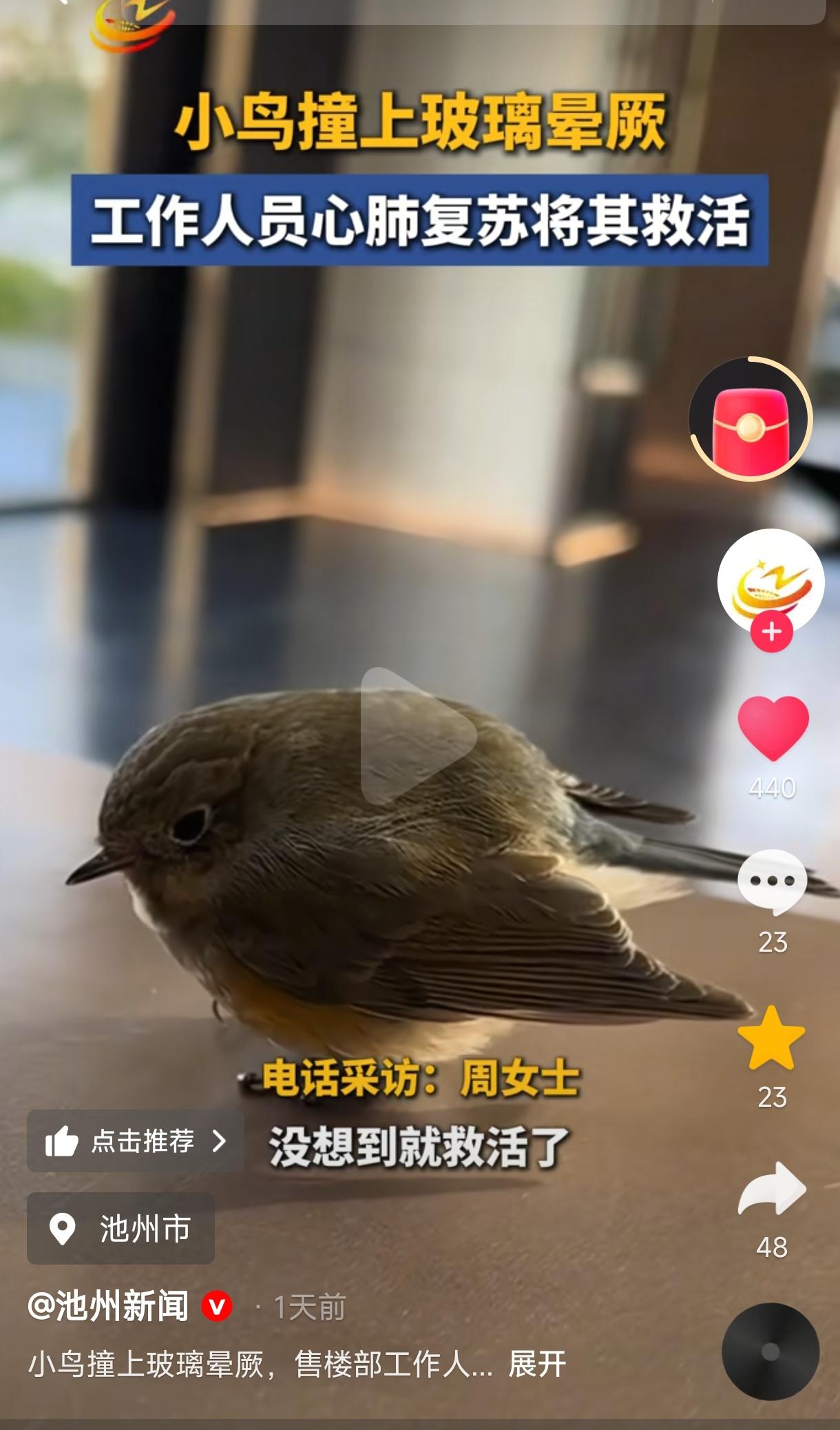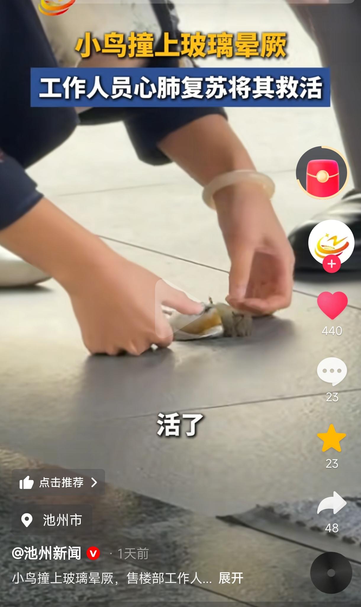“太神奇了!” 一只小鸟撞玻璃晕厥,躺在地上一动不动,生命垂危之际,一位好心姑娘见状,耐心地给小鸟做起心肺复苏,男同事以为她只是尝试一下,没想到在姑娘的一番操作下,小鸟很快就扑愣起翅膀,活了! 惊得男同事目瞪口呆,不敢相信自己的眼睛。网友:这姑娘真是人美心善,谁娶到她一辈子荣华富贵。 (来源:山西日报、池州新闻) 12月10日,安徽合肥,一家售楼部里,一只小鸟撞到公司玻璃幕墙,一下就从高空坠落到地上,当即晕厥过去,躺地上一动不动。 看上去,真是凶多吉少~~ 一好心售楼部姑娘见状,赶紧跑过来,蹲在地上,用两只大拇指轻轻按在小鸟的胸B上,小心翼翼地给它做起了心肺复苏。 视频里,看姑娘两只大拇指的动作,十分有节奏,而又熟练,不像是一位生手,想必以前经常救助小鸟。 另一位男员工见状,心想给小鸟做心肺复苏,这不闹着玩吗?不过也好奇地跑过来,蹲着看救助结果。 没想到在男员工的心生质疑中、在姑娘的一番耐心操作下,已经奄奄一息的小鸟,竟然扑棱着翅膀,活了! 生命如此脆弱,却又如此坚强~~ 一旁的男员工不可思议地抱头连声惊呼:“哇哇哇......” 远处的同伴们也是十分开心,见小鸟还没飞起来,又提醒姑娘:“再按一会儿。” 姑娘又继续用两只大拇指轻轻地、有节奏按压小鸟胸B,按压了二十多下后,便松开了手。 这下,神奇的一幕发生了:小鸟竟直接从地上翻身站了起来,鲜活如初,就像从没受过伤一样。 小姐姐看着活过来的小鸟,激动不已,用手疼爱地轻抚着小鸟,那一刻,她自豪又幸福。 据说这种事常有发生,因为售楼部玻璃擦得很干净,鸟儿们误以为没有玻璃,谁知一下就给撞晕了。 最初女员工们也救过小鸟,但没有救回来,后来一位小姐姐灵机一动:人可以做心肺复苏,那为何小鸟不能? 于是尝试给小鸟做心肺复苏,没想到真的救活了! 有网友说,看到小鸟“活了”的一瞬间,我也跟着握拳庆祝了。 也有网友说,姑娘人美心善,谁要是娶到她,一辈子荣华富贵。 还有网友说,我花1500买了一只鸟,第二天就撞玻璃上,没一会儿就死了,早知我也做心肺复苏了。 小姐姐的善行,不是简单的“爱心善举”,而对自然界中“生命平等观”的生动践行。 当人类愿意为一只微小的飞鸟,放下脚步、倾尽耐心,用专业与温柔对抗死神时,我们看到的是最动人的文明底色。 小姐姐没有把救助小鸟当作“试试而已”的消遣,而是以对待生命的敬畏之心,践行着救助的责任。 在很多人眼里,小鸟的生命轻如鸿毛,其晕厥甚至死亡不过自然常态,但小姐姐用行动证明: 生命不分尊卑,每一个鲜活生命的存在都值得被全力以赴地守护。 这件事也告诉我们:人与自然的和谐,从来不是遥远的口号,而是藏在每一次对弱小生命的善待里,藏在每一份不轻易放弃的温柔里。