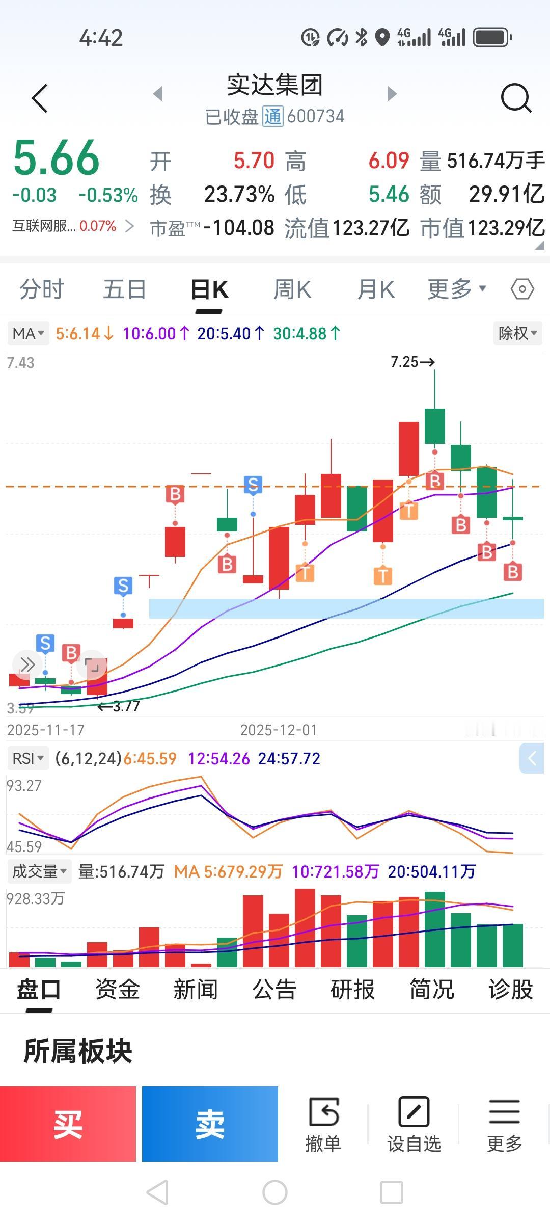 又一次,到嘴的肉飞了。 早盘实达集团回调至5.5元,我果断加仓1000股。随后股价直线拉升,最高冲至6.08元,心中狂喜:“要涨停了!” 结果下一秒便快速回落,反复震荡后收于5.66元。转眼浮盈变浮亏,三千多块账面利润蒸发。 明明想过6元卖出,回落再接,赚个差价。可贪婪总在那一刻占据上风:万一封板呢? 股市里,最难的永远是战胜自己。