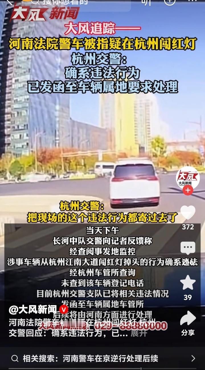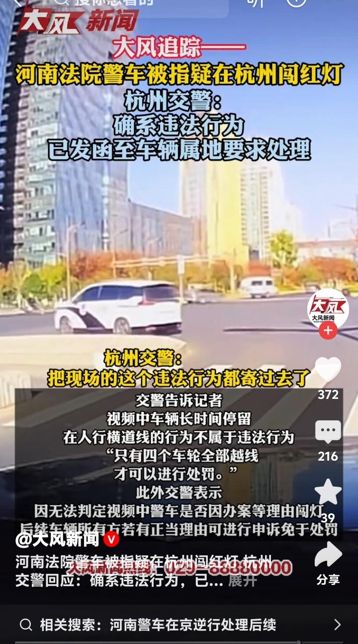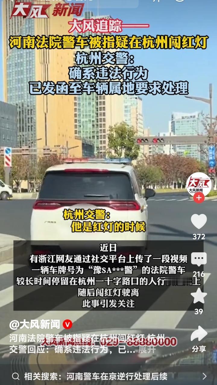 河南法院警车杭州街头闯红灯真相曝光!交警一纸公函揭开跨省执法特权遮羞布,网友怒问
