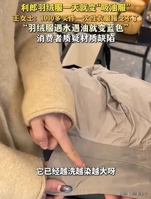 湖南,一女子花1000多,给老公买了件羽绒服,结果只穿了一天,领口和袖口就出现明显油印,水洗后油印不仅没掉反而晕开得更大,溅到水的地方也变了色。女子认为衣服质量有问题,拿回门店想换一件,但门店表示是穿着不当,拒绝退换。 最近降温了,女子想给老公买一件羽绒服御寒,于是去了当地一家门店的专柜挑了一件,花了1000多块。 结果没想到,她老公就穿着上了一天班,而且全程就在办公室待着,下班回家一脱衣服,女子直接懵了。 整件羽绒服表面,沾着很多密密麻麻的黑色小颗粒,擦都擦不掉,尤其是领口和袖口,出现了好几块明显的油印子。 女子赶紧拿去用水洗,想着洗干净就好了,可洗完那些油印子不仅没消失,反而晕开了,越洗范围越大,连衣服上不小心溅到水的地方,都变成了蓝色,根本没法再穿。 女子觉得肯定是羽绒服质量有问题,第二天一早就拿着衣服找到门店,想要换一件。可门店的态度强硬,说这不是衣服质量问题,是穿着不当导致的,不退不换,让女子自己想办法。 女子特别委屈,明明就是正常穿的,后来协商不成,就找了媒体曝光。媒体一介入,加上监管部门的协调,门店那边才松了口,最终同意给女子换一件新的羽绒服。 事后有懂行的业内人士说,这种新羽绒服一穿就吸油、沾灰,还洗不干净,大概率是品牌为了节省成本,偷工减料了。 正常的羽绒服面料,都会做防水、防油、防污三道防护工序,这样才能挡住灰尘和油污,而女子买的这件,估计是直接省略了这几道关键工序,面料本身就有问题,所以才会出现这种情况。