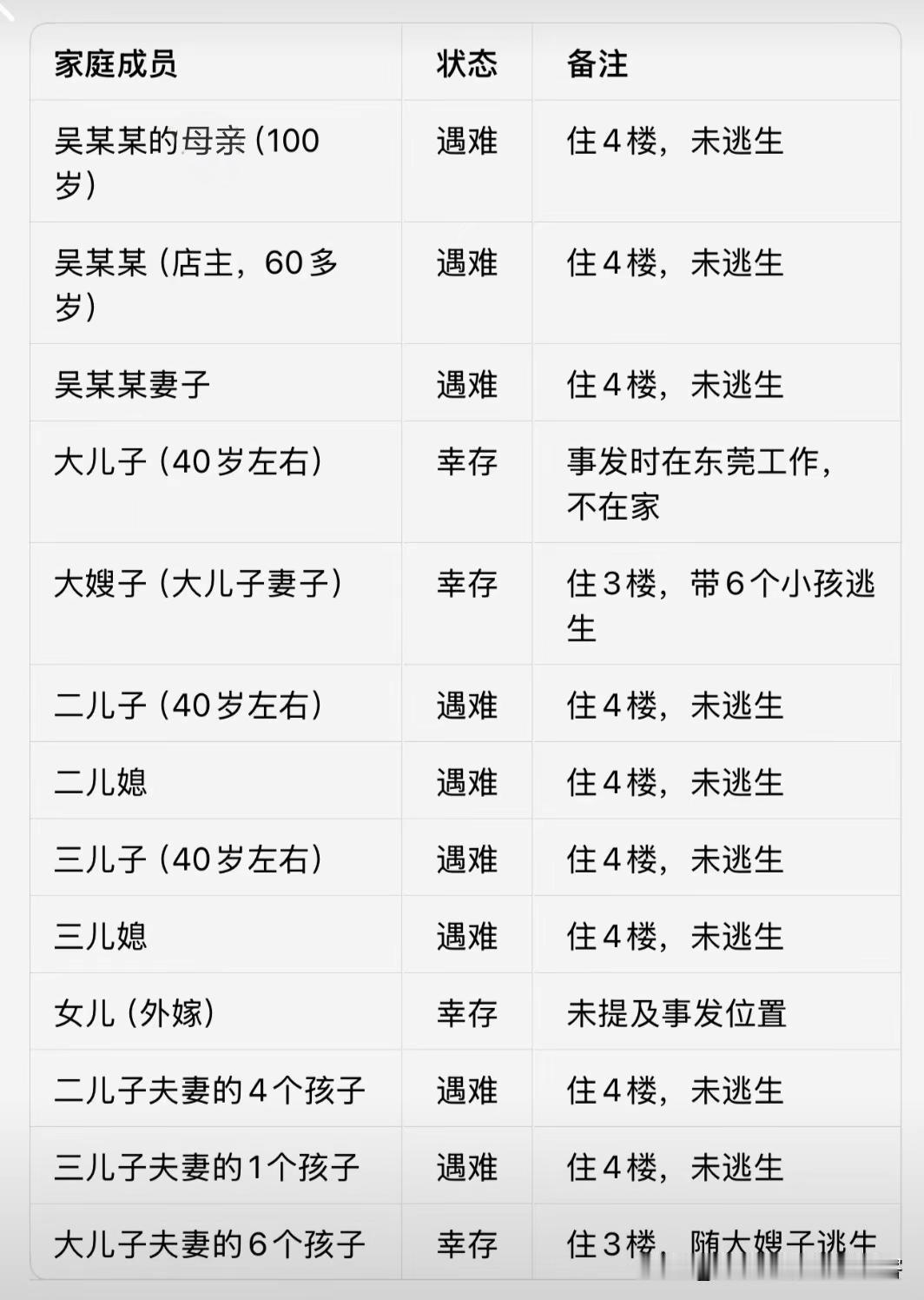 汕头五金店大火,这位大媳妇真的很勇敢!起火时,10岁的大女儿先冲出来,她带着另外5个孩子正在三楼,她没慌,果断带领孩子冲向后门方向。 她先徒手带出2个年幼孩子,正要返回救援剩下3个时,被浓烟和消防员拦下,最终这3个孩子躲在阳台紧闭房门避险,消防员赶到后架设云梯、剪断防盗窗才将他们救出。 这一家子四代人,20多口人,就剩下大儿子大媳妇这一房了(大儿子当晚没在家,逃过一劫)! 目前,大媳妇和救出来的6个小孩,都在医院,他们心里的创伤,一辈子都难愈合了! 周边街坊说,五金店店主一家做生意诚信,待人又和善,平时谁家有困难都愿意帮,却偏偏遭遇这样的横祸,实在令人心痛! 网友表示:这大嫂一看面相,就是有善的女人,有福的人! 据说是他们楼下在给电瓶车充电,有可能发热着火了,再加上是五金店,店里有不少易燃物。 万幸的是孩子大部分救出来了,这个家还有希望。 各位读者,大家怎么看?欢迎评论区留言讨论!