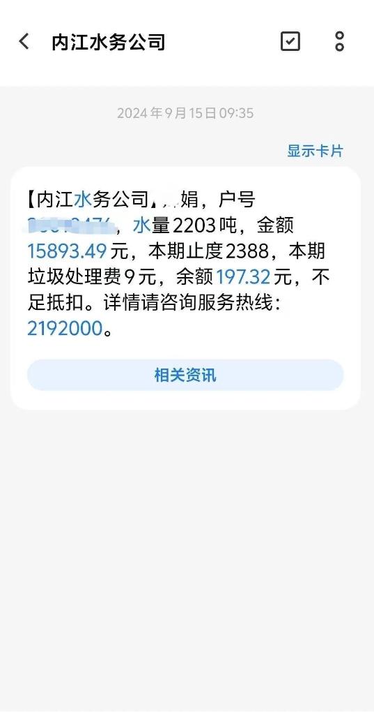 “水管漏水和我有什么关系?”四川内江,女子收到水务公司发来的通知,说她两月用水2203吨,水费高达1.5万余元,女子直接傻眼,后来发现漏水点为地下水管,可水务公司却声称漏失应由用户负责,这让女子觉得很冤枉 李女士介绍,他住的是一个老小区,平时两个月用十吨水,水费四十块左右,这次直接跳到两千多吨,后来检查才发现,是埋在地下的水管漏了。水没漫到路面,家里用水也正常,要不是抄表员发现异常,根本无从知晓 水务公司的人来看过,确认是水表之后的入户段管道漏水。按照当地条例,水表后的管道归用户维护,损失该用户承担 李娟觉得委屈。她的理由很简单,老旧小区的管网本来就老化严重,地下管道肉眼不可见,也没人提前提醒风险。用户根本不可能每天去钻地下检查,出了问题却要个人承担全部漏失费用,这件事怎么看都不太像话 这事在网上传开,不少人都有类似共鸣,有网友说:水表离用户家这么远,又是暗管,谁能看得见,应该将水表装进用户家里,即使漏水也能及时发现,支持不交! 我觉得网友说把水表装进用户家里,这句话其实点到了真正的痛处。不是为了谁方便,而是让用户能看得见、摸得着、发现得了问题。现在这种老旧小区的布局,水表远、管道暗、用户没条件检查,出了事全算在住户账上,确实容易让人心里不平 普通用户不是专业人士,没有设备也没有能力去判断暗管是不是在偷偷漏水。把水表放在家门口,问题一眼就能看到,这笔账至少跑不了那么久 这件事我觉得有三点值得认真想想 第一,老旧小区的水表位置本身就是历史遗留问题,不能再把风险全压在用户头上。早些年的管道设计是按那时候的标准来的,现在出现矛盾,不可能让用户独自承担 第二,供水部门该不该把责任完全推到条例上。条例没问题,可实际情况更复杂。尤其是地下暗管这种隐患,本身就应该被列入老旧小区改造的重点,不能靠住户自己摸黑排查 第三,这类漏水大账单以后应该有更透明的解决方案。比如漏水预警,比如上限减免,比如老旧小区统一排查。不能再让谁倒霉谁买单