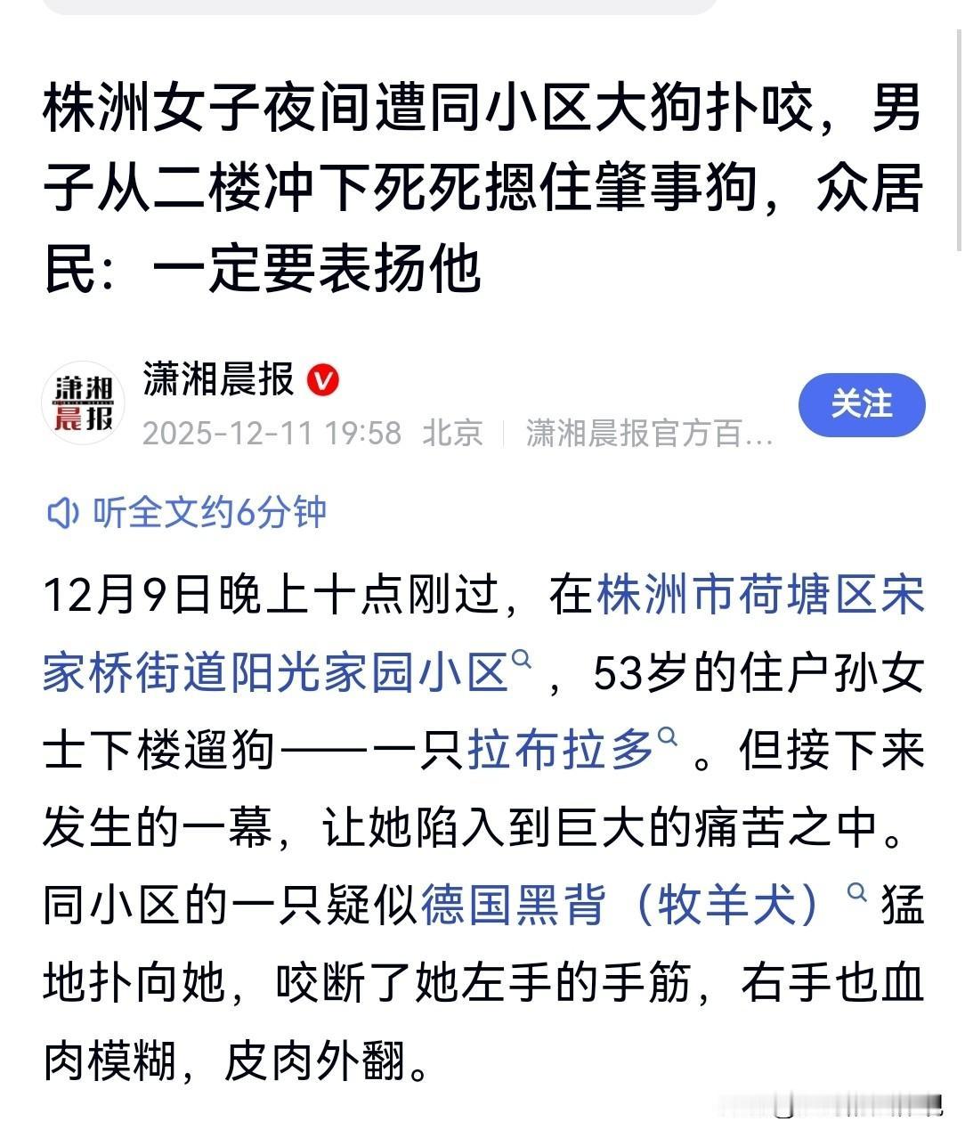湖南株洲,女子晚上10点在小区遛狗,突然被一只黑背牧羊犬扑倒撕咬,左手被咬断两根手筋,右手被撕咬的皮肉外翻。她拼命呼救,面对疯了似的的大狗,没人敢上前,直到2楼的一男邻居,冲过来救人,拼死和大狗搏斗,将大狗压在身下,众邻居齐上手将狗打死。男邻居手也被严重咬伤,鲜血淋漓,两人被警方送往医院。可狗主人垫付1万块钱不露面了。视频曝光后,小区业主纷纷谴责:说自家狗不咬人的,该闭嘴了! 53岁的孙女士,至今躺在病床上,两只手包扎着,她虚弱的说:她的左手,被大狗生生咬断了两根筋。 因被大狗撕咬的时间太长,送到医院时,已经错过了最佳救治时间,有可能会落下残疾。 邻居陈先生为了救他,手同样被狗咬伤,两人都需要打狂 犬 疫 苗。 孙女士家里养了一只拉布拉多小狗,她习惯每天晚上下楼遛狗。 12月9日晚上10点多,孙女士和往常一样,牵着小狗下了楼在小区散步。 不知从哪里冲出来一只德国黑背牧羊犬,朝她扑过来。 她以为黑背是冲着她家的拉布拉多小狗来的,心里一害怕,就松开了拴小狗的绳子,小狗跑开了。 而那只大狗,并没有去追赶,而是直接扑向了她。 那只大黑背十分凶猛,站起来和她的个头差不多,孙女士瞬间被扑倒在地。 大狗撕咬的时候,她用手去挡,被黑背咬住了左手不松口,她又用另一只手去抵挡,又被狗咬住了右手。 她左手的两根手筋被咬断了,右手也被撕咬的血肉模糊,肉皮朝外翻着,深可见骨,血洒的到处都是。 尽管这样,孙女士仍用手抵挡,生怕被狗咬到其他部位,同时她拼命的大喊救命。 当时也有人也在旁边遛狗,但大多是女的。 黑背像疯了似的咬人,人们都躲得远远的,哪敢上前施救。 直到10多分钟后,住在2楼的一位陈先生,听到楼下有人呼救时,穿着拖鞋就冲下楼。 当时他就看到一条大狗扑在一女子身上撕咬。 他丝毫没犹豫,冲上去抓住狗的头部的毛,把它的头拖开。 可那条狗太大了,立起来都和都有1米多高,力气大的惊人。 陈先生把它拖开,救下了孙女士,可大的狗反过来撕咬陈先生的手。 他转着圈想把大狗甩开,但大狗太疯狂了,根本甩不下,陈先生一发狠,直接把黑背死死抱住压在身下。 围观的邻居们有的上前帮忙,有人捡起一把椅子朝大狗砸下去,人多势众才将狗制服,并打死。 有人报了警,警方很快赶到,将孙女士和救人的陈先生送到医院,他们至今还在住院。 孙女士称,她家住的楼栋和出事的地方,只有几十米。 平时看到过咬人的黑背,是被铁链锁着的,那天不知怎么没拴好跑出来咬人。 被咬的陈先生称,那条大狗之前就咬过一个女业主。 可能是被铁链拴的久了,那条狗就跟疯了似的,他一个人根本制服不了。 还是其他邻居一起上前帮忙,才算救下了孙女士和自己。 陈先生的手被咬的对穿,手心、手背都受伤了。 而孙女士的伤更严重,家人无法接受,她的左手两根手筋被咬断。 由于被狗撕咬的时间太长,错过了最佳救治时间,很可能会落下残疾。 孙女士很感激救人的陈先生,住院后,主动垫付了陈先生的医药费。 而狗主人,在事发后拿了1万块钱给孙女士,让她先治伤。 不过狗主人在拿了1万块钱后,一直不再露面了,而现在1万块钱已经花的差不多了。 下一步需要接种狂 犬 疫 苗,自己和陈先生还需要更多的治疗费用。 很显然,这只大狗应属于城市大型禁养犬只。 从大狗之前就咬伤过业主来看,狗主人很可能长期对这只黑背疏于管理,导致狗没栓绳咬伤人。 如果不是陈先生和众邻居拼命救护孙女士,那天她很可能会被伤的更严重。 小区居民称,陈先生的行为是见义勇为,应受到表扬。 《民法典》第1247条:禁止饲养的烈性犬等危险动物造成他人损害的,动物饲养人或者管理人应当承担侵权责任。 根据城市养犬管理条例,德国牧羊犬属于禁养犬只。 狗主人私自饲养禁养犬,且未拴绳,导致犬只失控咬人,符合“禁止饲养的危险动物”情形,其行为已违法。 法律明确规定,饲养禁养犬造成损害的,狗主人需承担全部民事责任,无免责事由。 因此根据上述条款,狗主人都应承担全部侵权责任。 需赔偿孙女士和陈先生的医疗费、误工费、护理费等相关损失,若后续伤情构成伤残,还需支付伤残赔偿金等。 《治安管理处罚法》第89条:未对动物采取安全措施,致使动物伤害他人的,处1000元以下罚款;情节较重的,处5日以上10日以下拘留。 黑背本是被禁养犬只,当天没拴好跑出来咬人,说明狗主人未对其采取安全措施,导致其咬伤孙女士和陈先生,违反了上述条款。 狗主人的行为情节较重,可能面临5日以上10日以下拘留及罚款处罚。 目前,孙女士希望狗主人尽快出面沟通,协商解决问题,更希望他能承担起责任。 警方称,狗主人在事发当天,已前往派出所配合调查,双方的纠纷看他们自己的协调。 对此,你有什么看法? 关注@赵哥的法律观 明辨是非不上当。