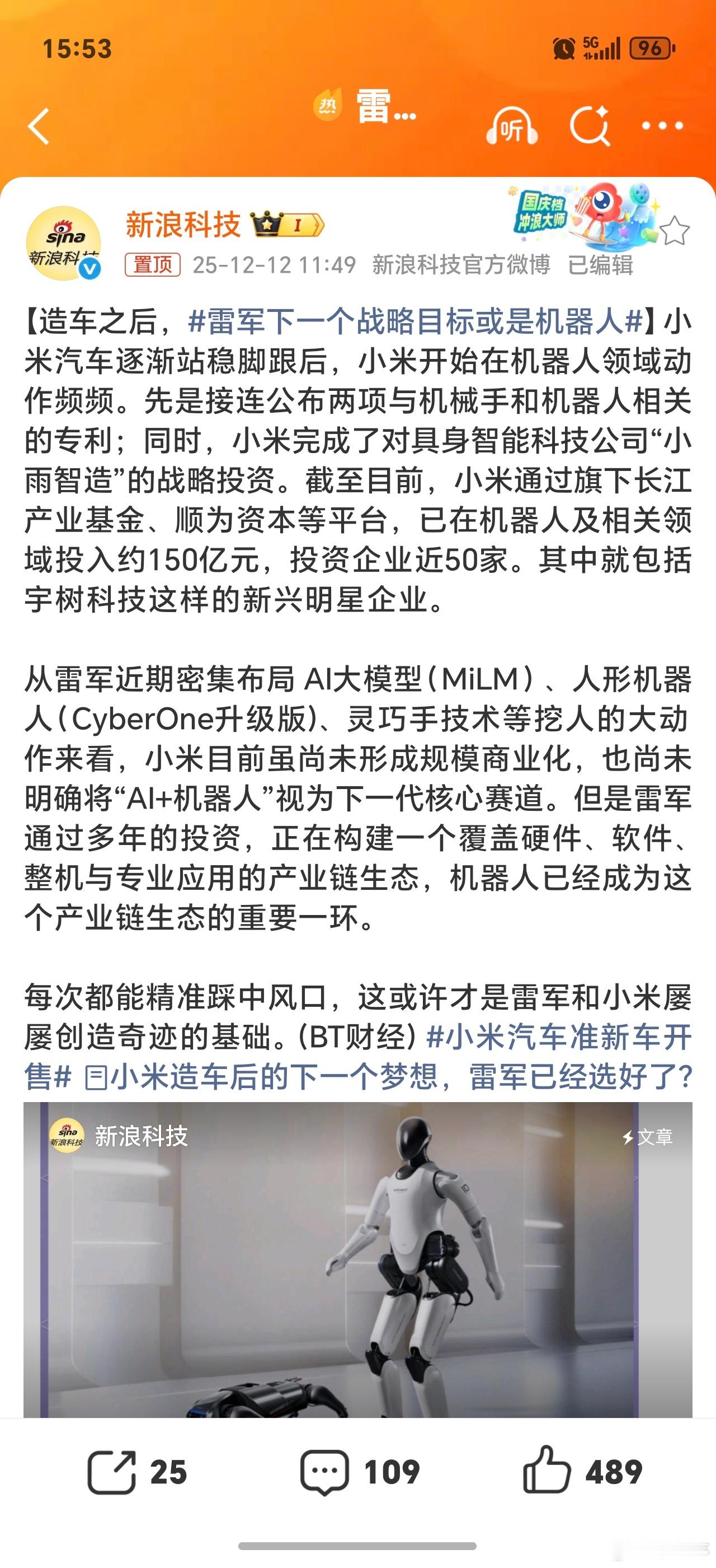 雷军下一个战略目标或是机器人雷军以后真的会入局机器人吗?如果真是这么大的产业布局,估计能再冲击一波首富了!大家期待吗?