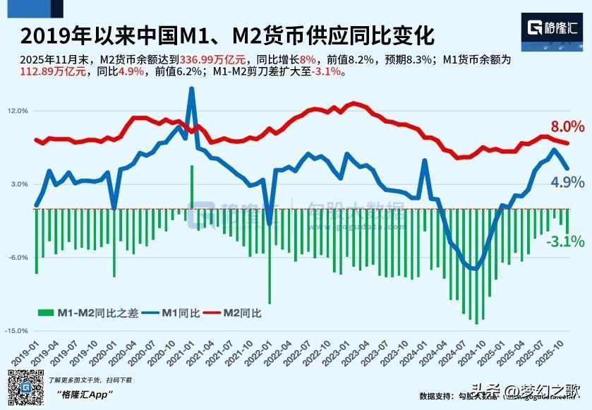 这周股市不好的原因找到了,原来是经济数据不好 A股收盘后,重要经济数据出炉了,数据显示:M2-M1的剪刀差差在扩大。说明市场货币流动性在减弱,资金更愿意在手里或者在银行里面存款,并不愿意拿出来投资,也不愿意拿出来消费。 对于经济来说就是经济活力正在减弱,面临通缩的压力,市场显然也看到了这样的结果,所以这周A股走的并不好。 但对于这种情况,政策上面可能会降息降准来进一步刺激货币活力,所以现在对降息降准有了预期,这是市场原因看到的。
