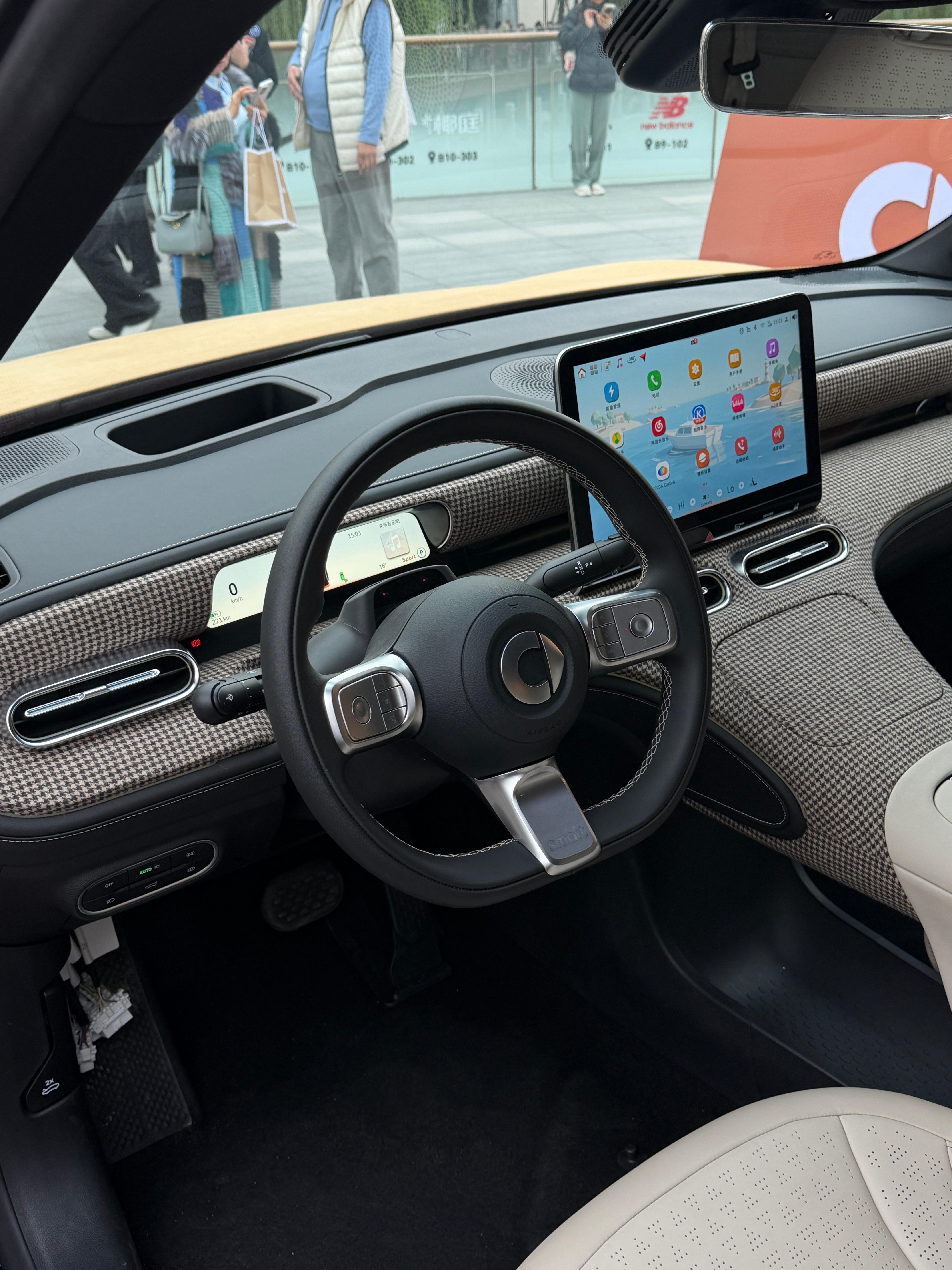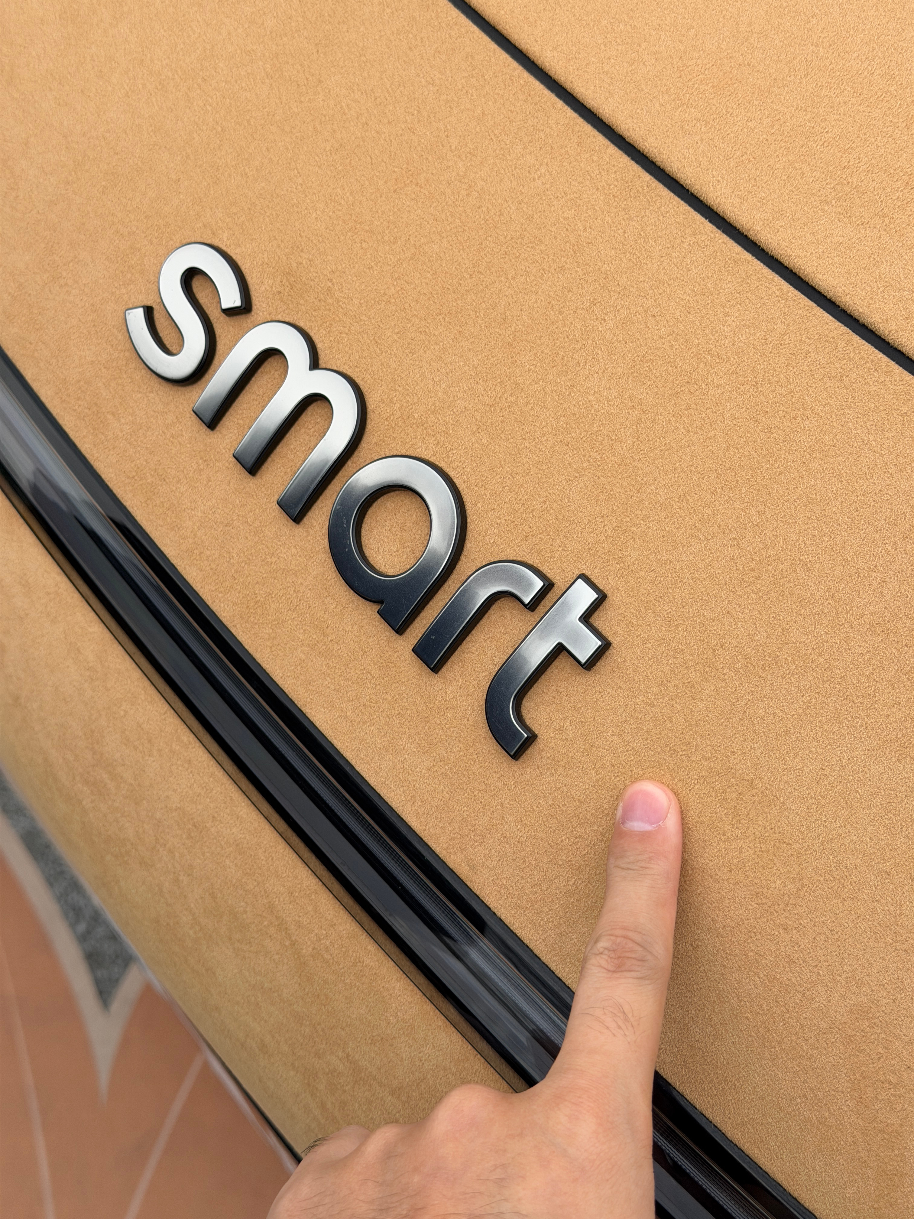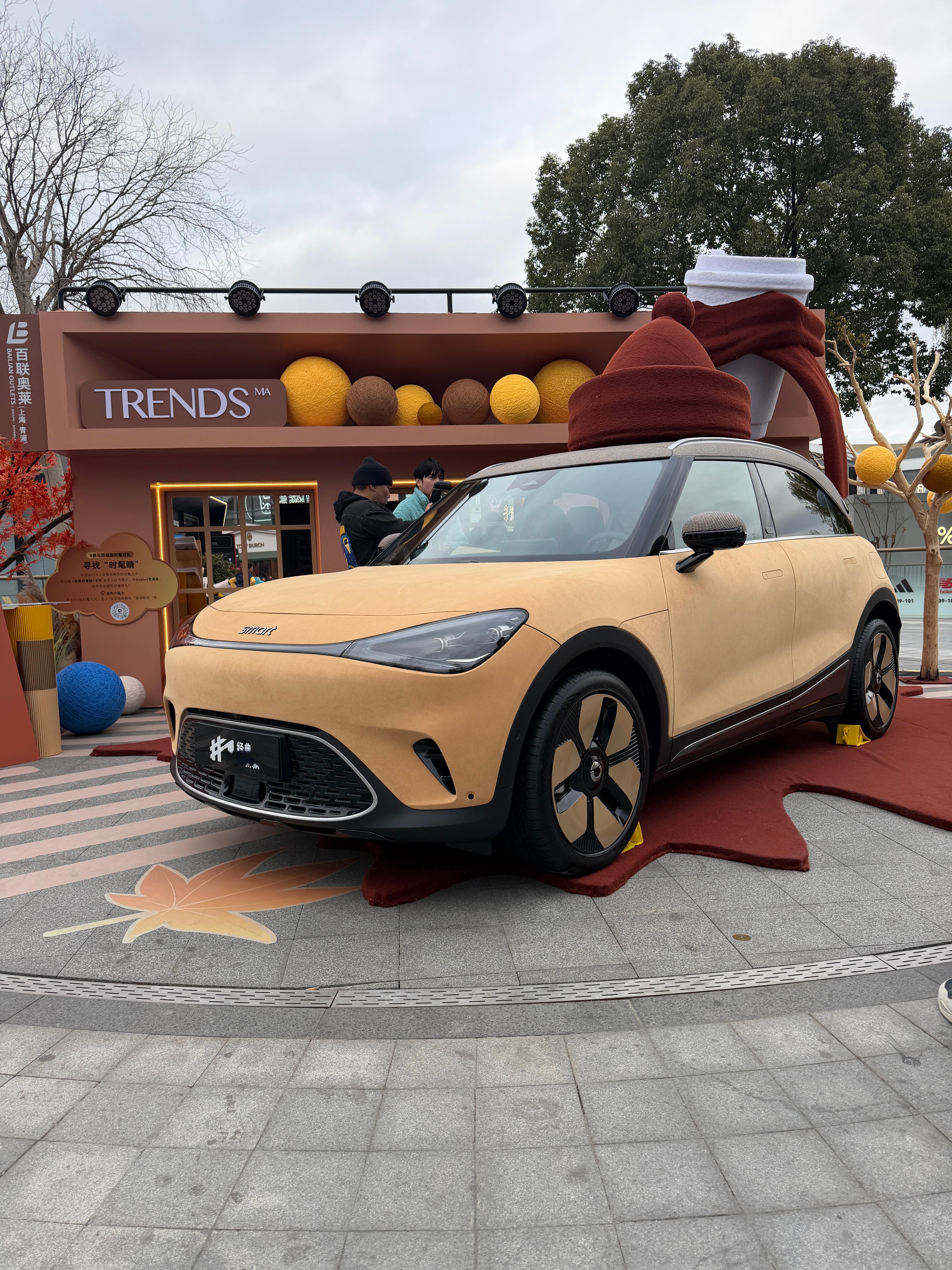 来青浦奥莱看,这个一号不一样,它确实很“秋冬”。首先必须说明,上海的秋冬很特别,双十二的这个光景,路上的落叶才多起来,也就是刚刚追上北方秋天的温度和氛围。这个一号的特别之处就在于,它的车色确实很秋冬。这个版本叫做“漫游棕迹”,颜色是来自于时尚杂志Vogue权威发布的2025秋冬趋势⸺MONOCHROME BROWN。很特别的是,这个版本直接用的是内饰上的奥司维浅棕翻⽑⽪进行的包覆,除了颜色上消除了亮面反射,色温统一度更高以外,本身的优势就是触感很好,摸上去很舒服。对的,现场很多人都在摸这个车,确实很舒服...为了匹配这个风格,轮毂也用到了棕色进行呼应。内饰外用的另外一个地方,是后视镜和车顶的羊毛千鸟格织物。我是最爱千鸟格了,这个千鸟格是经典的黑白格,像是英伦的这种帽子,感受确实很“暖和”。内饰风格也在延续,千鸟格被包袱在门板上、中控台上,这种浅色的纹路配合深色的内饰,视觉上有对比,也有和外饰的呼应。哦对了忘记说了,smart在车侧logo直接搞成自发光的钻石排列了,很精致。现场的人确实很多,大家都在争着去摸这个车外面的翻毛皮材质,还有更多拍照打卡。smart的精髓之一,就是时尚。我可能不是很懂,但是女生确实很多,能看得出这个“内饰外用”+“秋冬棕黄”的路子,确实对味。 上海·百联奥特莱斯广场(上海・青浦)