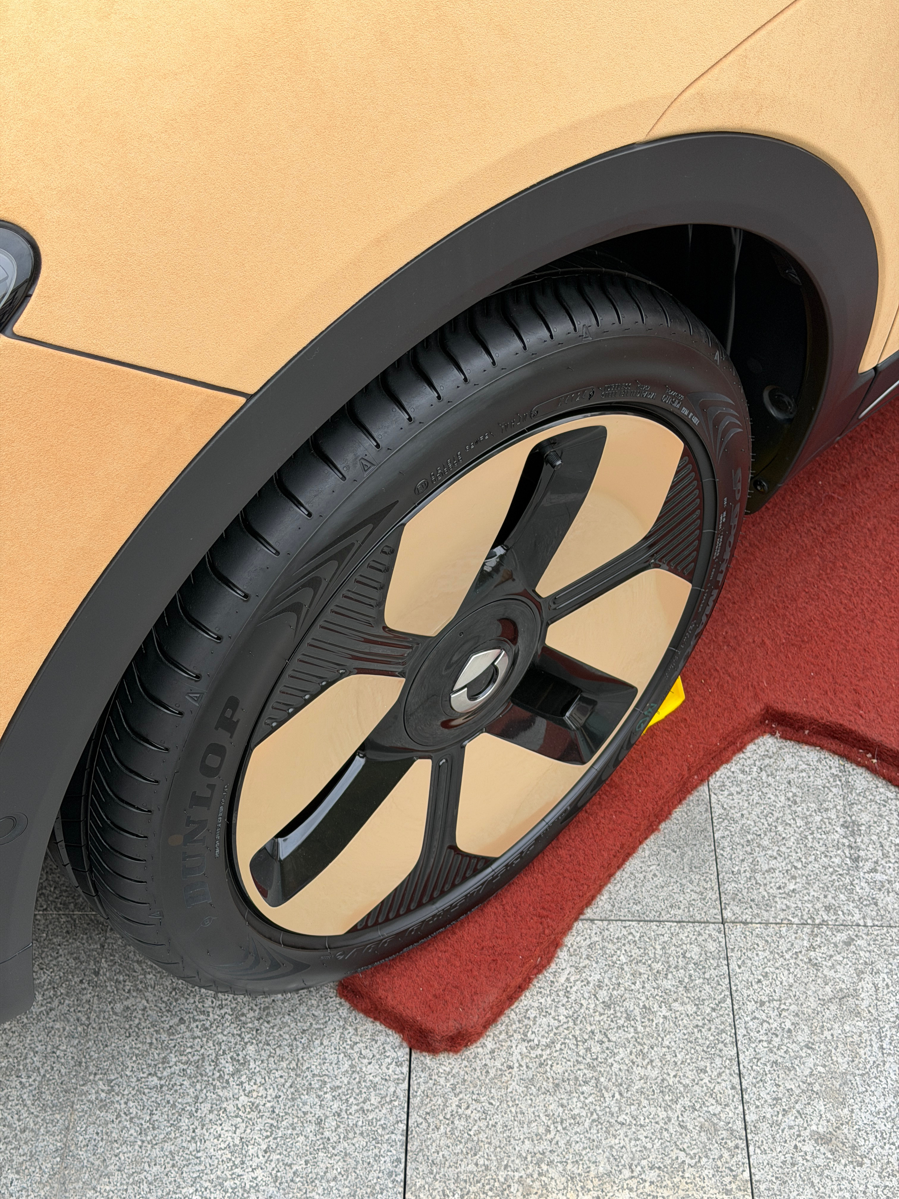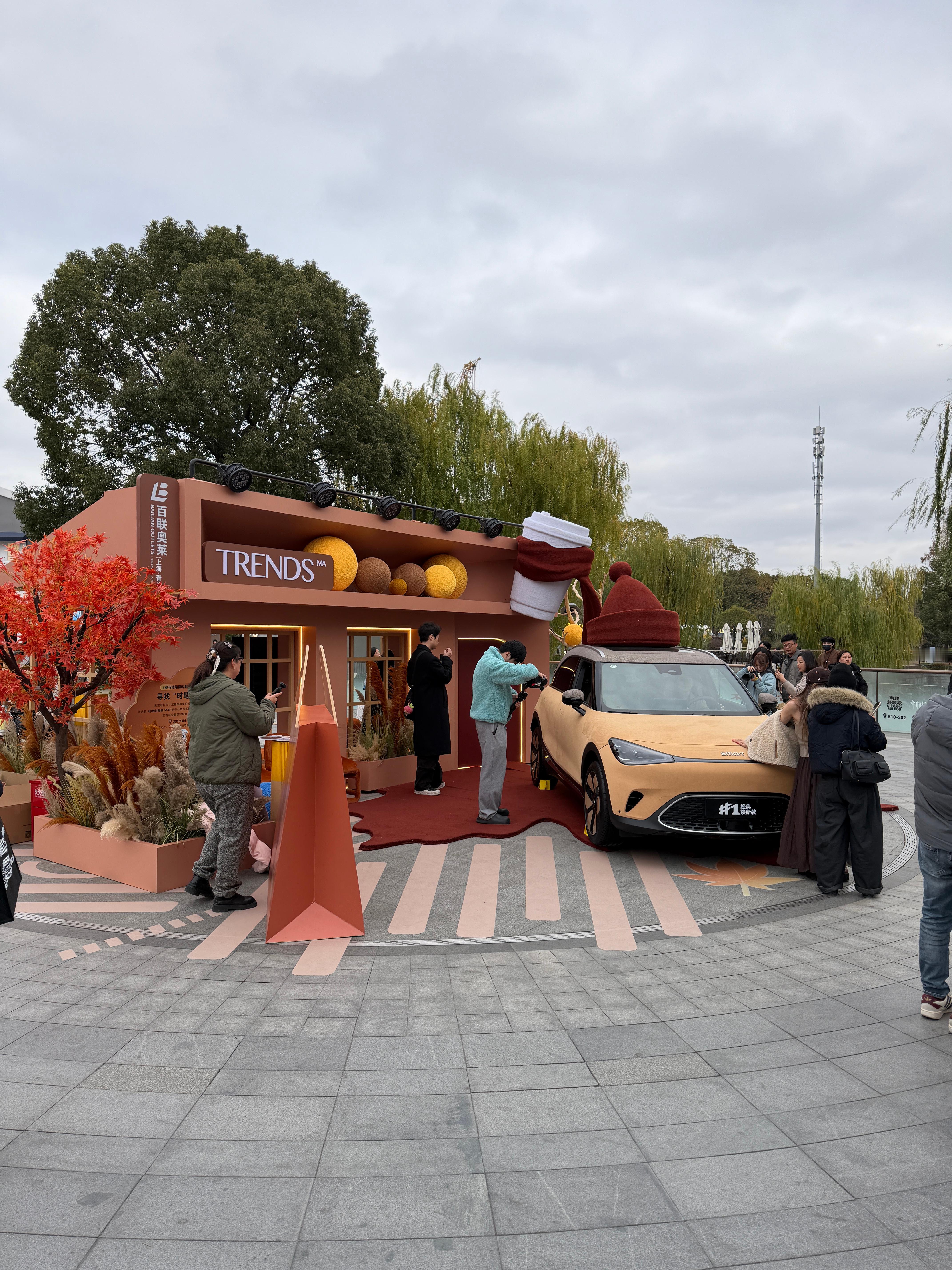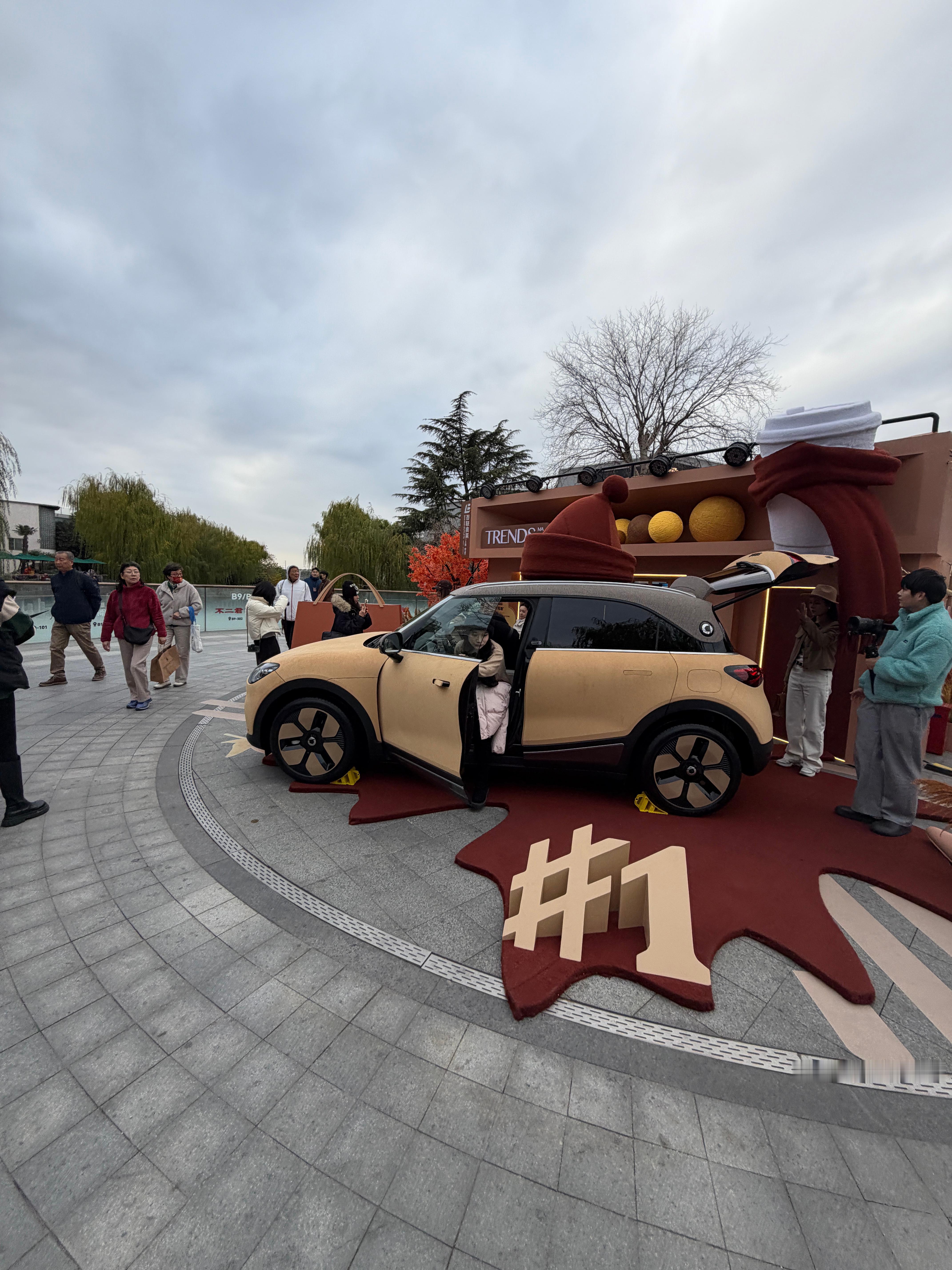 来青浦奥莱看,这个一号不一样,它确实很“秋冬”。首先必须说明,上海的秋冬很特别,双十二的这个光景,路上的落叶才多起来,也就是刚刚追上北方秋天的温度和氛围。这个一号的特别之处就在于,它的车色确实很秋冬。这个版本叫做“漫游棕迹”,颜色是来自于时尚杂志Vogue权威发布的2025秋冬趋势⸺MONOCHROME BROWN。很特别的是,这个版本直接用的是内饰上的奥司维浅棕翻⽑⽪进行的包覆,除了颜色上消除了亮面反射,色温统一度更高以外,本身的优势就是触感很好,摸上去很舒服。对的,现场很多人都在摸这个车,确实很舒服...为了匹配这个风格,轮毂也用到了棕色进行呼应。内饰外用的另外一个地方,是后视镜和车顶的羊毛千鸟格织物。我是最爱千鸟格了,这个千鸟格是经典的黑白格,像是英伦的这种帽子,感受确实很“暖和”。内饰风格也在延续,千鸟格被包袱在门板上、中控台上,这种浅色的纹路配合深色的内饰,视觉上有对比,也有和外饰的呼应。哦对了忘记说了,smart在车侧logo直接搞成自发光的钻石排列了,很精致。现场的人确实很多,大家都在争着去摸这个车外面的翻毛皮材质,还有更多拍照打卡。smart的精髓之一,就是时尚。我可能不是很懂,但是女生确实很多,能看得出这个“内饰外用”+“秋冬棕黄”的路子,确实对味。 上海·百联奥特莱斯广场(上海・青浦)