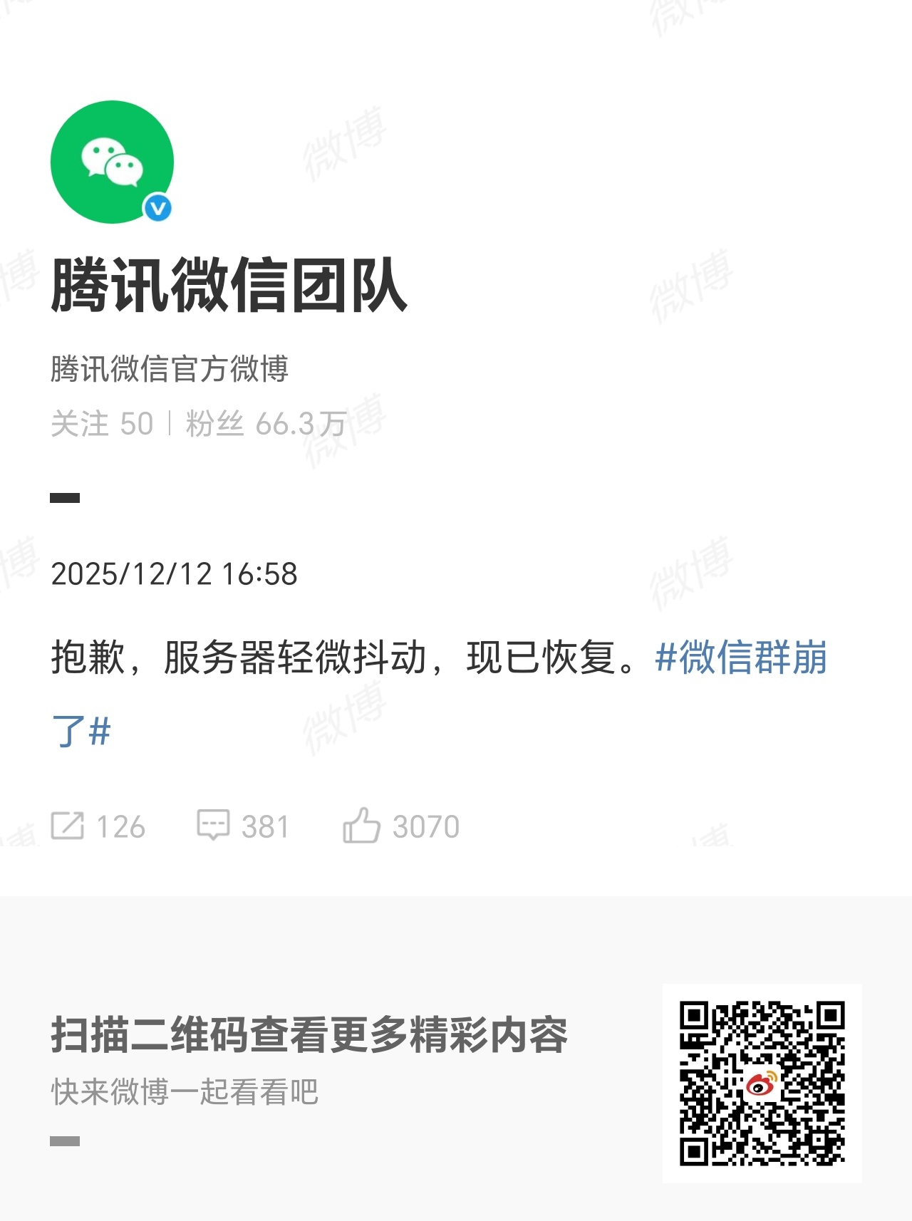 #微信群崩了# 12月12日下午,大量用户反映微信群消息无法发送或同步,相关话题登上热搜,引发“微信群崩了”的集中讨论。之后,发布公告称,“抱歉,服务器轻微抖动,现已恢复。”