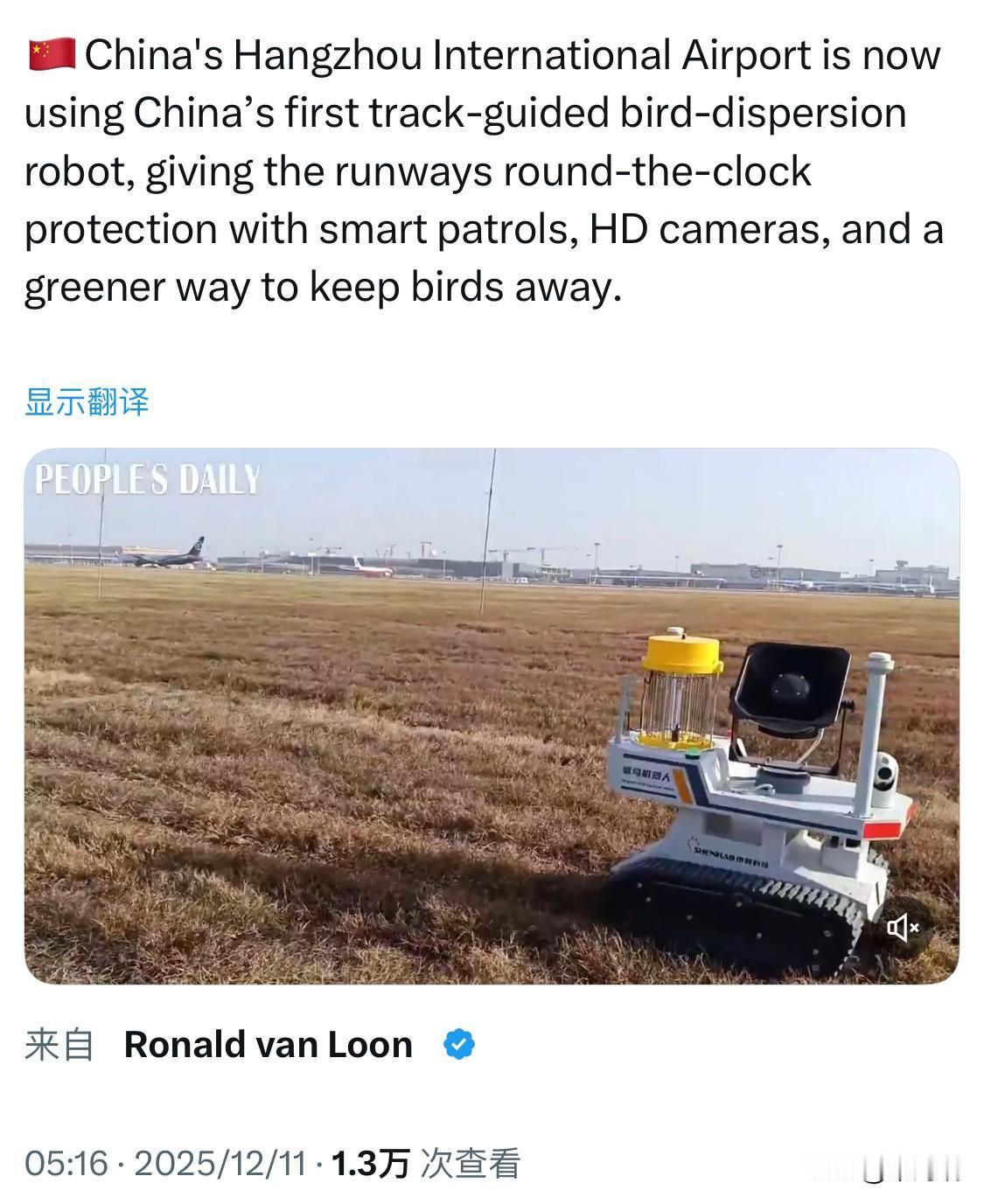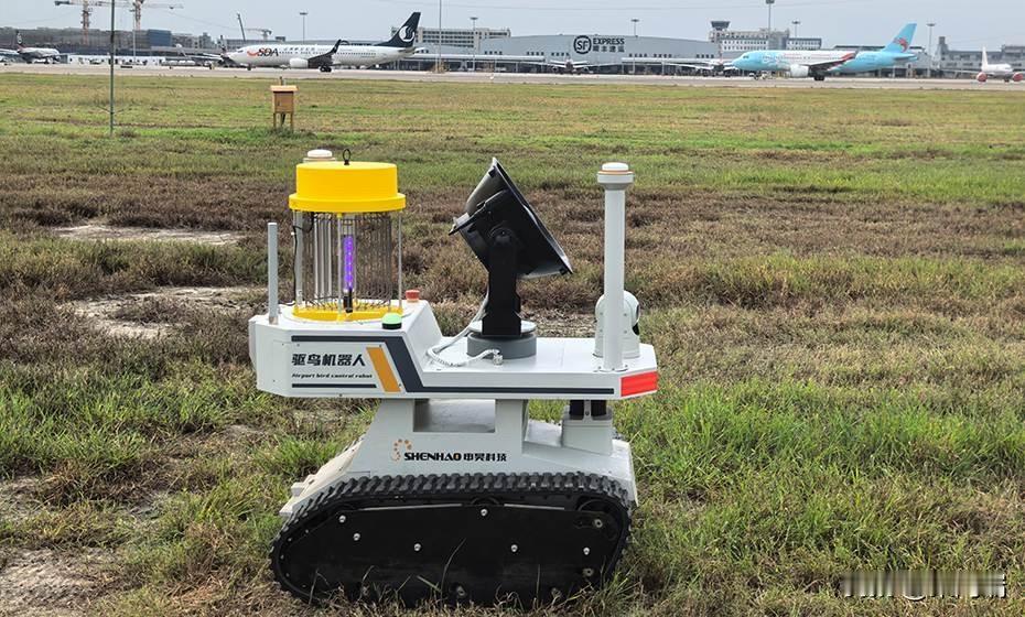 这款由杭州申昊科技研发的履带式智能驱鸟机器人系统,是中国首台套应用于民航机场的此类设备。 主要特点和功能包括: 全天候、全区域运行: 机器人可以24小时连续自主巡逻,不受天气条件(如雨、热、极端温度)限制。 多功能集成: 它集成了定向声波驱鸟装置、灭虫灯和高清摄像头,实现“驱虫+驱鸟+监测”一体化。 智能导航: 采用RTK(实时动态定位)差分定位、3D激光雷达和惯性导航等技术,可以在复杂的机场土面区自主导航和避障。 生态环保: 通过诱捕和消灭昆虫来减少鸟类的食物来源,从而从源头上减少鸟类聚集,是一种更环保的鸟类控制方式。 成效显著: 自2025年10月1日开始验证运行以来,投入使用区域的鸟类活动频次降低了30%。 这款机器人的应用标志着杭州机场在鸟击防范领域从传统的人工巡查向智能化、主动防控迈出了重要一步。