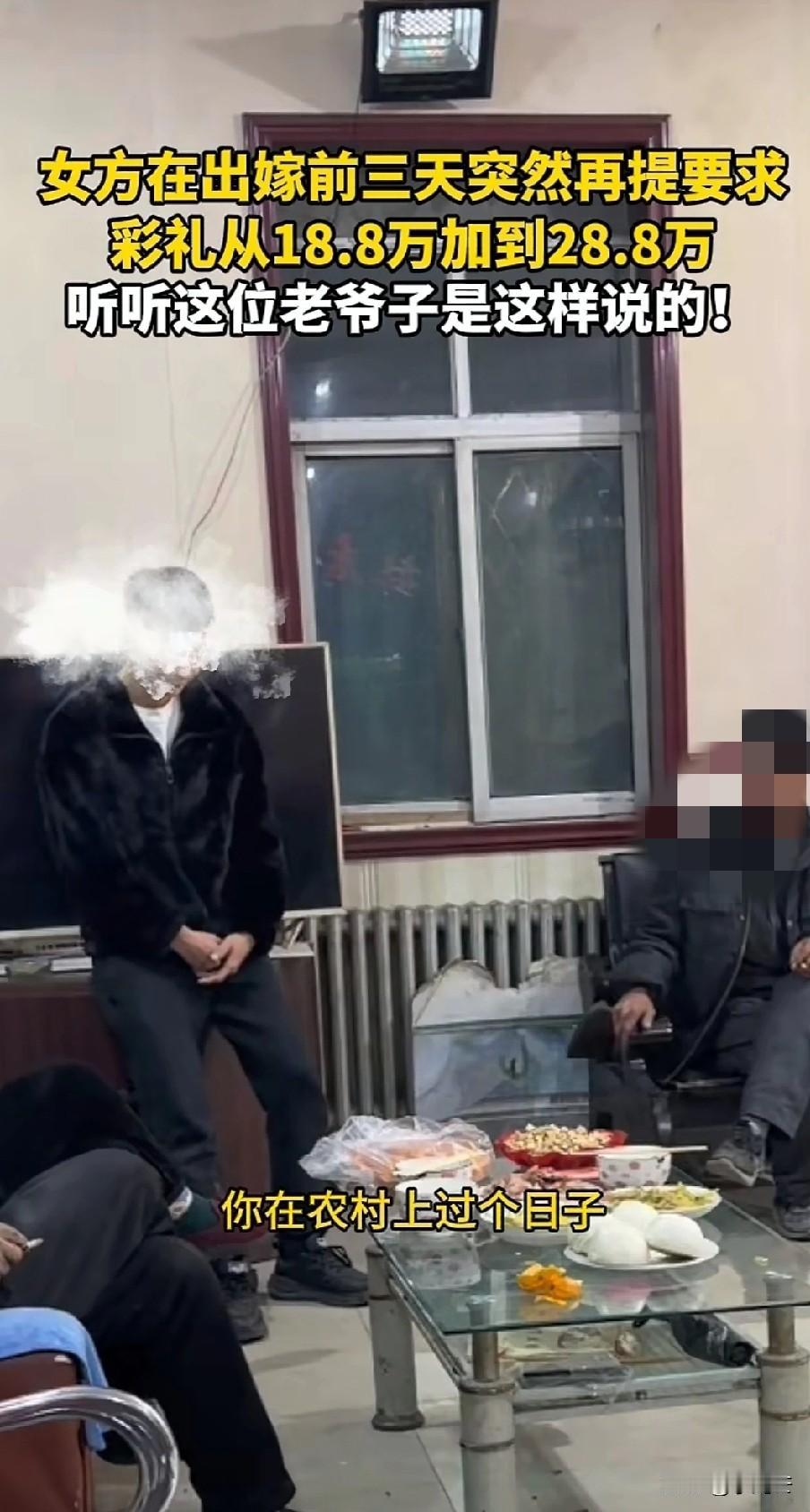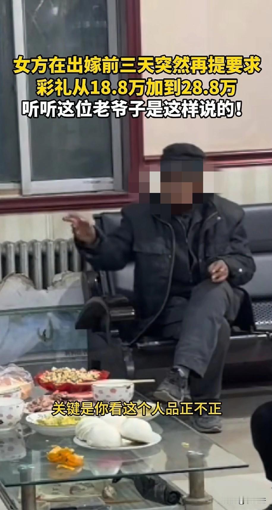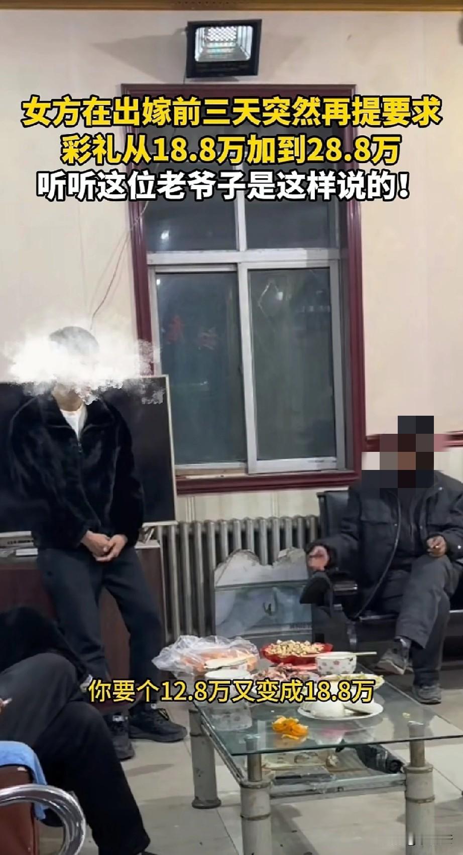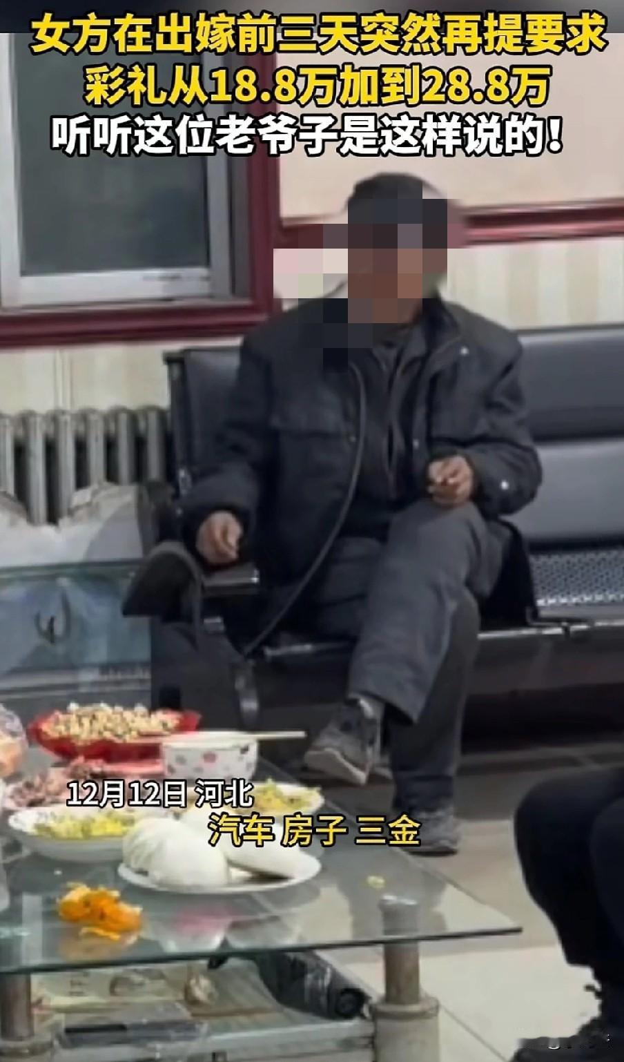 “大爷说的在理!”河北一女子出嫁前三天再变卦,彩礼从12.8到18.8再到28.8万,男方家人火速商议。大爷:汽车、楼房、三金全到位。临近婚期又变卦,钱可以给,但是人品要好好考量,结不结婚要慎重。如果你想结,东拼西凑再给28万。但若不愿意,即便定了婚期,照样给她退回去! 12月12日河北一网友发视频,全家长辈亲友都在商议结婚事宜,男孩显得不知所措,双手握着低着头不说话。 据说女方从一开始的12.8的彩礼,变到18.8现在还不到半年,又变到28.8万,让男方家人无法接受,于是坐在一起商议这笔钱该怎么办。 坐在沙发上的老人,忍不住出来说理。在农村就没有这么过日子的,说好的事情变了三卦,坐地起价太不厚道。钱可以给,但是这个姑娘的人品要好好考虑。 不能因为到了婚期,也通知了亲戚朋友,就赶鸭子上架,她提什么要求都满足,这样即便结了婚,以后的日子该咋过? 女方觉得都到了结婚这日子,又提出这要求。大爷劝小伙子好好想清楚,如果这样还想娶她,东拼西凑也给凑28万,但是如果不愿意,咱不怕丢人,照样给她退回去。 真的如果一开始就要30万,男方觉得彩礼太高不愿意,其实倒也无可厚非。而像这样一步步变卦,说好了又变,一步步挑战人家的底线,太不尊重男方,本来结婚是两家人变成为一家人,这样变卦感觉是在欺负人,还婚还不如不结!