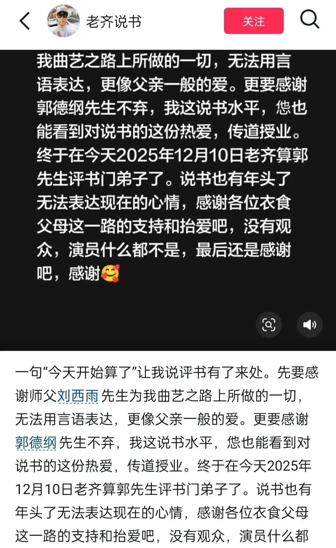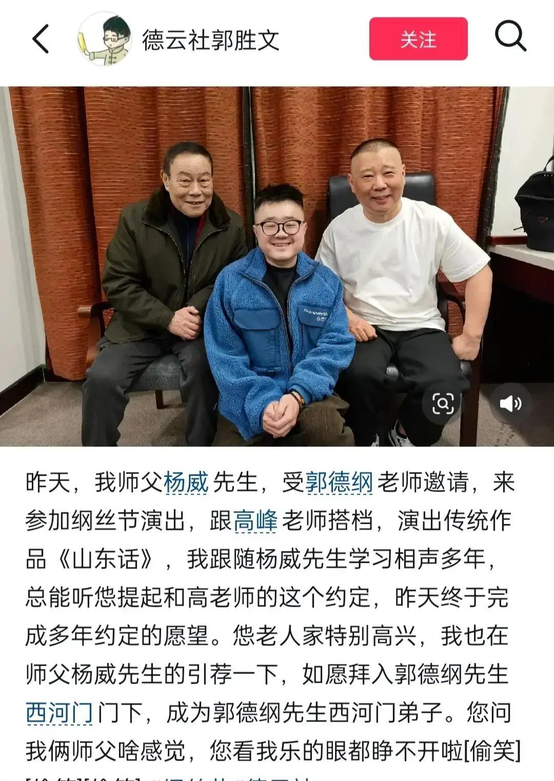 十年前曲艺界骂郭德纲“砸了行业饭碗”,今天他们挤破头把徒弟塞给德云社? 2025纲丝节后台,西河门杨威推着郭胜文说“交给您我放心”,评书门刘西雨拉着老齐鞠躬“根得扎这儿”——都是跨界前辈主动送徒。 十年前裘英俊想入社,原园子撂狠话:“去可以,但被郭德纲踹回来时,这儿没位置”——那时候谁都防着他的“商业化”。 可张鹤擎们用结果打脸:入社后商演从每年几场涨到月均5场,收入翻三倍。德云社给的不只是饭,是站着吃饭的舞台。 十年前怕他毁了规矩,十年后靠他救了徒弟——传承从来不是守着旧本子,而是让新芽在对的土壤里,长成能扛住风雨的树。