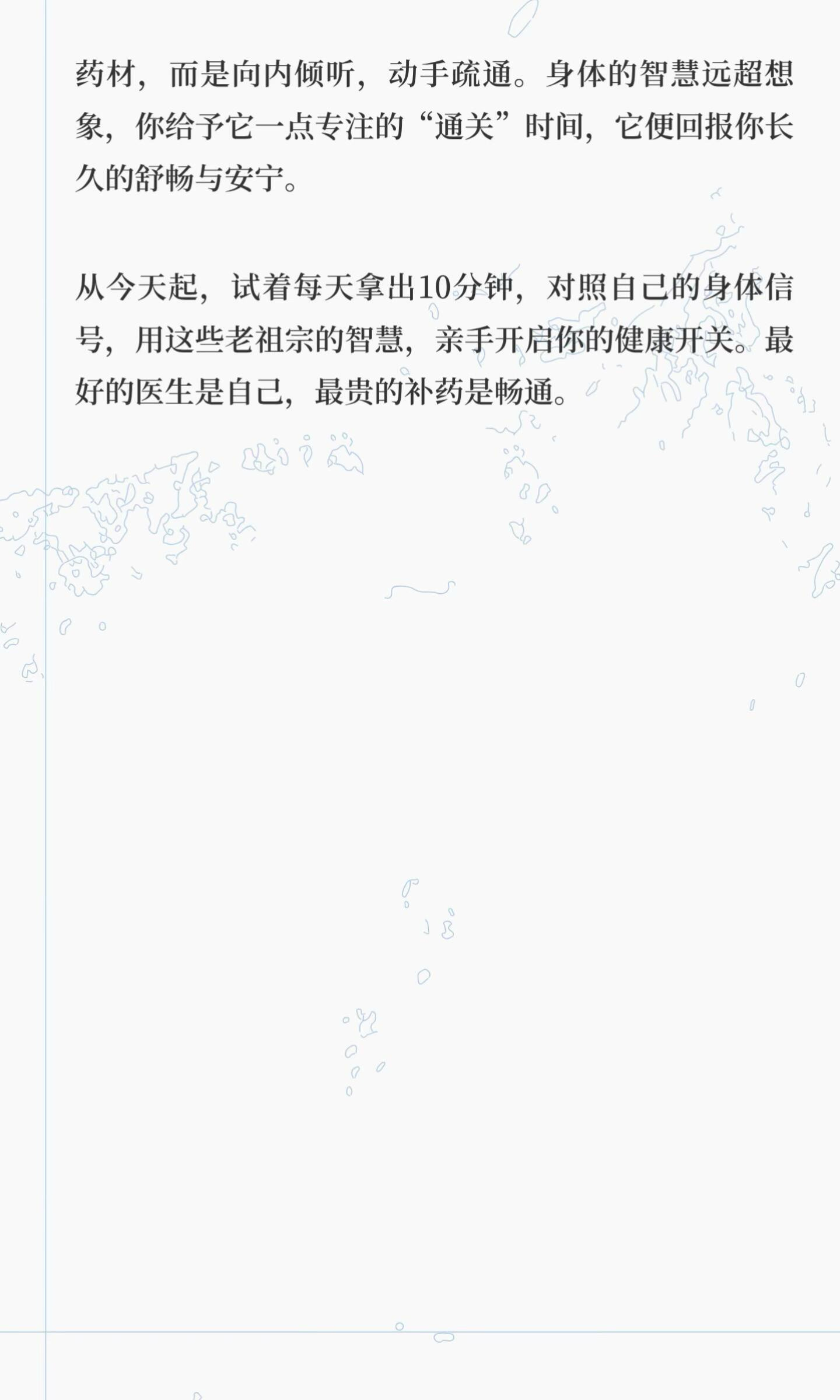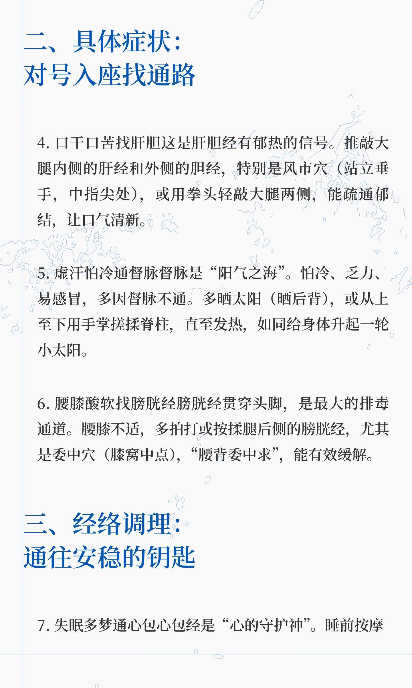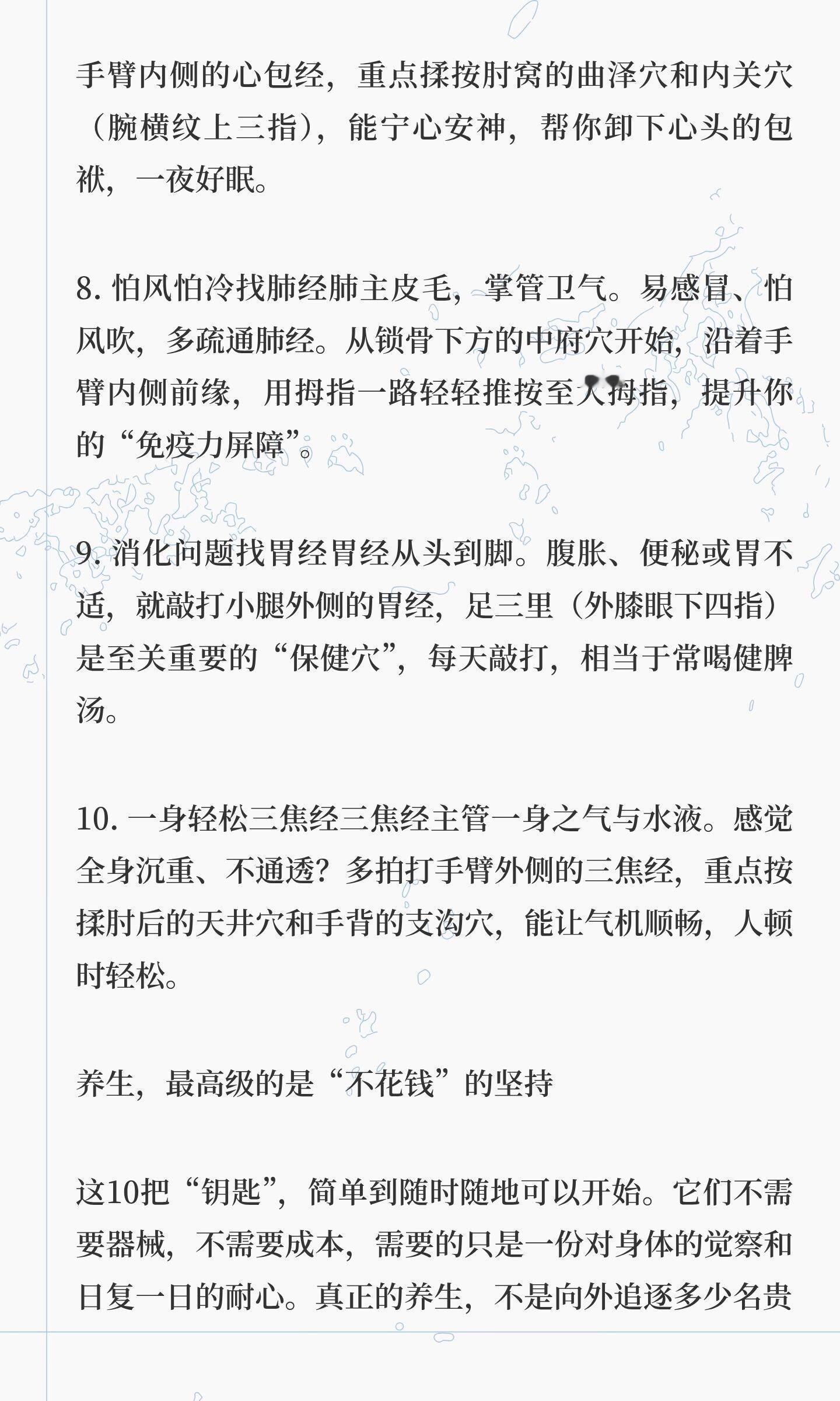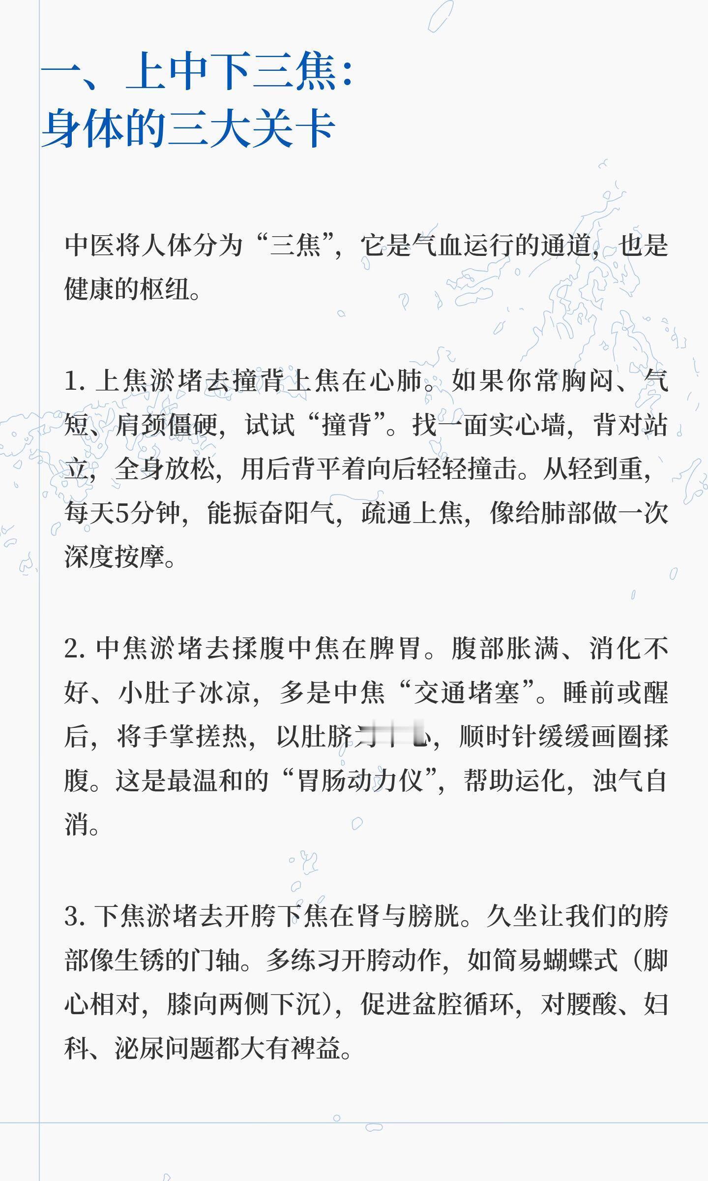 一分钱不花,打开身体淤堵的10把钥匙通过简单的身体动作,如撞背、揉腹、开胯,以及按摩特定穴位,如肝胆经、督脉、心包经等,可以有效疏通身体的“三焦”,改善肩颈僵硬、腰背酸痛、口干口苦等问题,提升整体健康状态。这些方法无需花钱,只需坚持即可带来长期的健康益处。养生日常中医养生健康养生