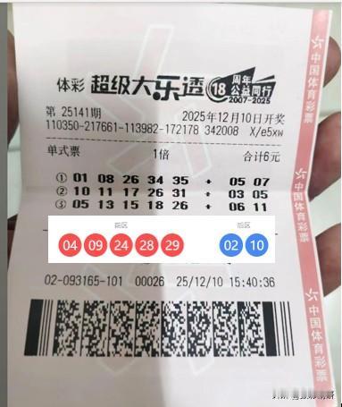 天菩萨,买了三注大乐透,整整21个号码居然一个都没撞上。 10日开出的大乐透25141奖号是:04,09,24,28,29+02,10。有福建彩友晒图吐槽,三注下来,前后区一共21个数字,竟无一命中。 这运气也是绝了——前区15个号好歹中一两个也算安慰,这下可真叫人哭笑不得。果然,运气来了只凭一注也能躺赢,运气不到,号码再多也枉然。