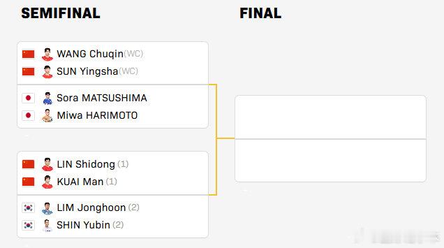 WTT香港总决赛混双四强对阵WTT香港总决赛混双四强对阵公布,王楚钦/孙颖莎vs日本组合松岛辉空/张本美和,林诗栋/蒯曼vs韩国组合林仲勋/申裕斌。王楚钦孙颖莎vs松岛辉空张本美和林诗栋蒯曼vs林仲勋申裕斌